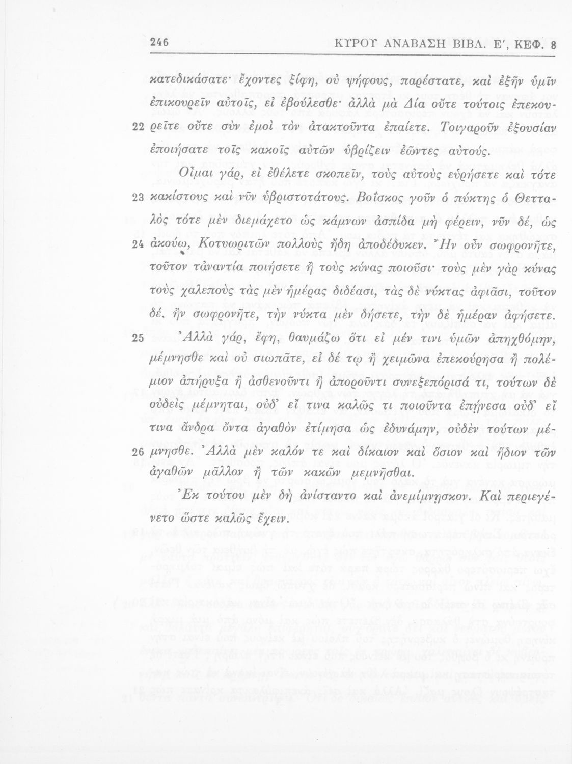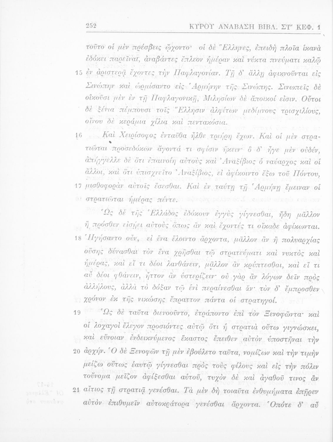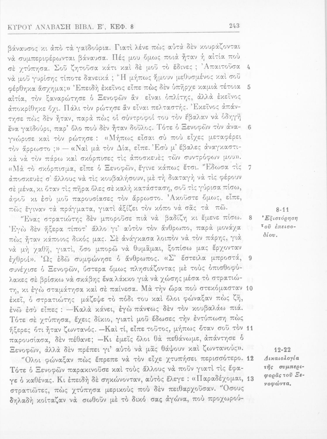 Σχολικό εγχειρίδιο της Γ' Ελληνικού Σχολείου και Αστικών Σχολείων για το μάθημα των Αρχαίων Ελληνικών. Το σύγγραμμα περιλαμβάνει κείμενα κατ΄ επιλογή από τα τέσσερα τελευταία βιβλία του έργου Κύρου Ανάβασις. ...