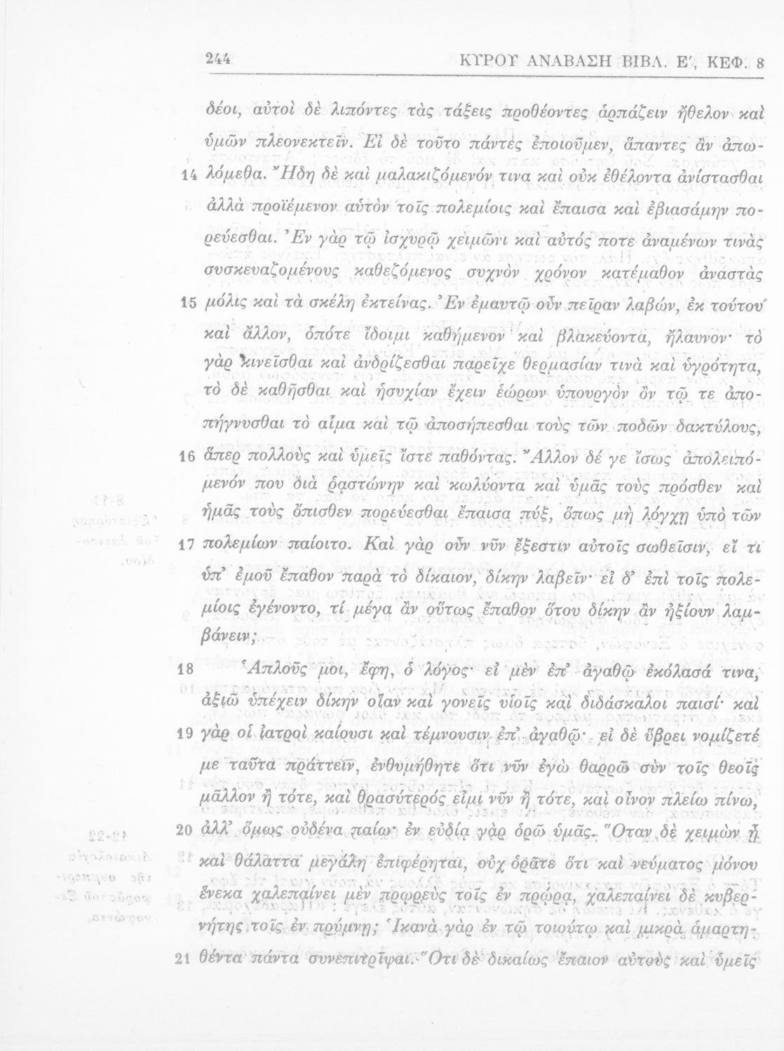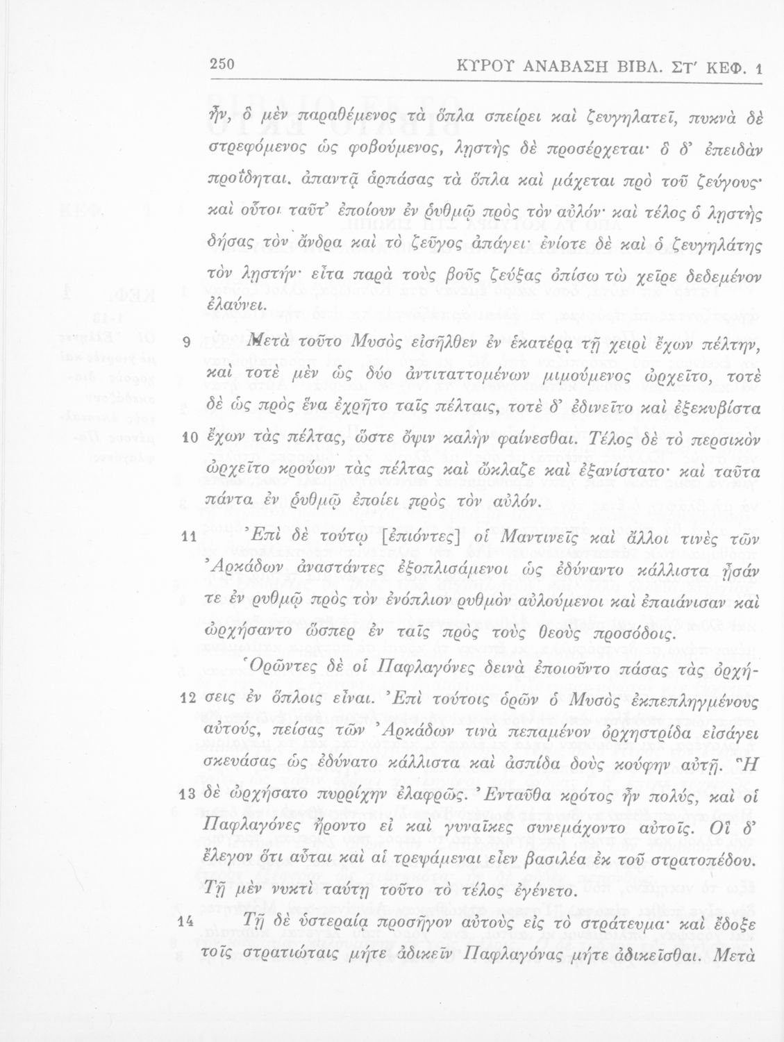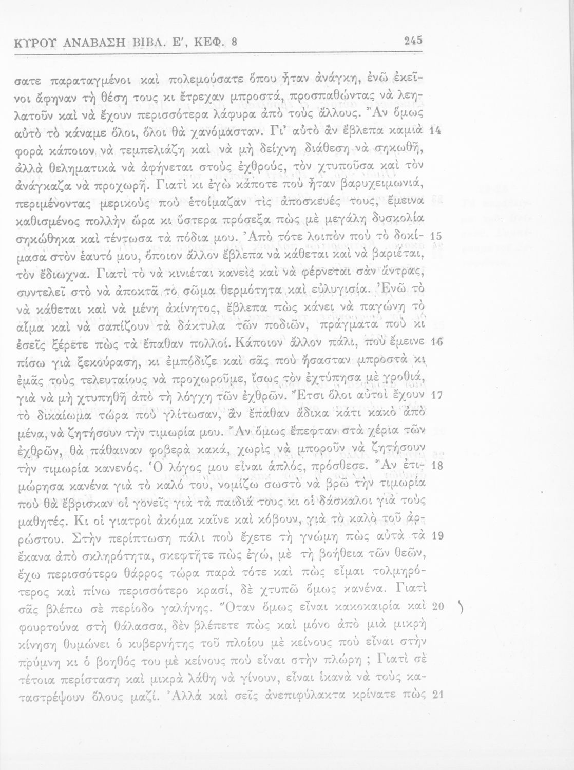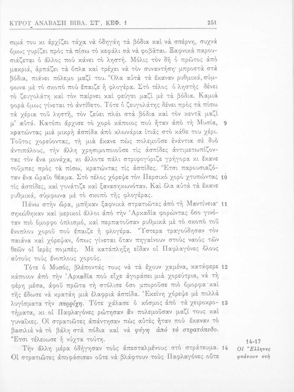 Σχολικό εγχειρίδιο της Γ' Ελληνικού Σχολείου και Αστικών Σχολείων για το μάθημα των Αρχαίων Ελληνικών. Το σύγγραμμα περιλαμβάνει κείμενα κατ΄ επιλογή από τα τέσσερα τελευταία βιβλία του έργου Κύρου Ανάβασις. ...