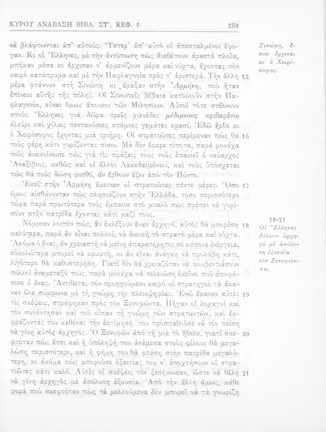 Σχολικό εγχειρίδιο Αρχαίων Ελληνικών α΄ Γυμνασίου που περιλαμβάνει μετάφραση του έργου του Ξενοφώντα Κύρου Ανάβασις, εισαγωγικά σχόλια για τη ζωή και το έργο του, και ερμηνευτικές παρατηρήσεις.