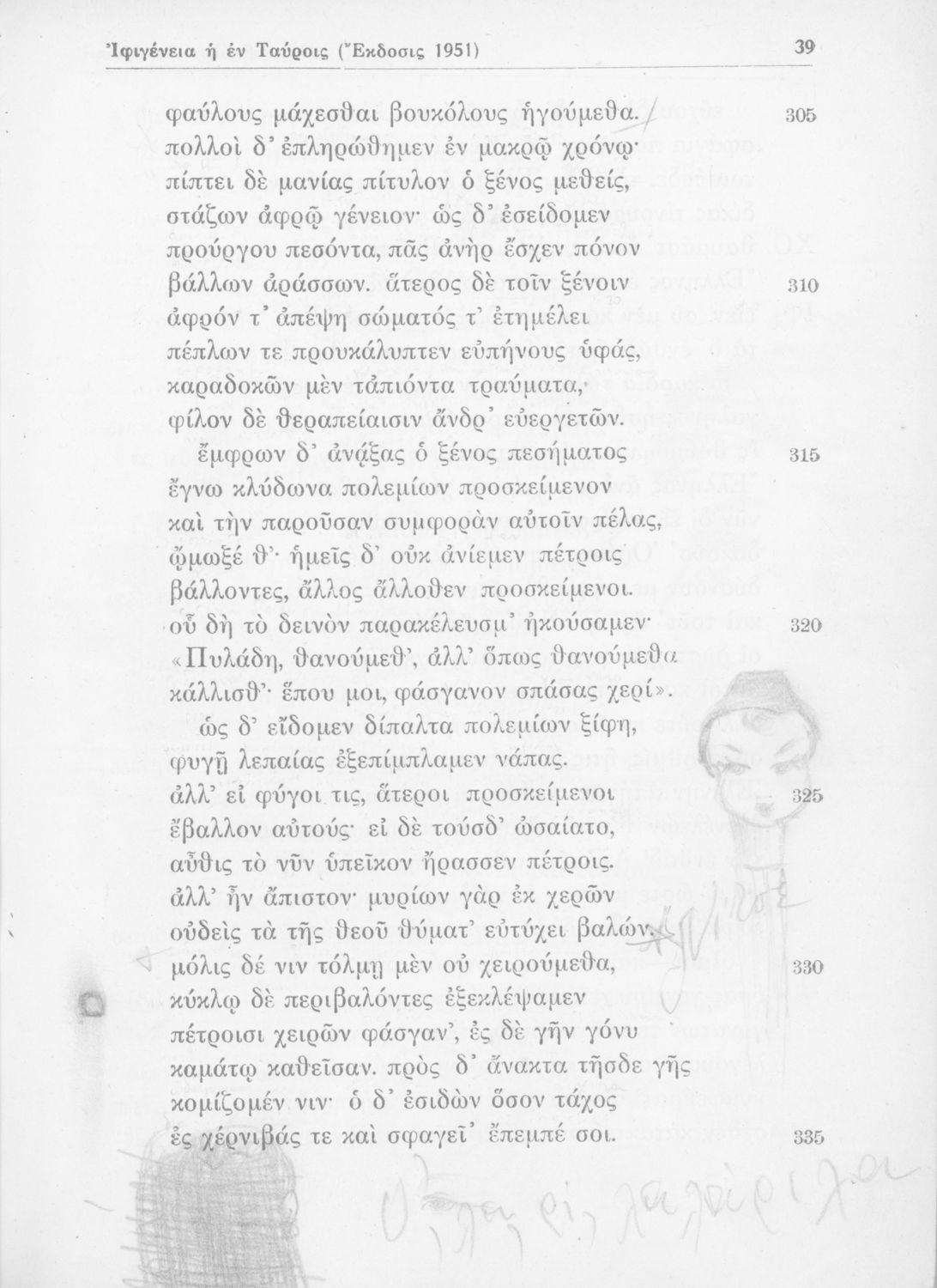 Σχολικό εγχειρίδιο Αρχαίων Ελληνικών Ε΄ Γυμνασίου που περιέχει αποσπάσματα από την τραγωδία του Ευριπίδη Ιφιγένεια η εν Ταύροις, ερμηνευτικά και πραγματολογικά σχόλια και λεξιλογικές παρατηρήσεις.