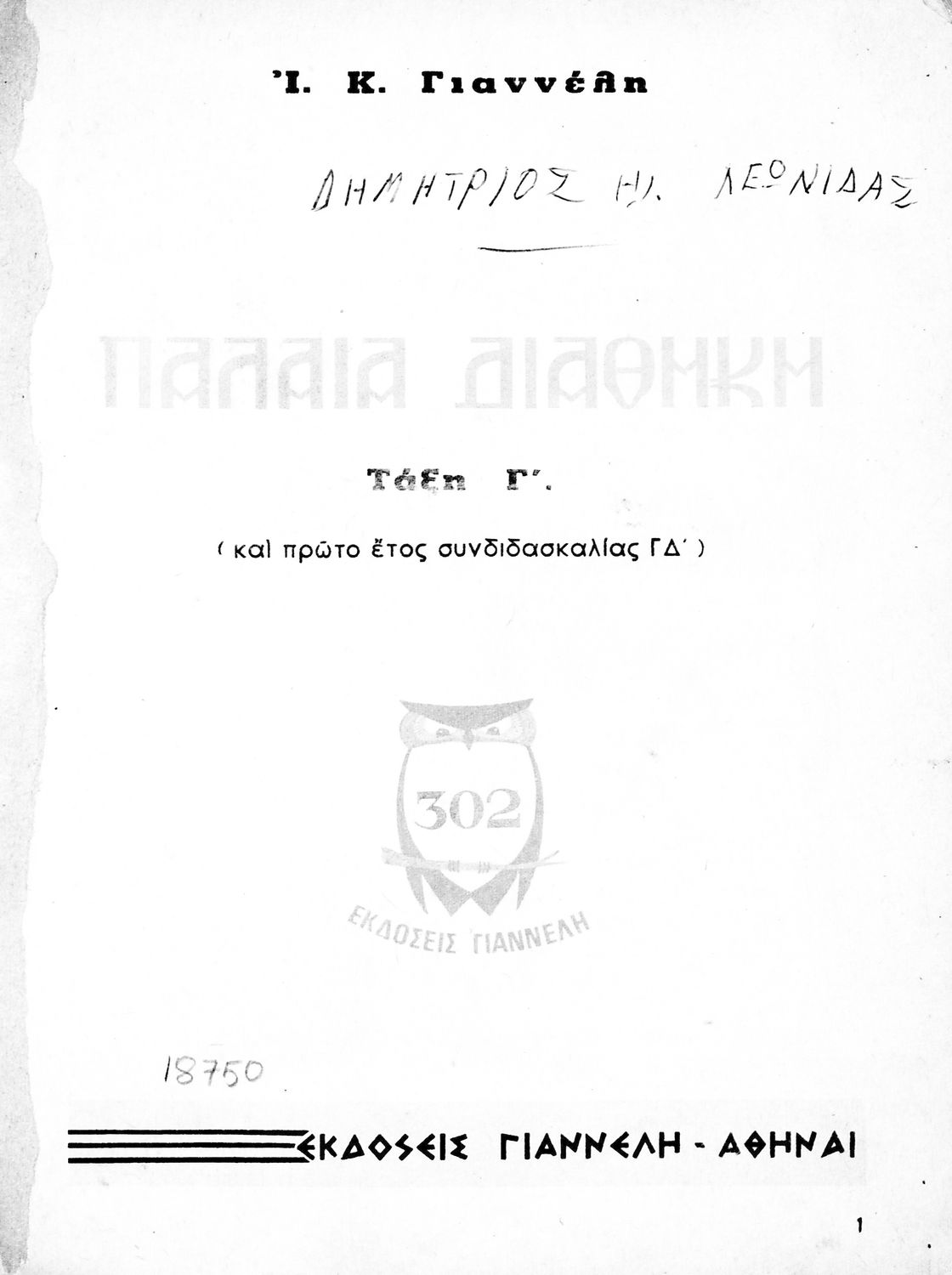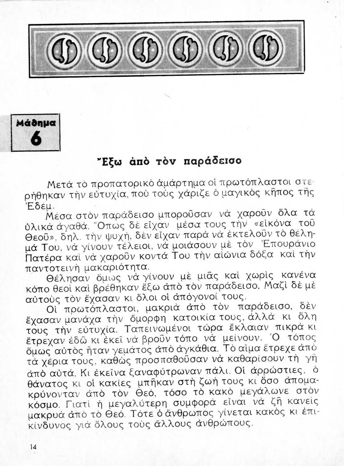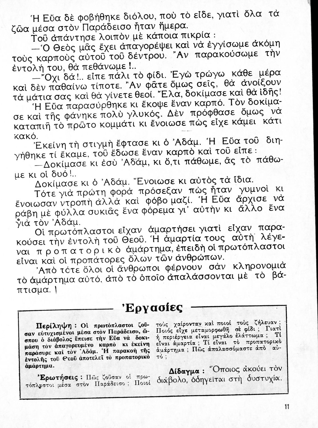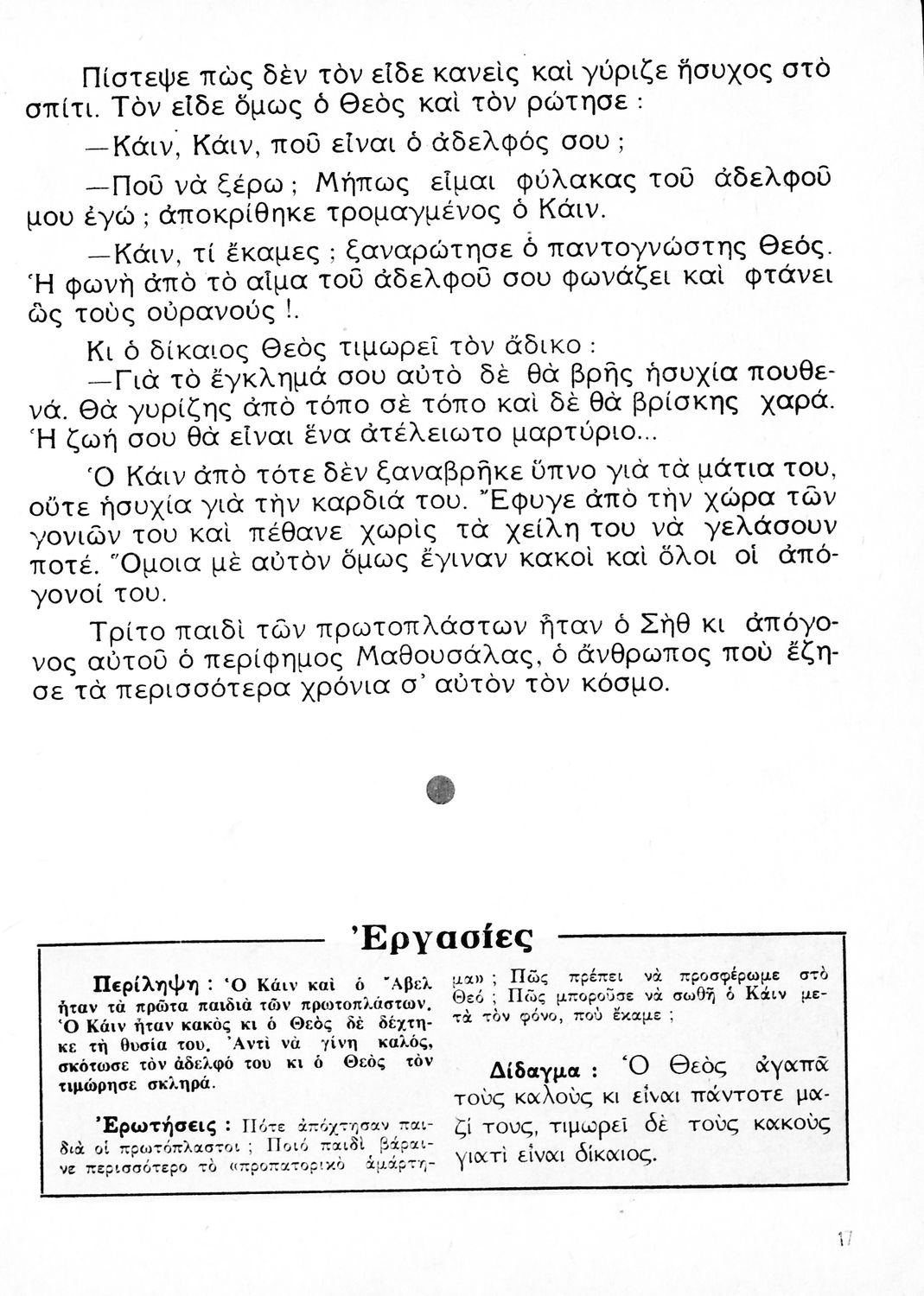 Σχολικό εγχειρίδιο Θρησκευτικών για τους μαθητές της Γ' Δημοτικού. Ενώ το βιβλίο αναφέρεται σε θέματα Παλαιάς Διαθήκης στο τέλος έχει γιορτές αγίων που έχουν σχέση με την ιστορία της Εκκλησίας.