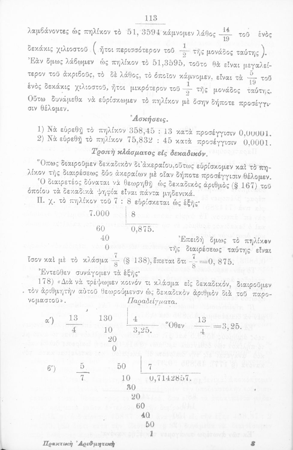 Σχολικό εγχειρίδιο Αριθμητικής για τα Ελληνικά σχολεία και Παρθεναγωγεία που περιέχει θεωρία και ασκήσεις.