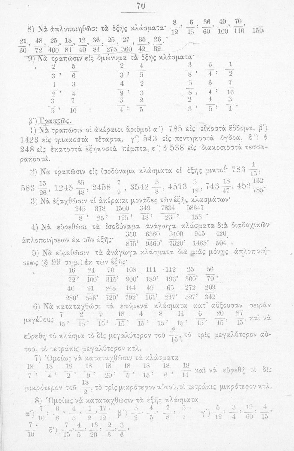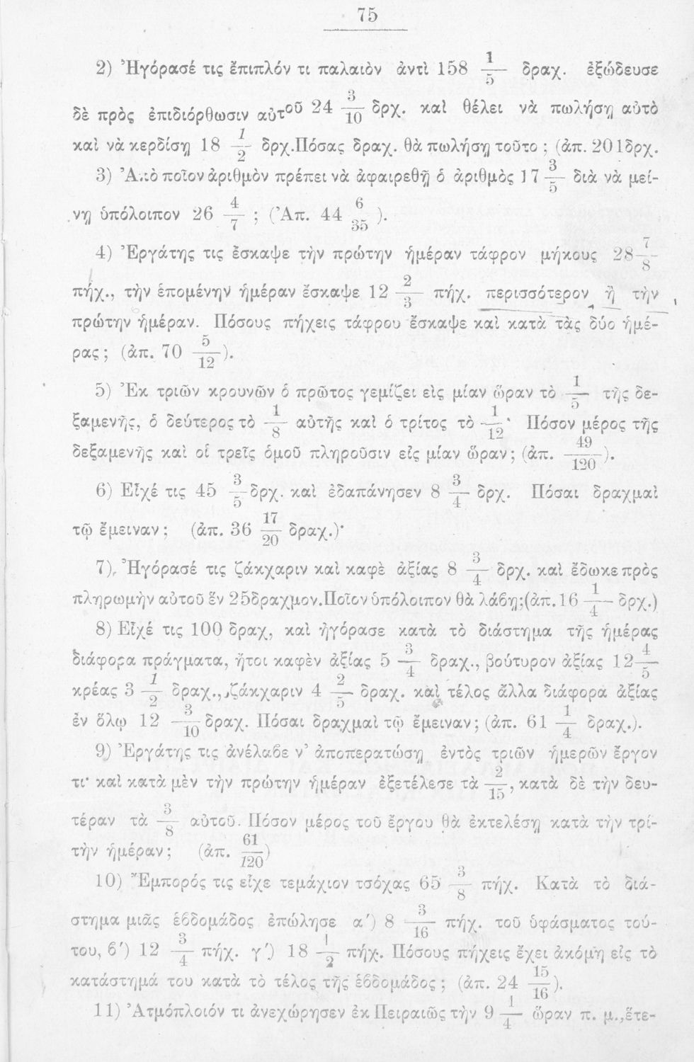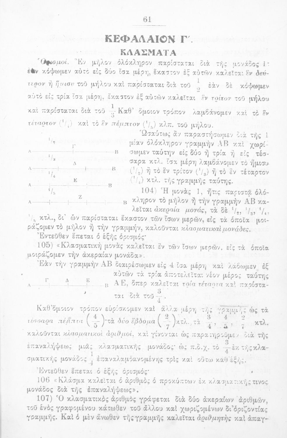 Σχολικό εγχειρίδιο Αριθμητικής για τα Ελληνικά και Αστικά Σχολεία και τα Παρθεναγωγεία που εστιάζει στις αριθμητικές πράξεις, τα κλάσματα, τους δεκαδικούς και συμμιγείς αριθμούς, και τις δυνάμεις. Περιέχει και