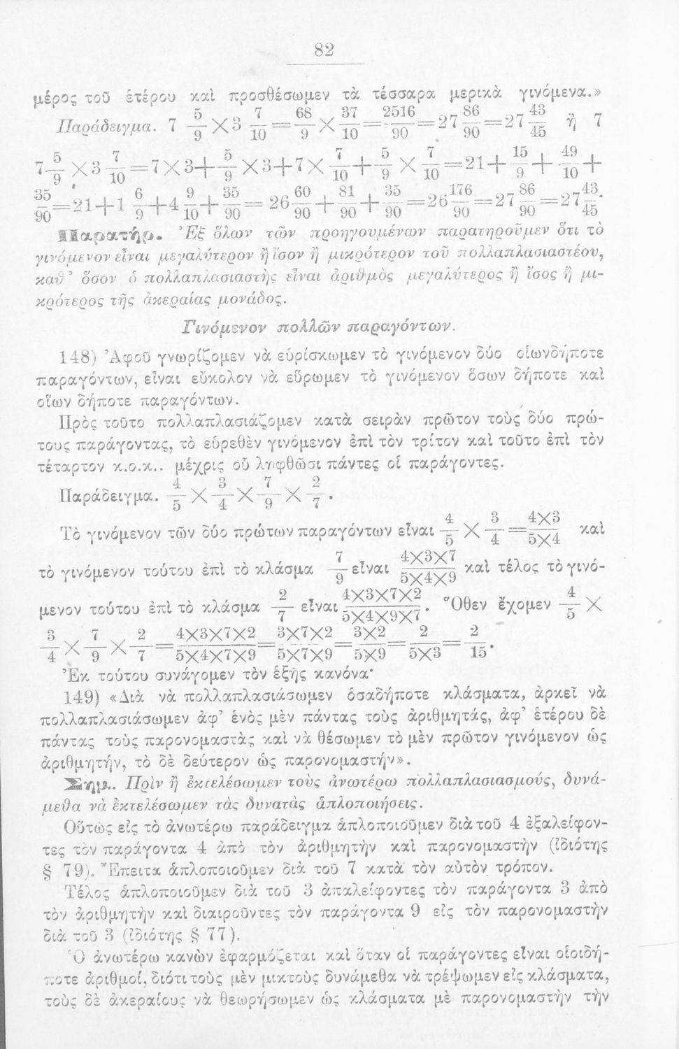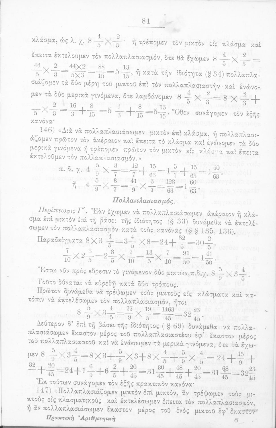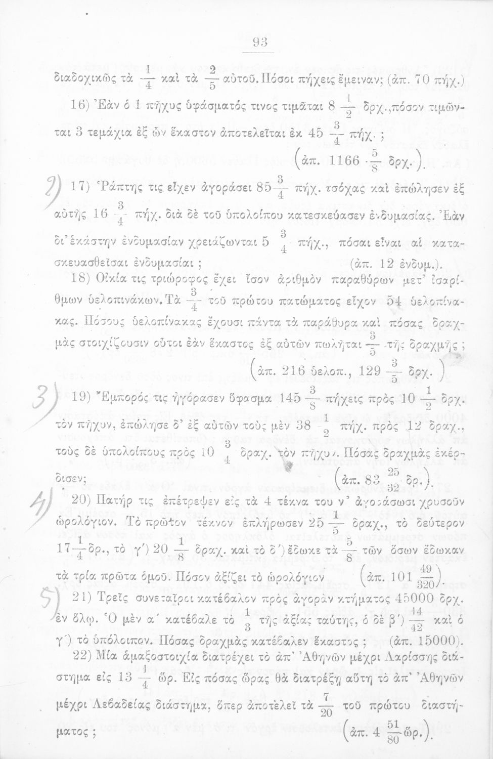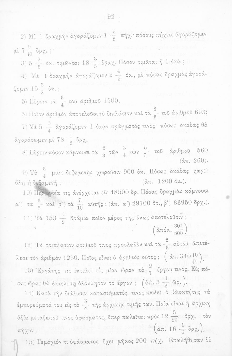 Σχολικό εγχειρίδιο Αριθμητικής για τα Ελληνικά και Αστικά Σχολεία και τα Παρθεναγωγεία που εστιάζει στις αριθμητικές πράξεις, τα κλάσματα, τους δεκαδικούς και συμμιγείς αριθμούς, και τις δυνάμεις. Περιέχει και