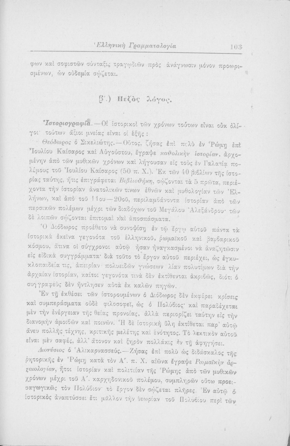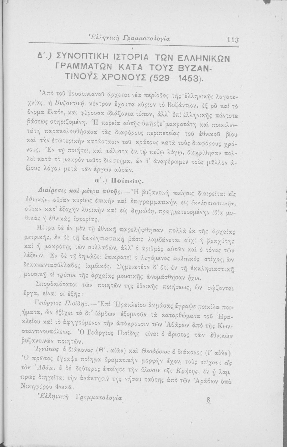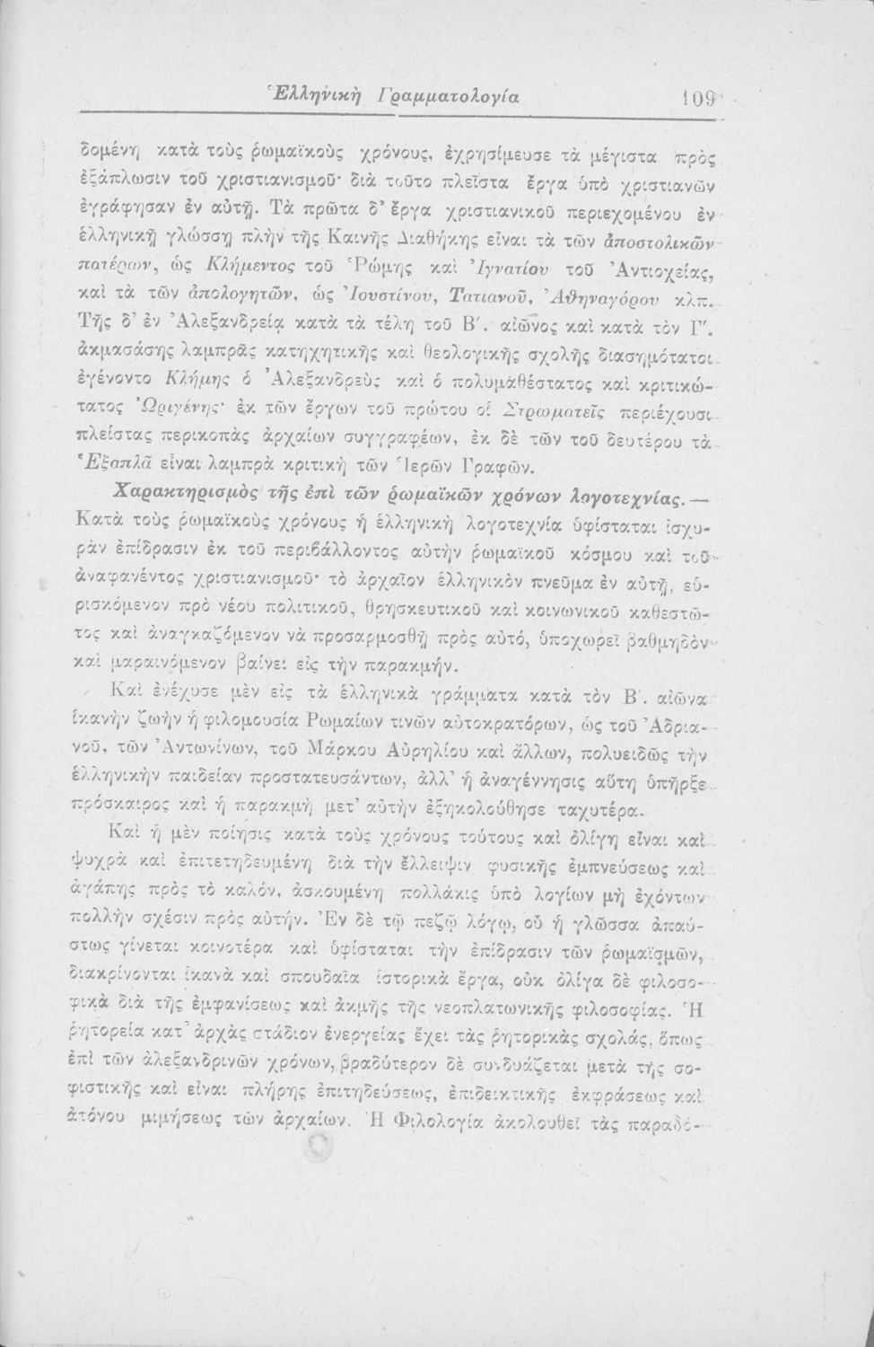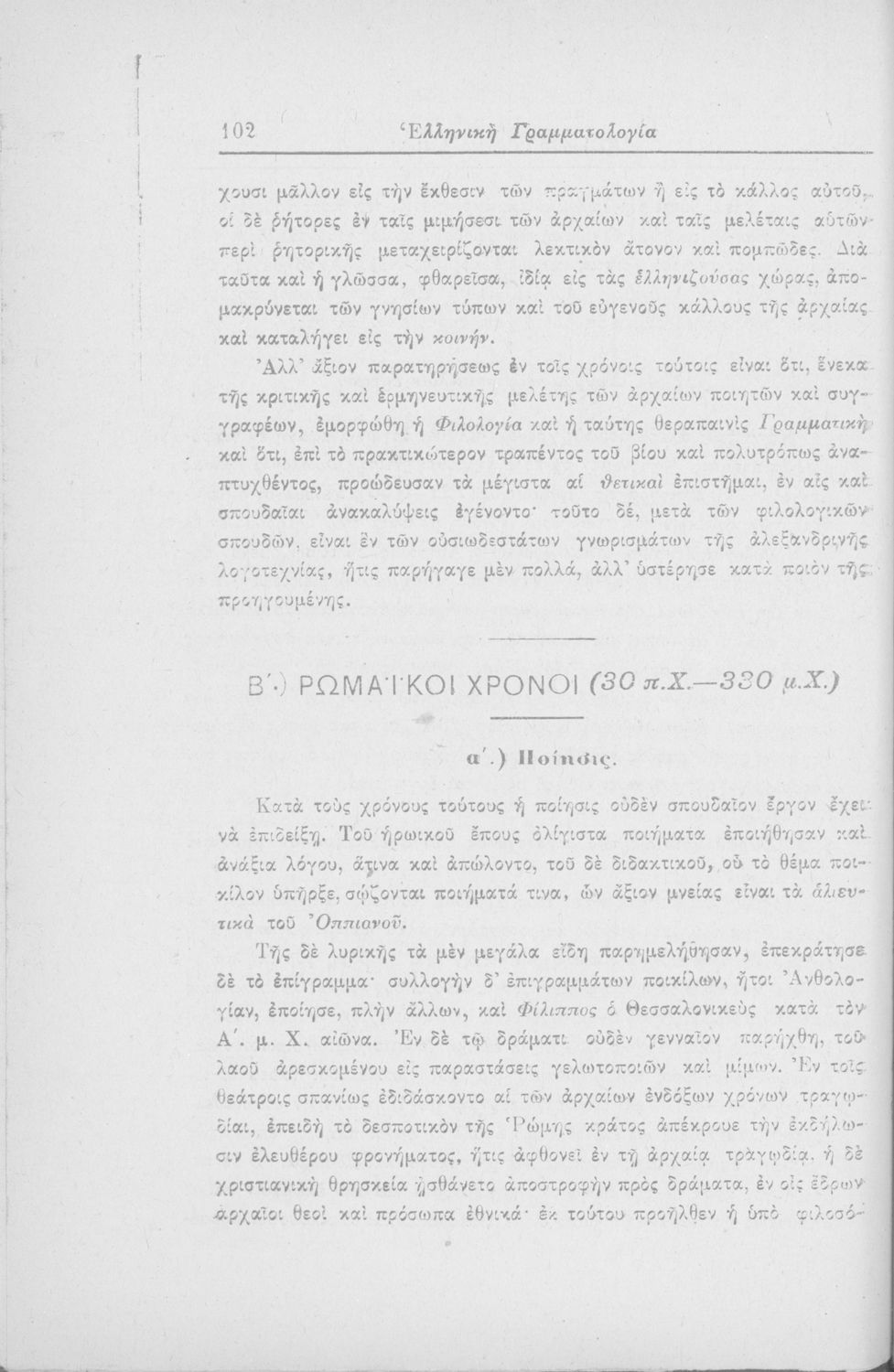 Βαθμίδα εκπαίδευσης: Δευτεροβάθμια Τάξη: Γυμνάσιο Μάθημα: Νέα Ελληνικά Γλώσσα: Καθαρεύουσα Παρουσίαση περιεχομένου: Σχολικό εγχειρίδιο Αρχαίων και Νέων Ελληνικών για το Γυμνάσιο που εξετάζει την εξέλιξη της ποίησης και του πεζού λόγου κατά την Αρχαϊκή, Κλασσική, Αλεξανδρινή και Ρωμαϊκή και Βυζαντινή περίοδο. |