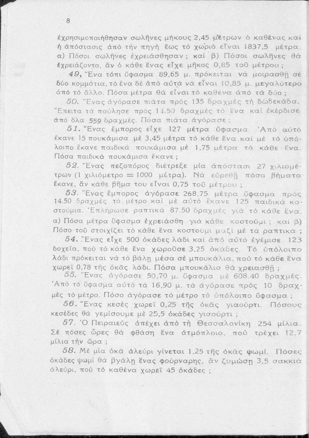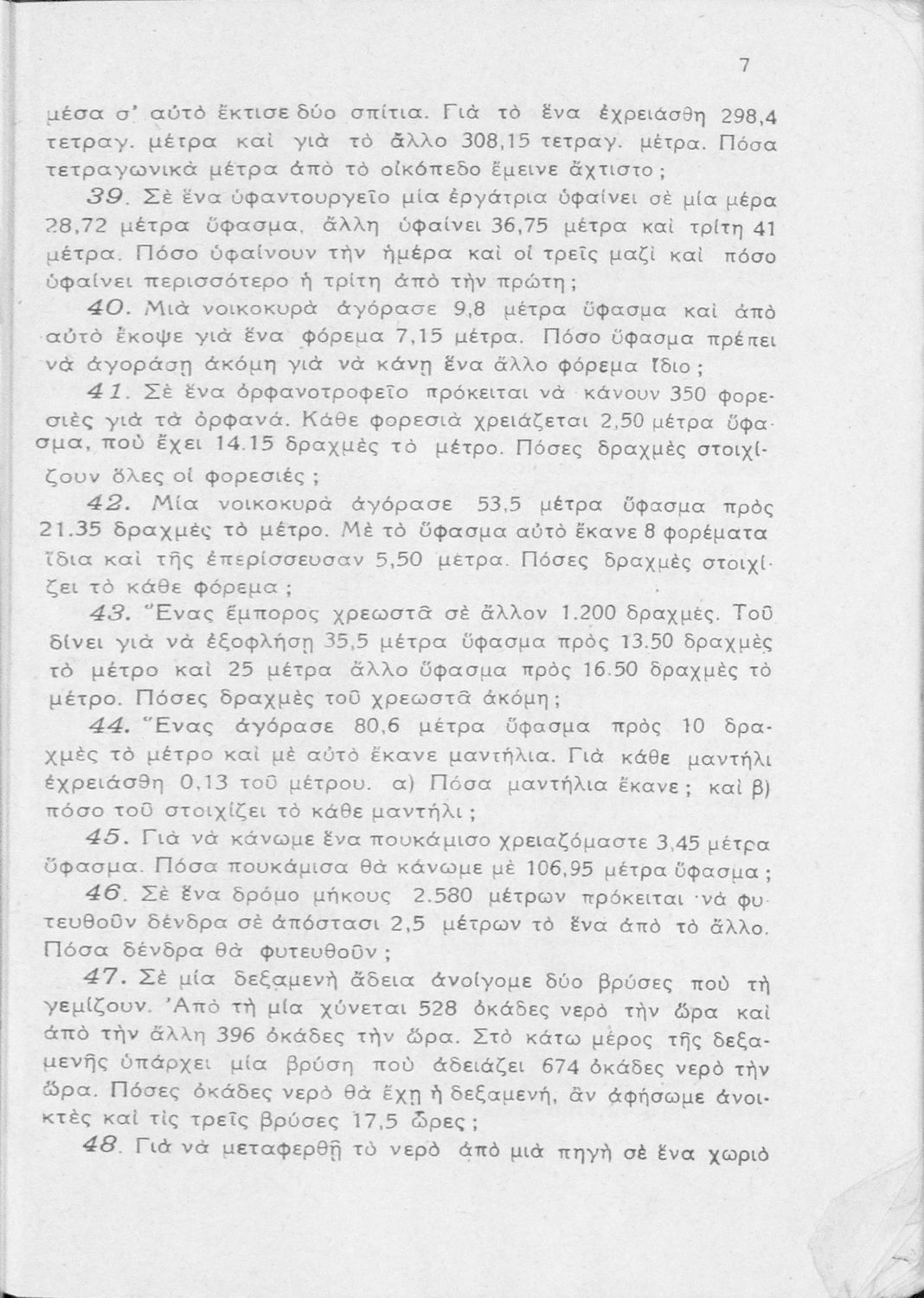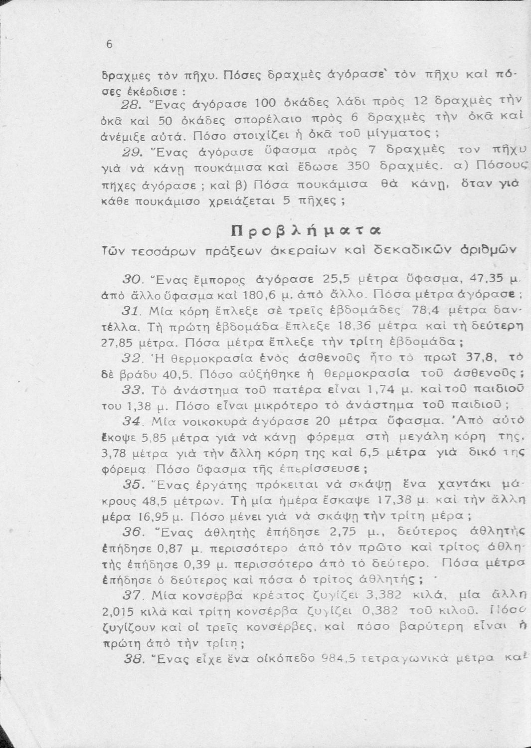 Σχολικό εγχειρίδιο Μαθηματικών ΣΤ΄ Δημοτικού που περιλαμβάνει ασκήσεις λογιστικού χαρακτήρα και ασκήσεις μέτρησης γεωμετρικών σχημάτων. Φέρει το σύμβολο της δικτατορίας.