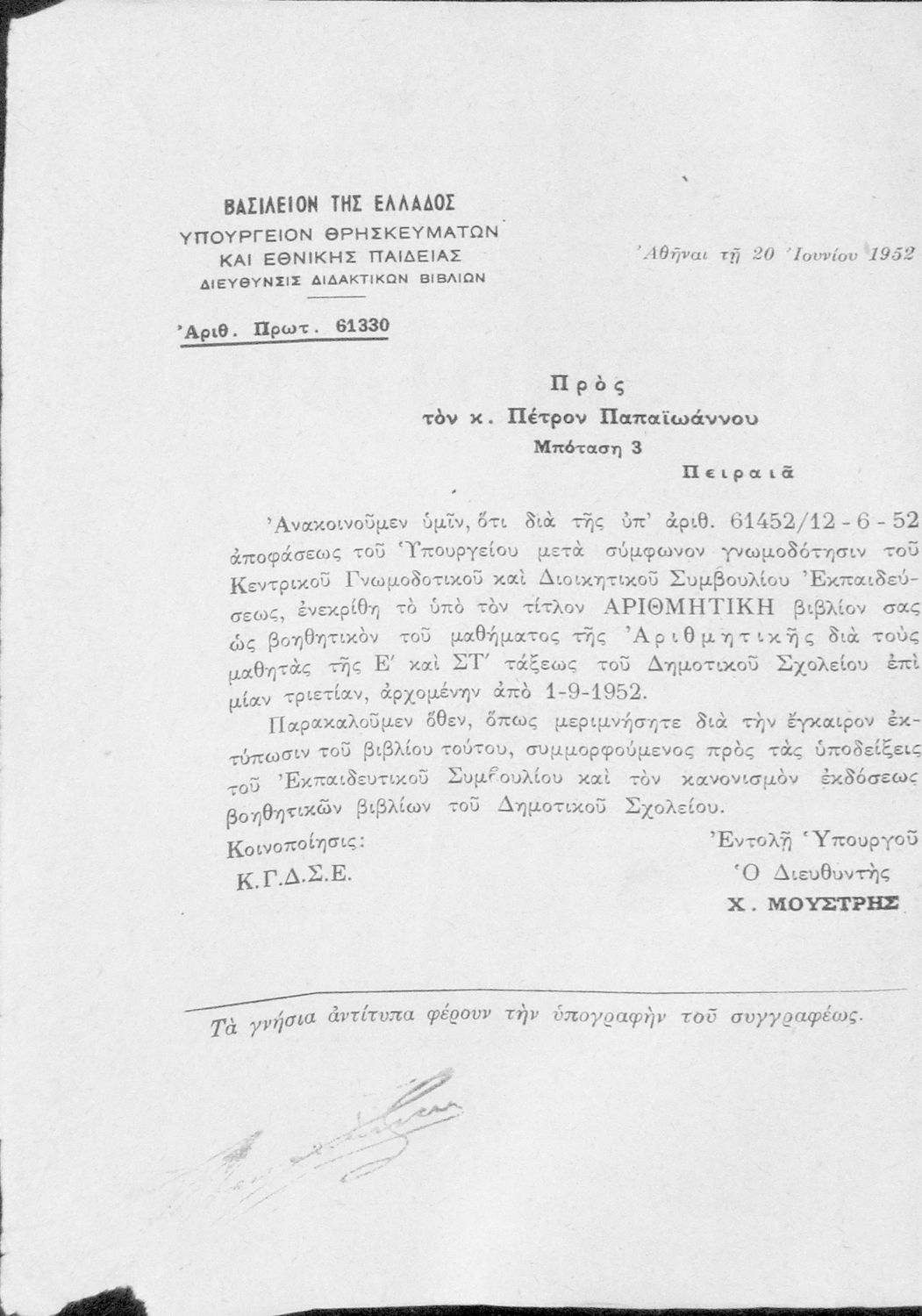 Υπουργική απόφαση / Σύμβαση: 61330/20-6-1952