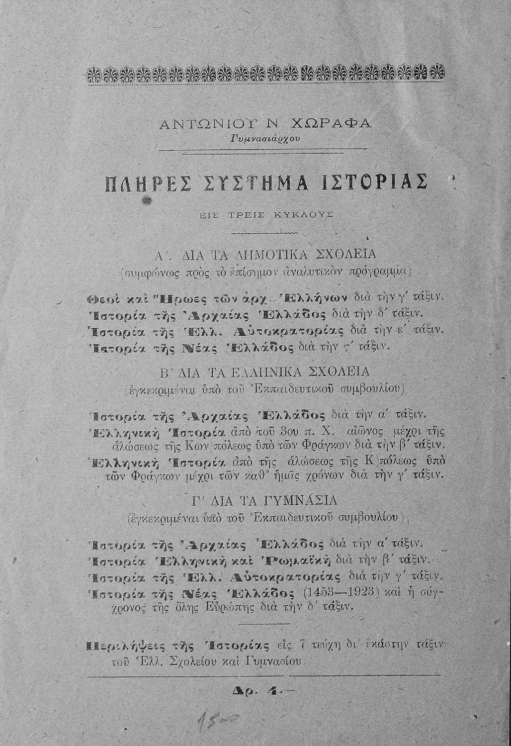 Κωδικός αναγνώρισης: 01-18762 Τίτλος: Περιλήψεις της Ιστορίας. Ιστορία Ελληνική και Ρωμαϊκή. Γυμνασίου Τάξις Δευτέρα Συγγραφέας: Αντώνιος Ν. Χωραφάς Μέγεθος και υπόστρωμα: Μαθητικό βοήθημα, 48 σελίδες. |