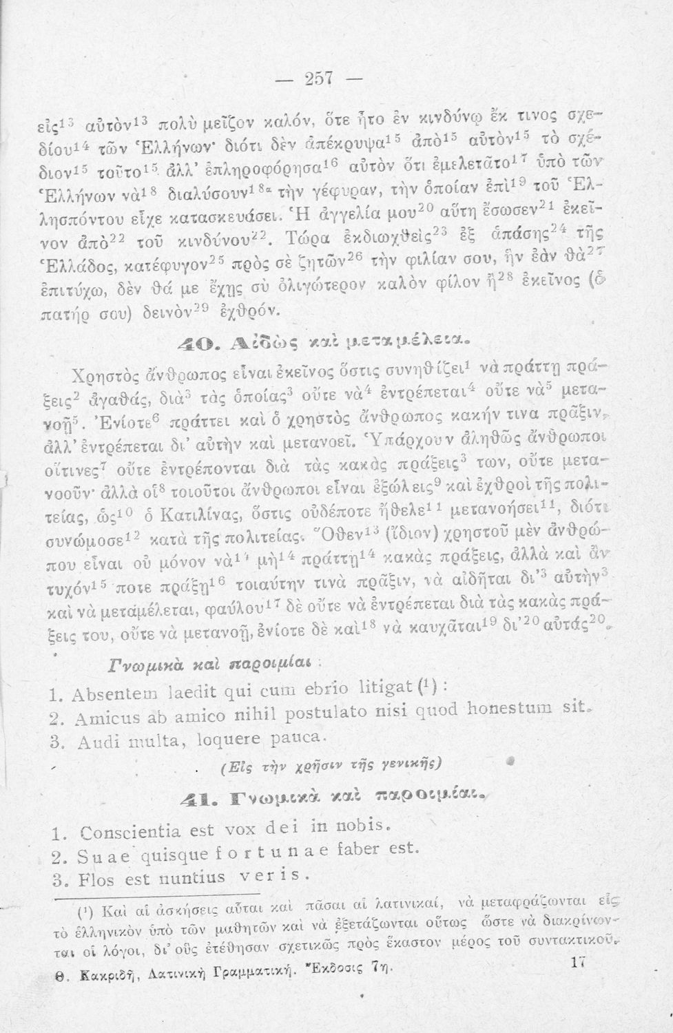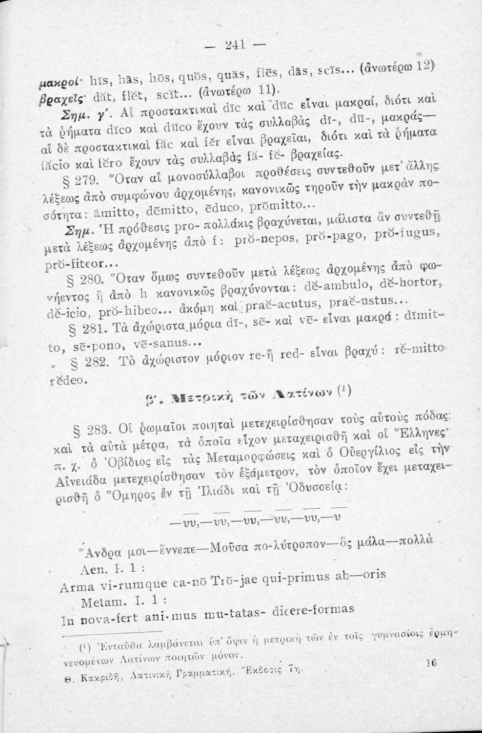 Σχολικό εγχειρίδιο Λατινικών Α΄, Β΄, Γ' Γυμνασίου που περιλαμβάνει γραμματική και συντακτικό και είναι χωρισμένο σε φθογγολογικό, τυπολογικό και ετυμολογικό μέρος.