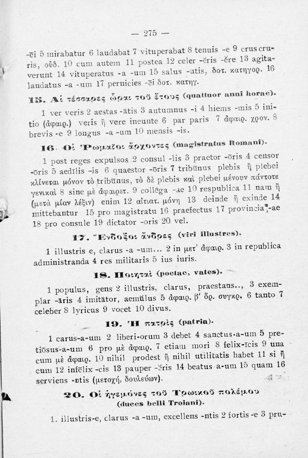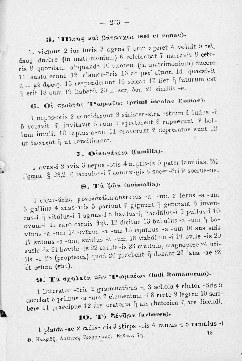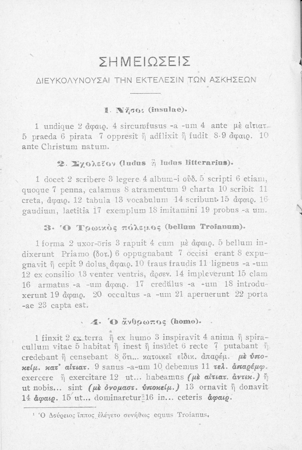 Σχολικό εγχειρίδιο Λατινικών Α΄, Β΄, Γ' Γυμνασίου που περιλαμβάνει γραμματική και συντακτικό και είναι χωρισμένο σε φθογγολογικό, τυπολογικό και ετυμολογικό μέρος.