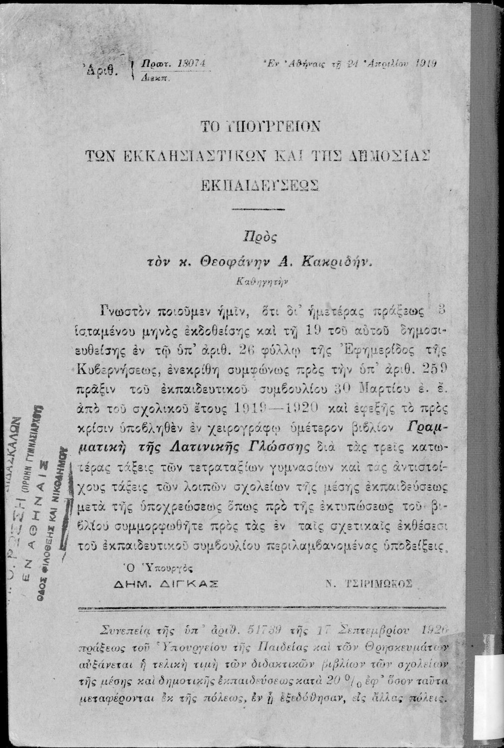 Τίτλος: Γραμματική της λατινικής γλώσσης προς χρήσιν της Α΄ Β΄ και Γ΄ τάξεως των Γυμνασίων