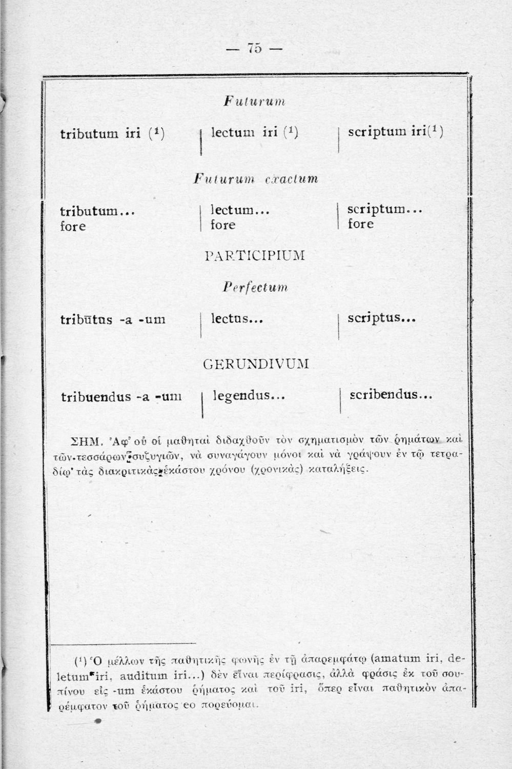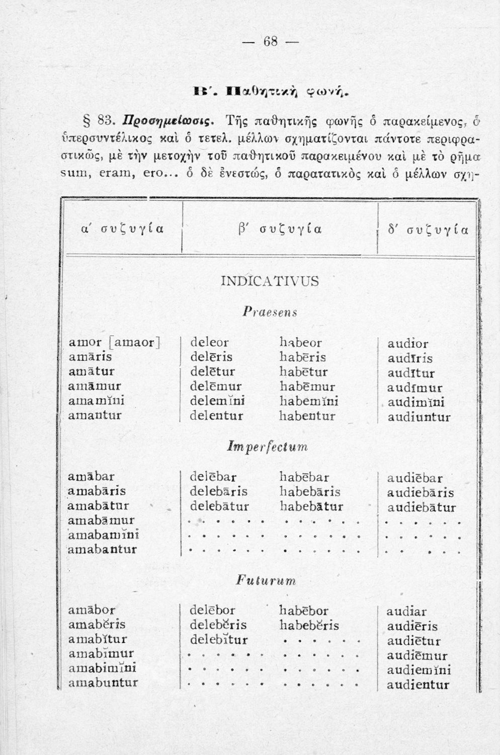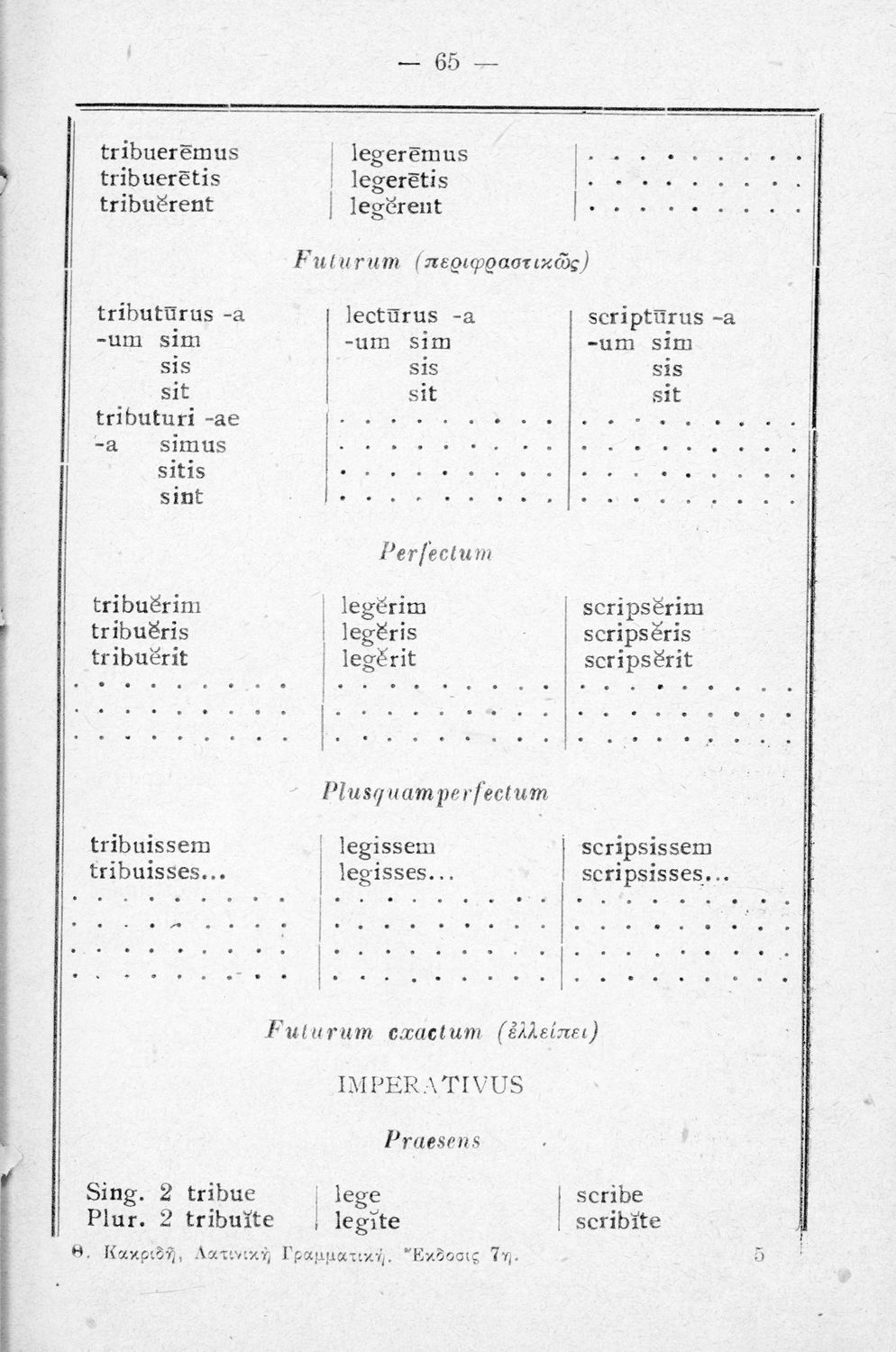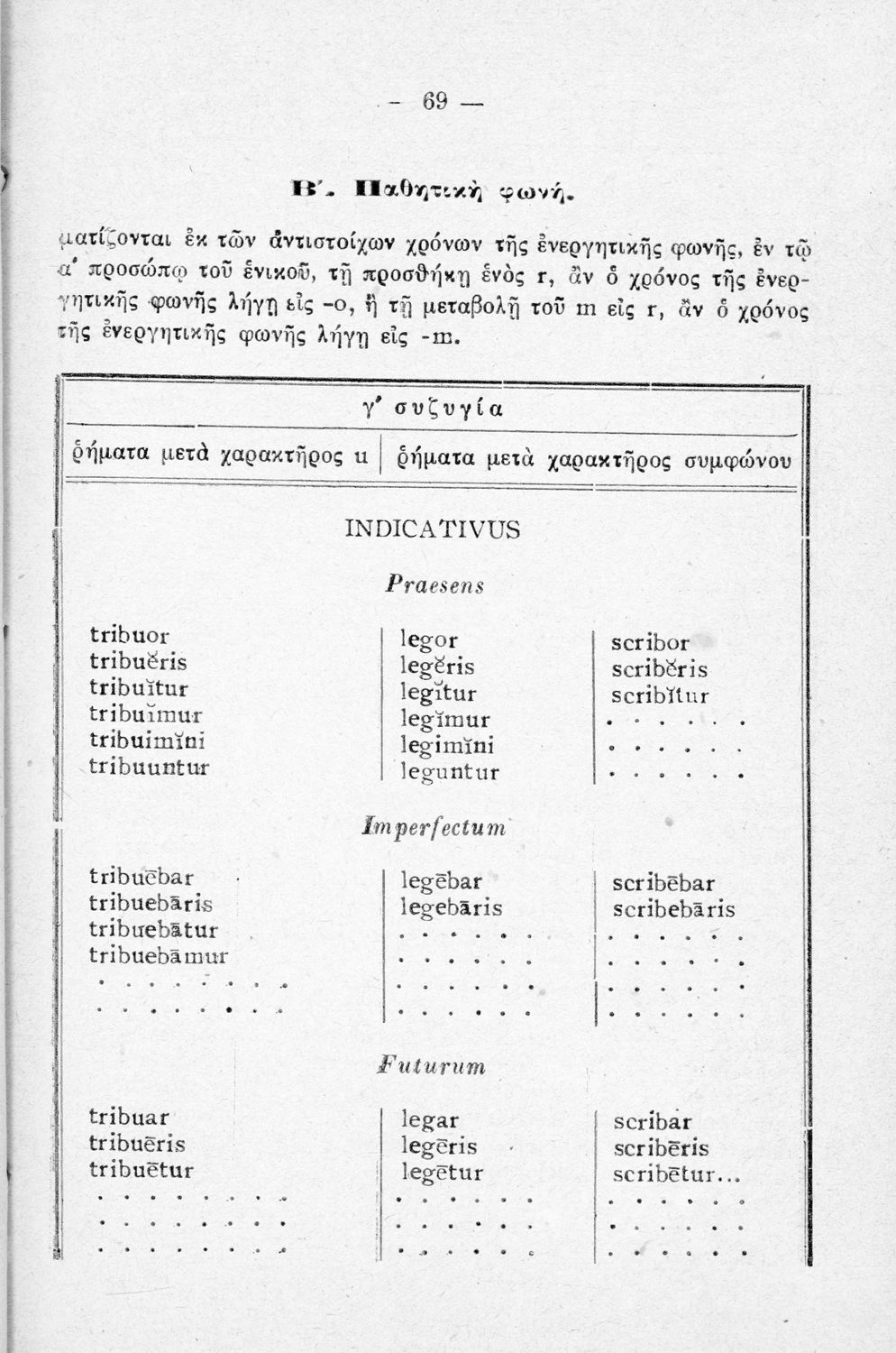 Σχολικό εγχειρίδιο Λατινικών Α΄, Β΄, Γ' Γυμνασίου που περιλαμβάνει γραμματική και συντακτικό και είναι χωρισμένο σε φθογγολογικό, τυπολογικό και ετυμολογικό μέρος.