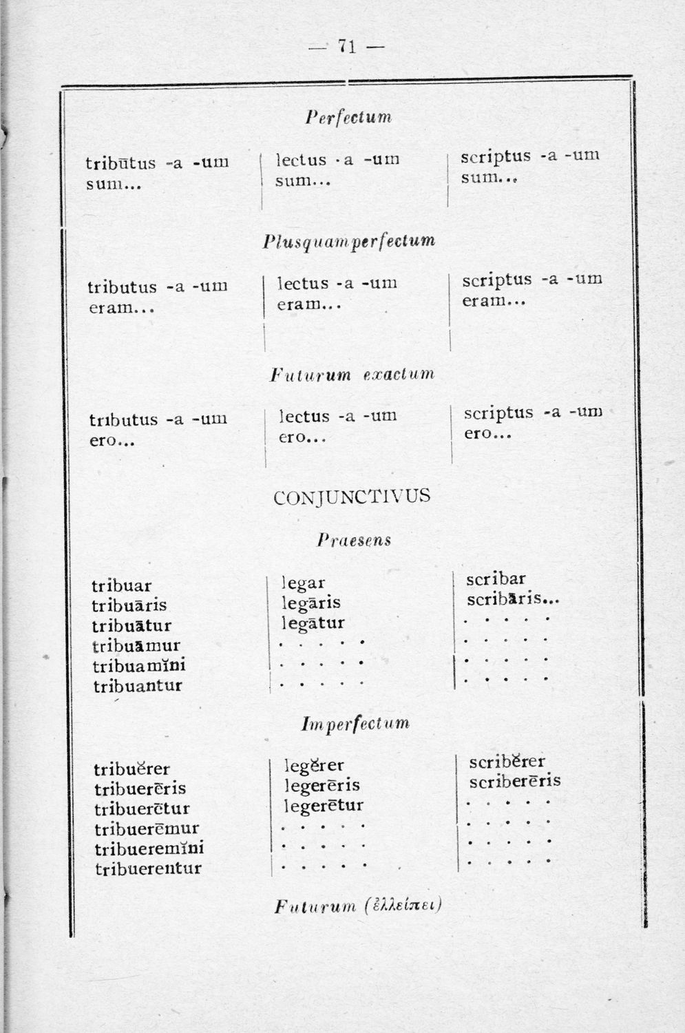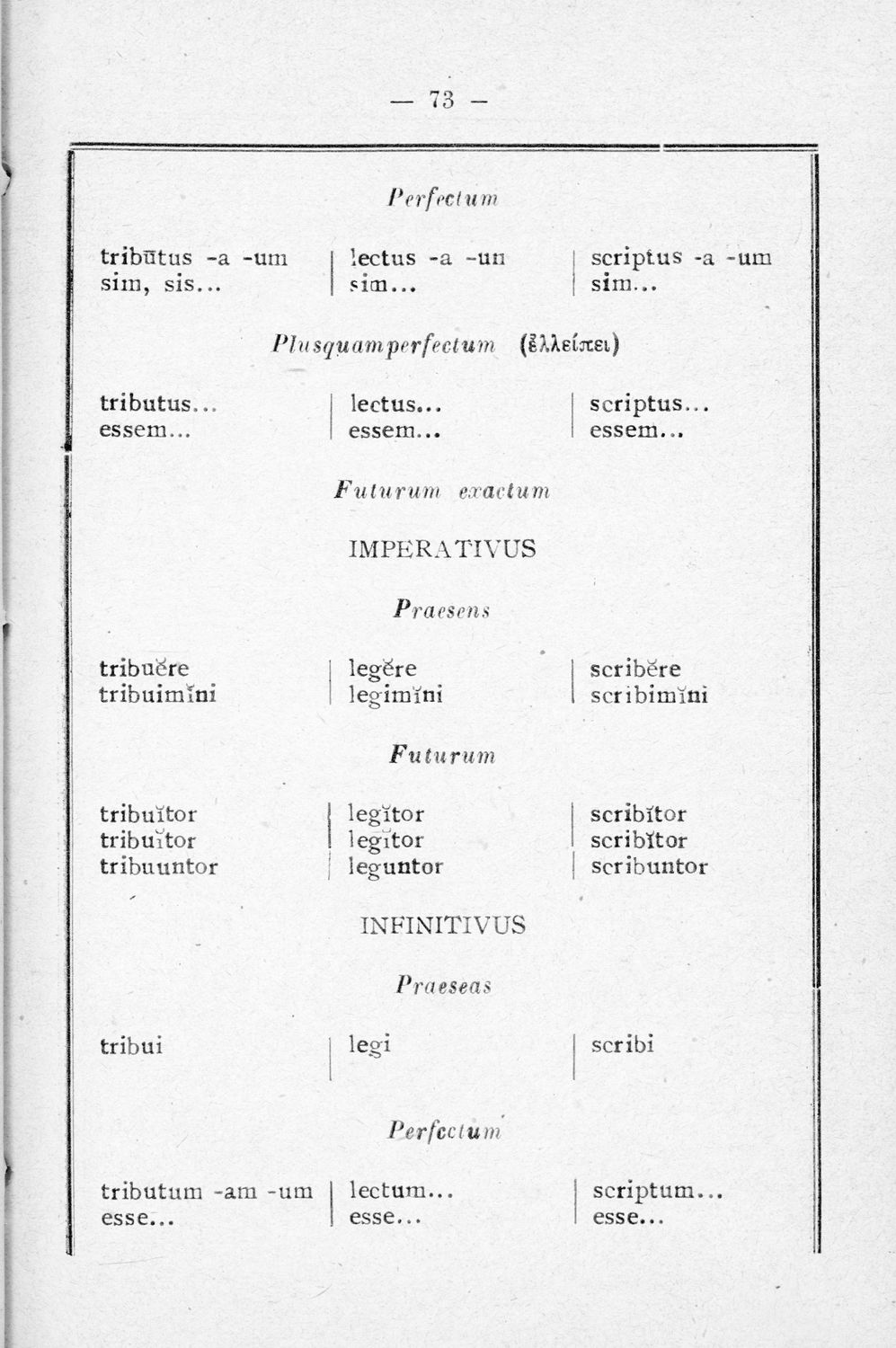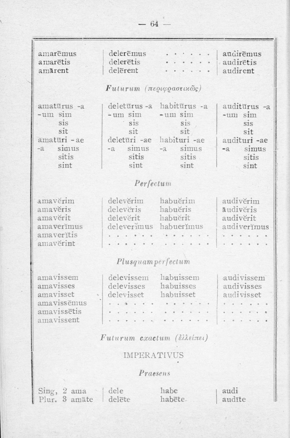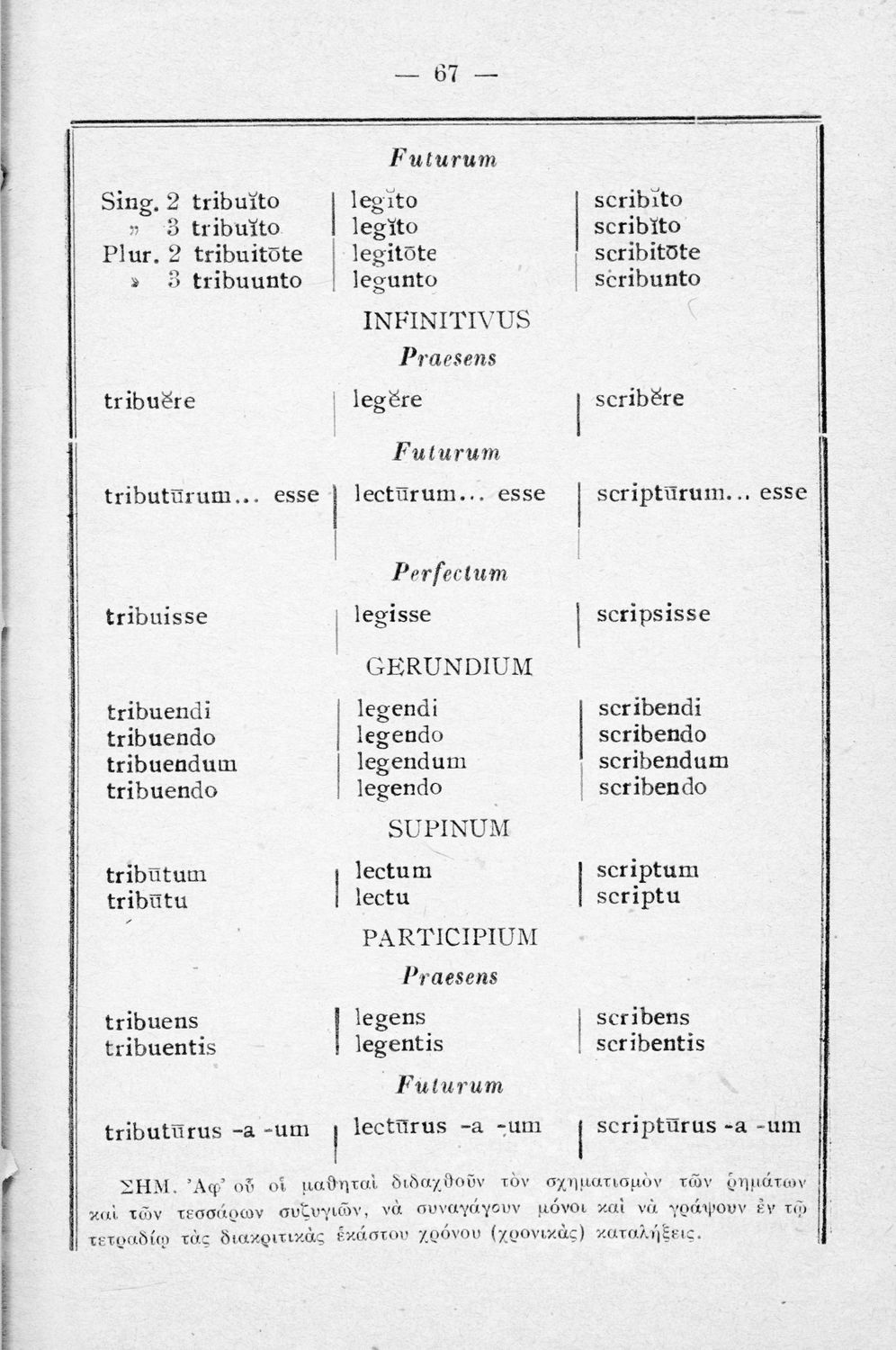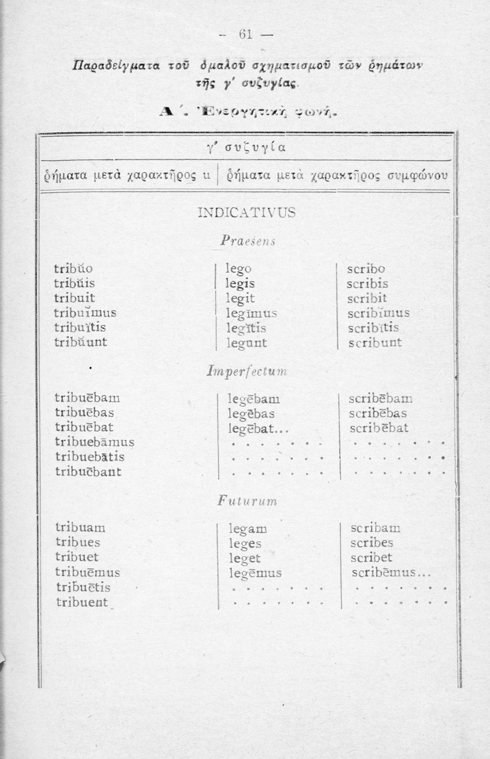 Σχολικό εγχειρίδιο Λατινικών Α΄, Β΄, Γ' Γυμνασίου που περιλαμβάνει γραμματική και συντακτικό και είναι χωρισμένο σε φθογγολογικό, τυπολογικό και ετυμολογικό μέρος.