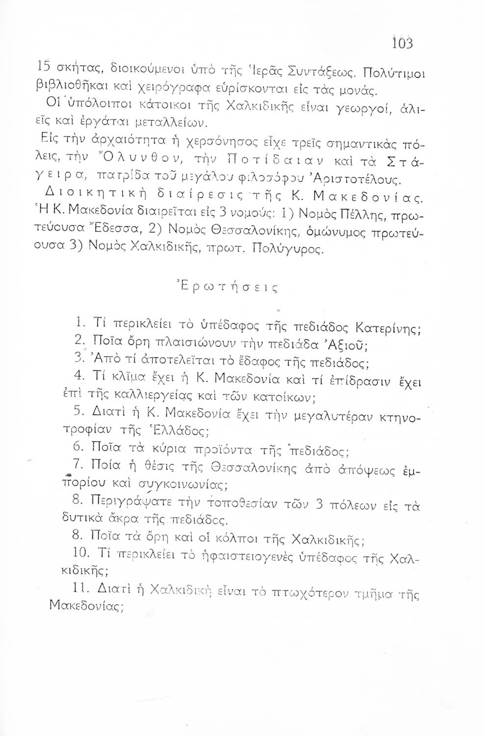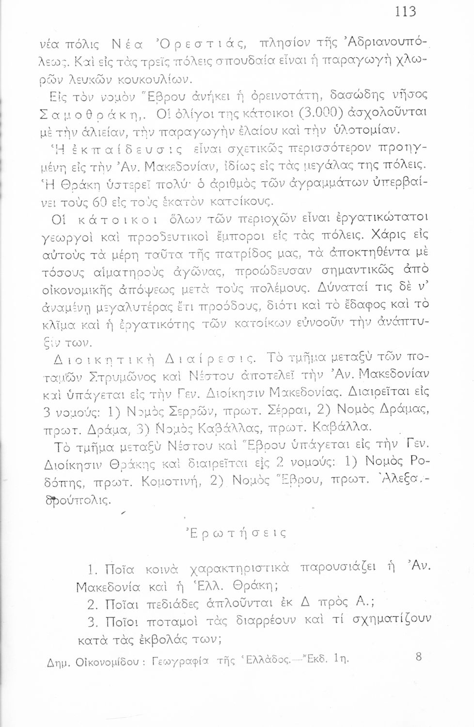 Κωδικός αναγνώρισης: 01-18768 Τίτλος: Γεωγραφία της Ελλάδος Δια την Α΄ τάξιν των Γυμνασίων Συγγραφέας: Δημ. Οικονομίδης Μέγεθος και υπόστρωμα: Σχολικό εγχειρίδιο, 221 σελίδες. Εικόνες (ασπρόμαυρες), χάρτες (ασπρόμαυροι). |
