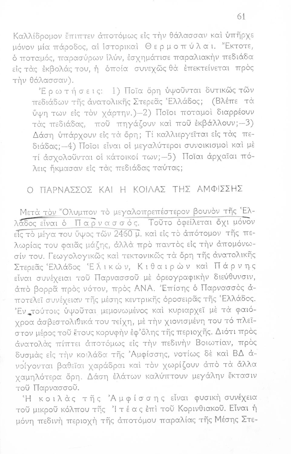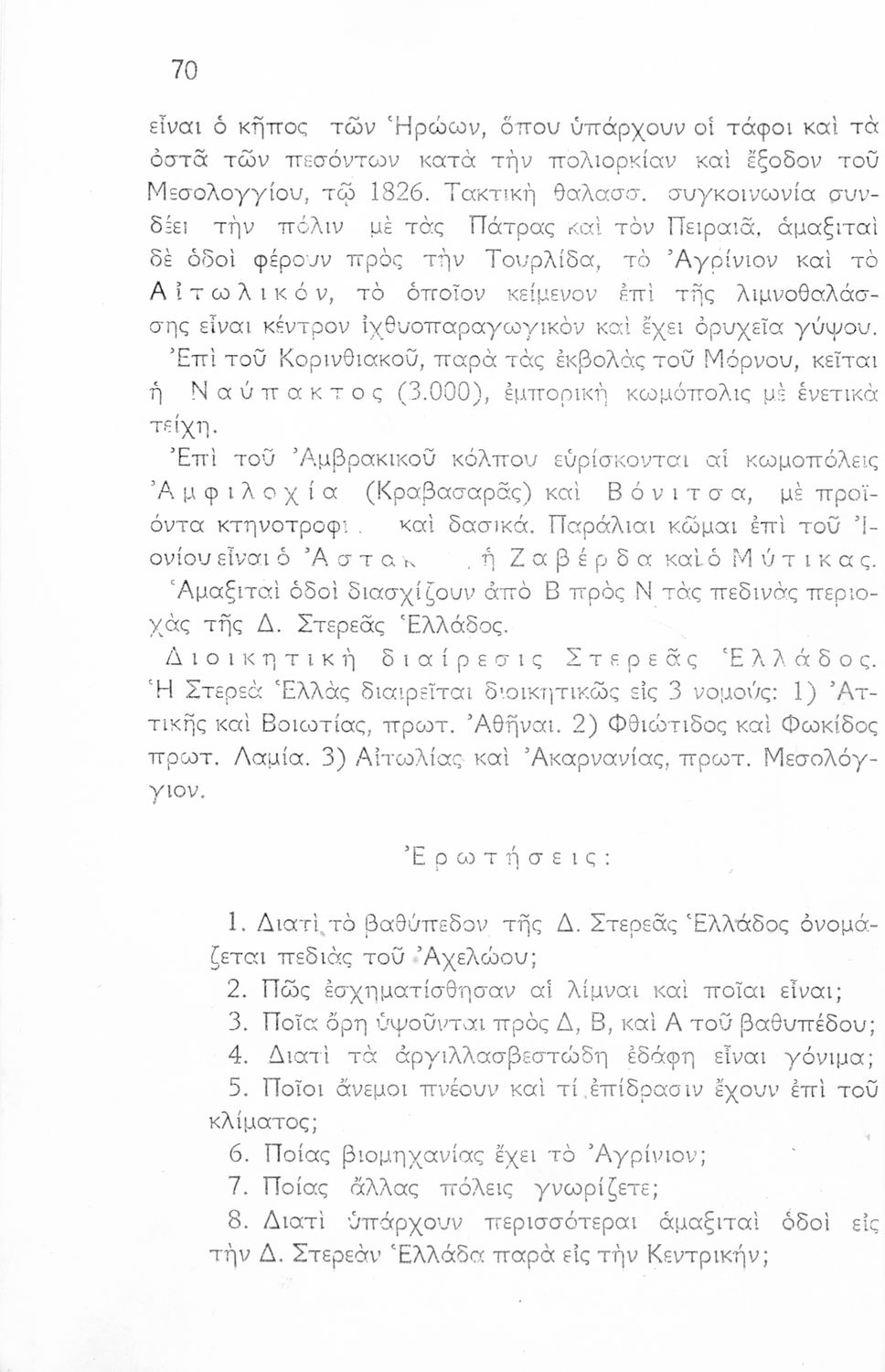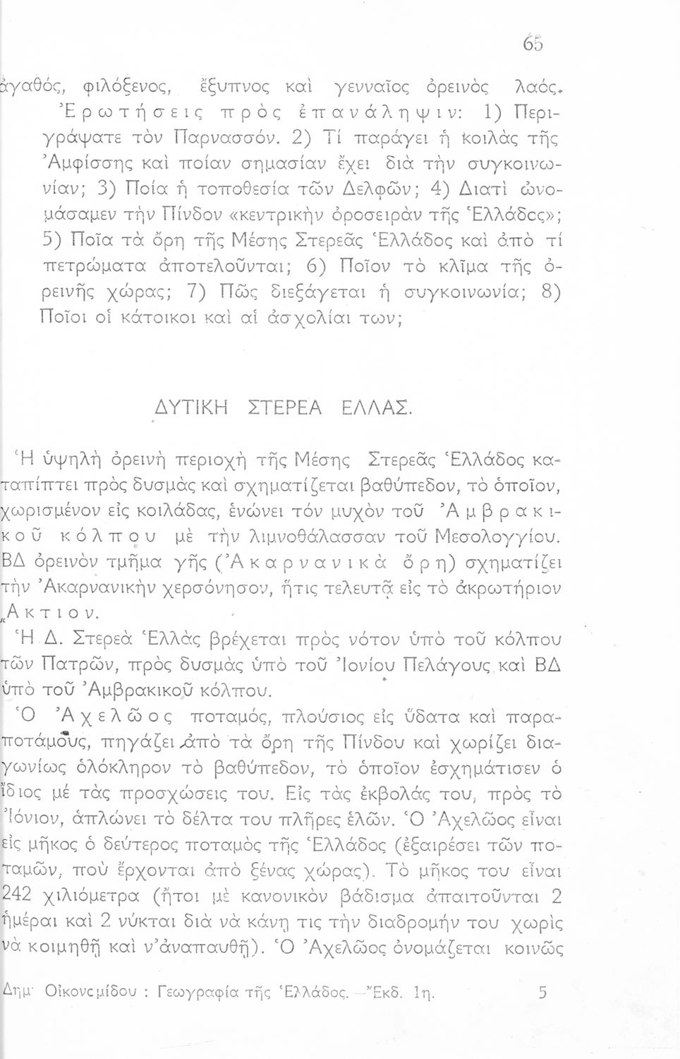 Σχολικό εγχειρίδιο Γεωγραφίας Α' Γυμνασίου που εξετάζει την Ελλάδα ανά διαμέρισμα και νομό από γεωφυσική, οικονομική και πολιτική άποψη.