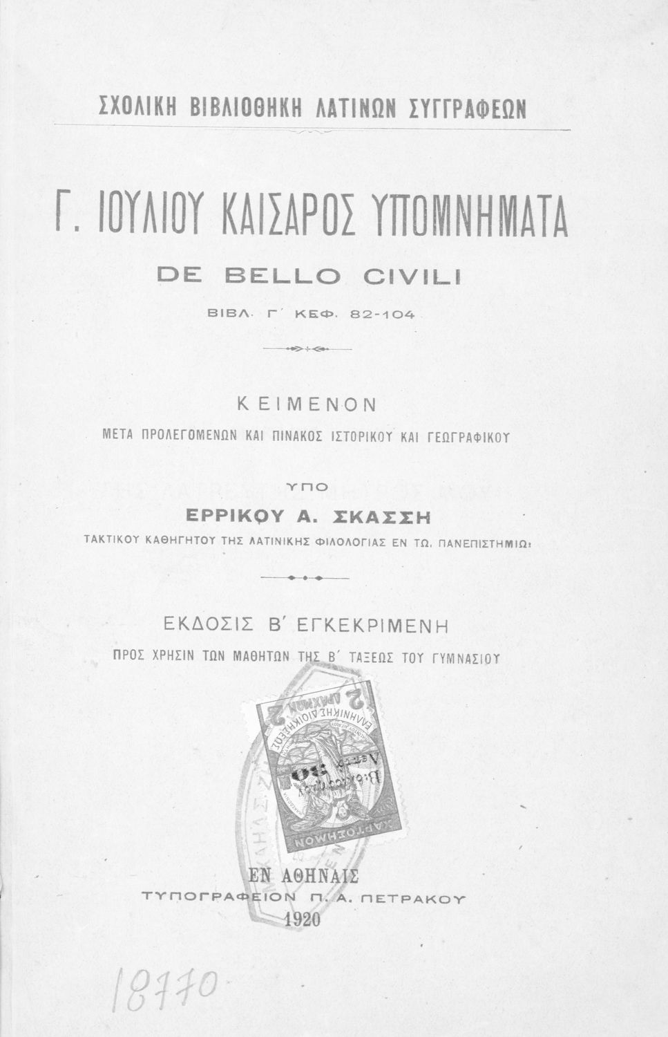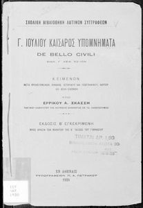 Κωδικός αναγνώρισης: 01-18770 Τίτλος: Γ. Ιουλίου Καίσαρος Υπομνήματα de bello civili βιβλ. Γ΄, κεφ. 82-104 προς χρήσιν μαθητών της Β΄ τάξεως του Γυμνασίου Συγγραφέας: Γ. Ιούλιος Καίσαρας (C. Julius Caesar), Ερρίκος Σκάσσης (εισαγωγή) Μέγεθος και υπόστρωμα: Σχολικό εγχειρίδιο, 21εκ., μαλακό εξώφυλλο, 37 σελίδες. Σκίτσα και χάρτης (ασπρόμαυρα). |