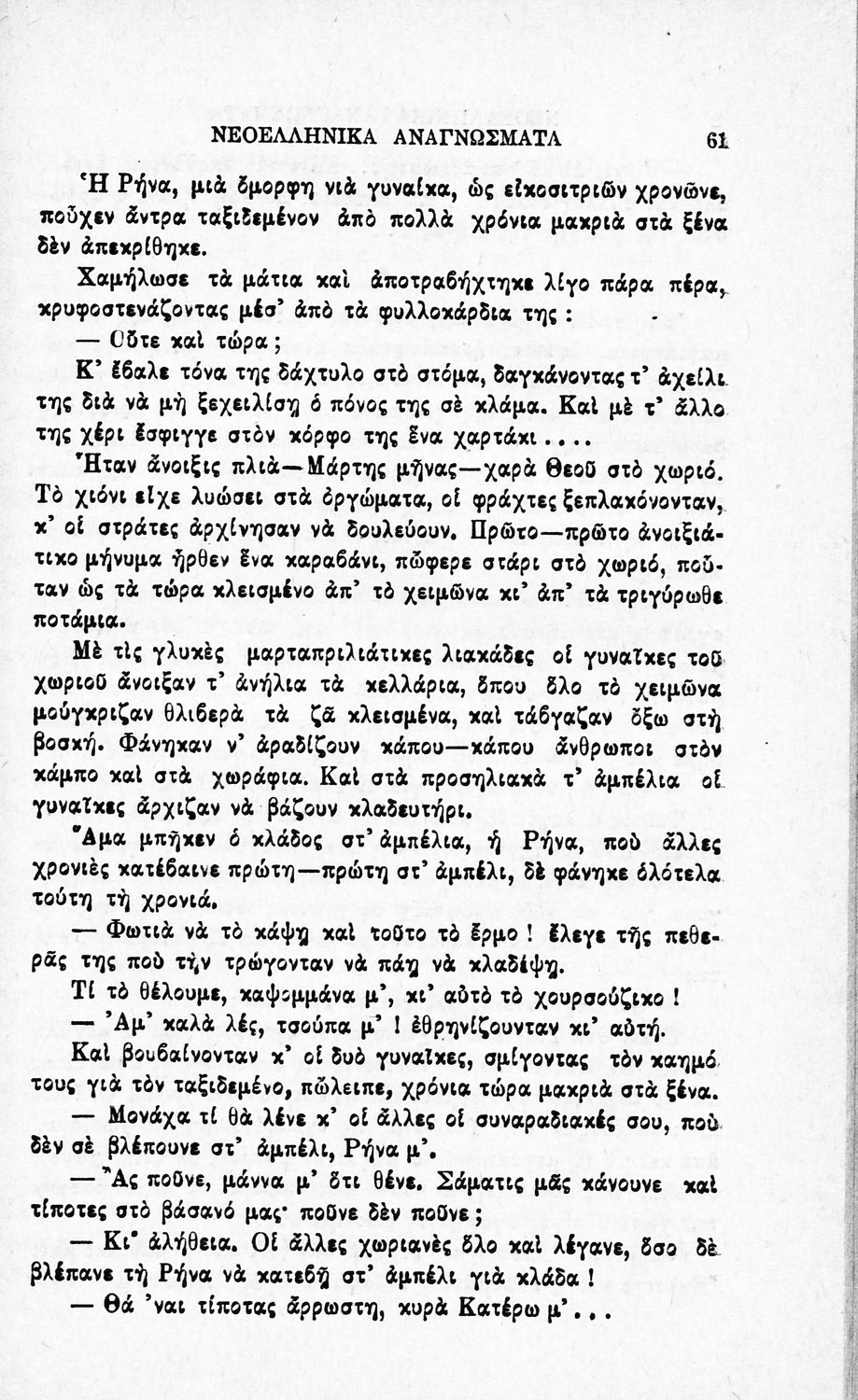 Σχολικό εγχειρίδιο για την Β΄ Γυμνασίου και την Γ΄ Αστικού Θηλέων για το μάθημα των Νέων Ελληνικών. Το εγχειρίδιο αποτελείται από κείμενα πεζού λόγου, επικολυρικά ποιήματα, ωδές, ηθογραφικά διηγήματα, ρητορικά