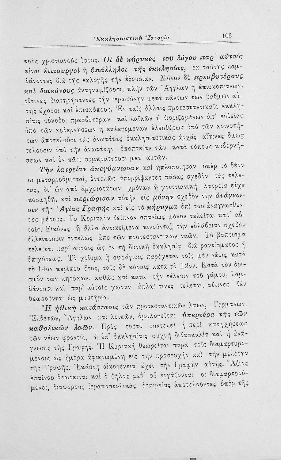 Το σύγγραμμα ήταν σχολικό εγχειρίδιο για το μαθήματα των Θρησκευτικών. Περιγράφει σημαντικά γεγονότα της θρησκευτικής ζωής ξεκινώντας από την Πεντηκοστή. Επίσης, αναφέρεται σε θέματα διοίκησης της εκκλησίας ...