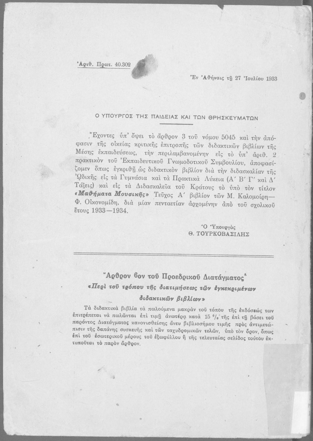 Υπουργική απόφαση / Σύμβαση: 40302/27-7-1933
