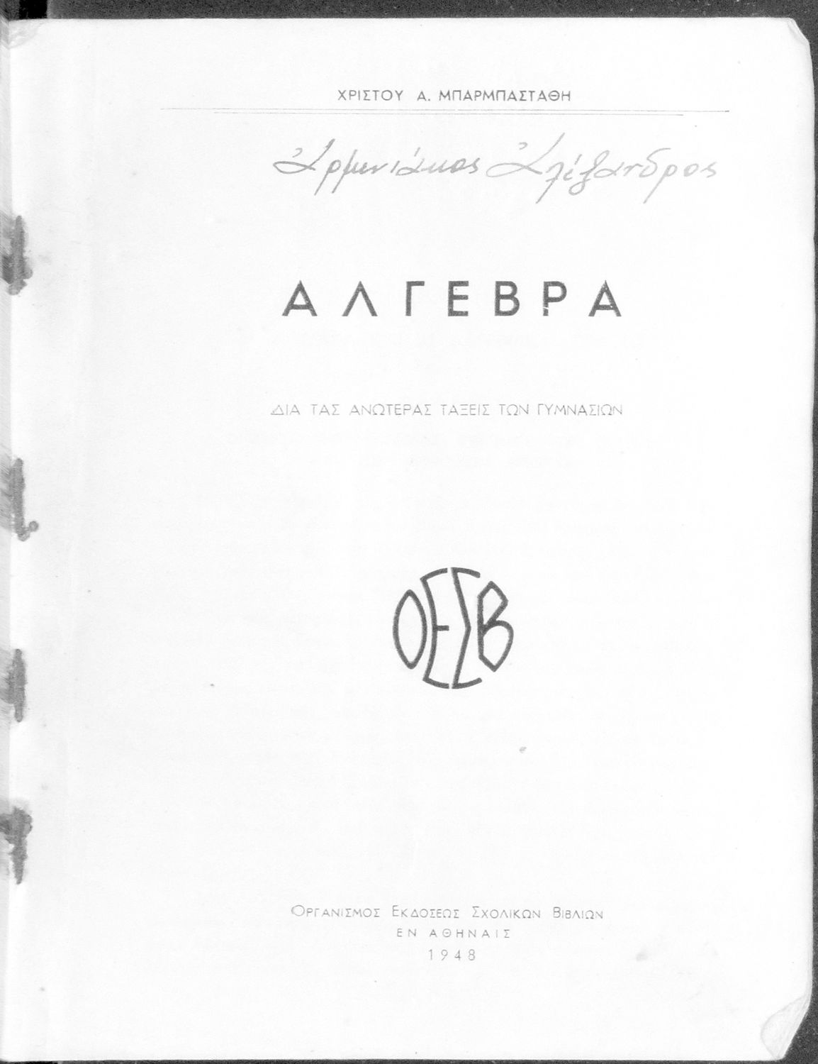 Τίτλος: Άλγεβρα δια τας ανωτέρας τάξεις των Γυμνασίων