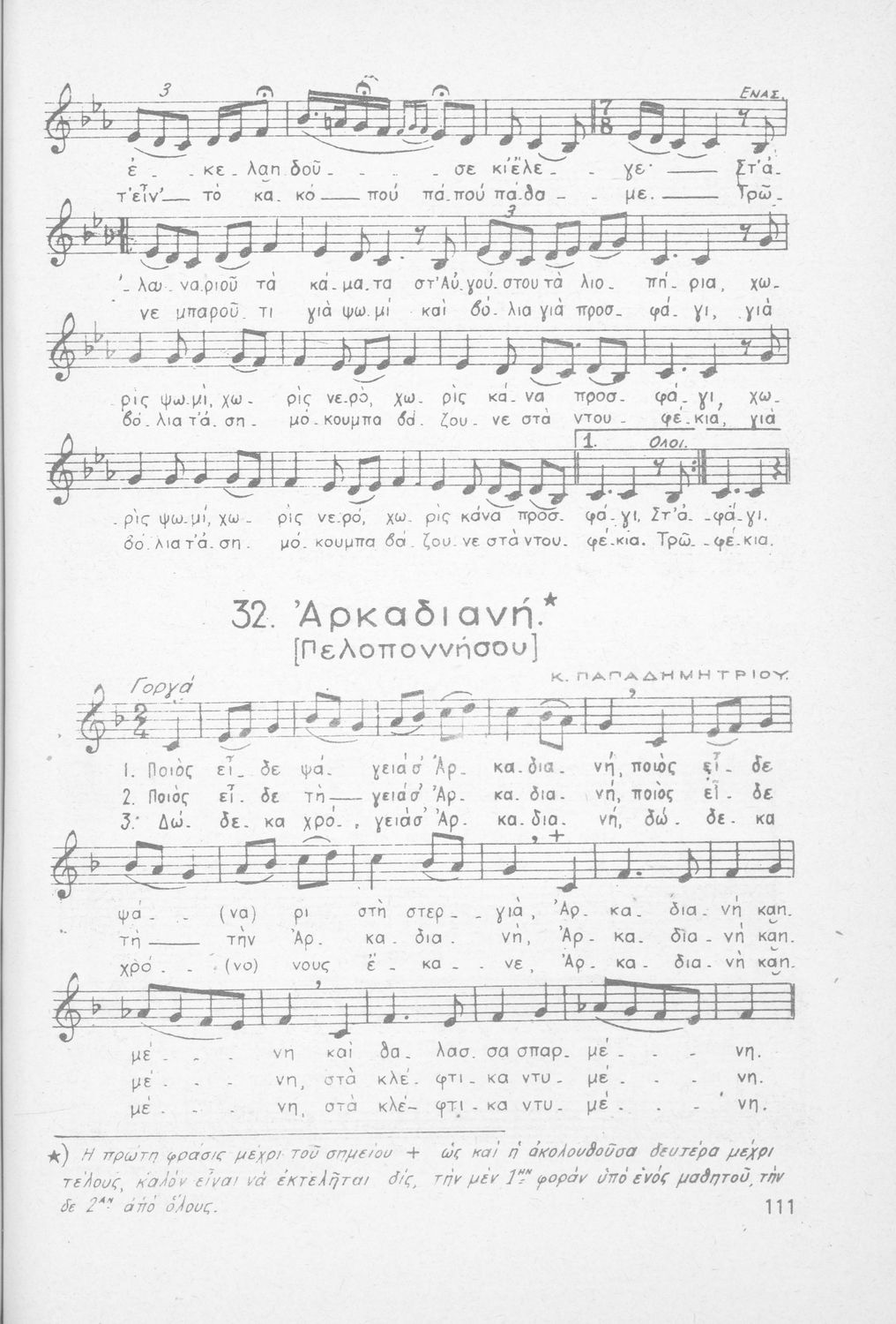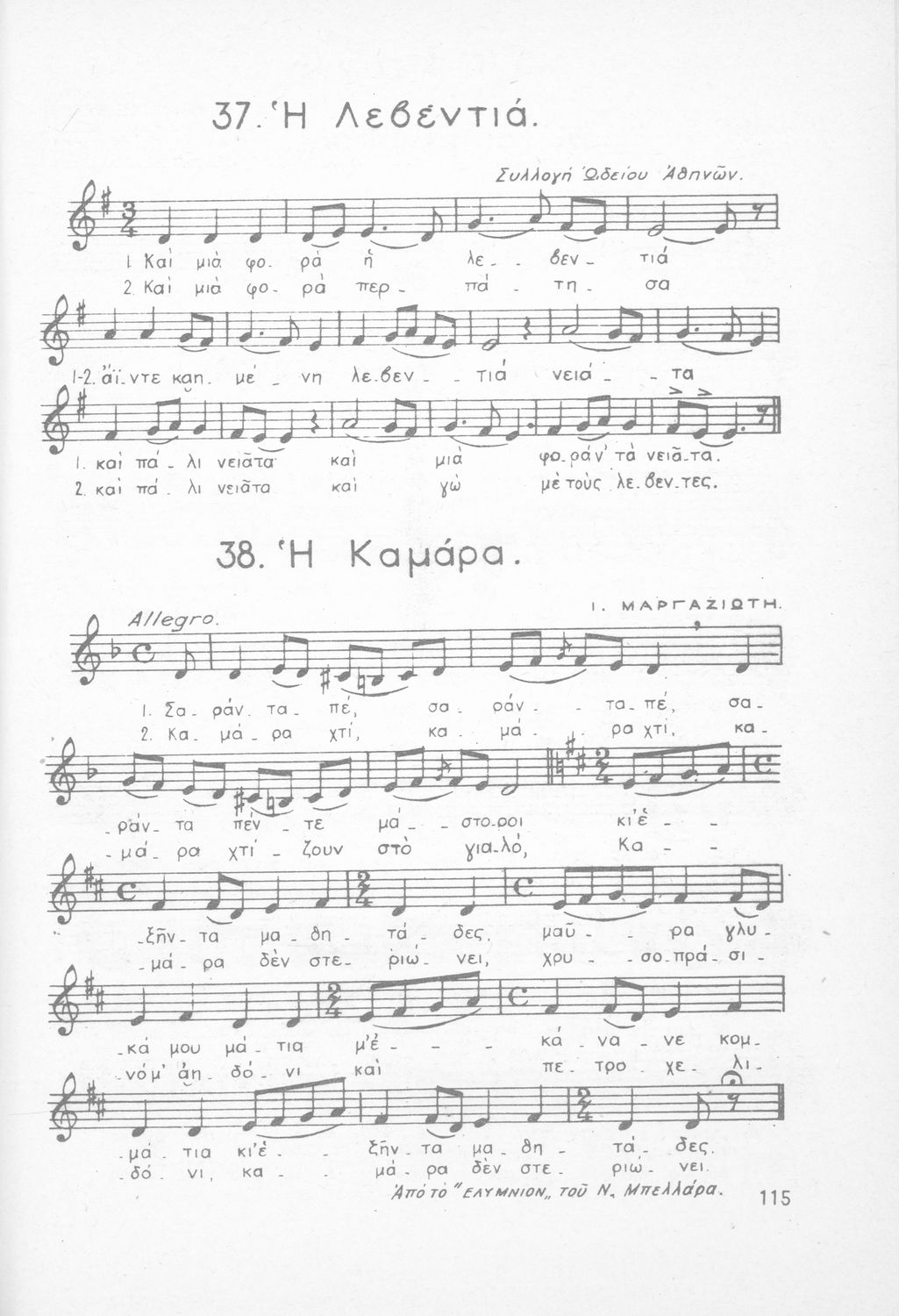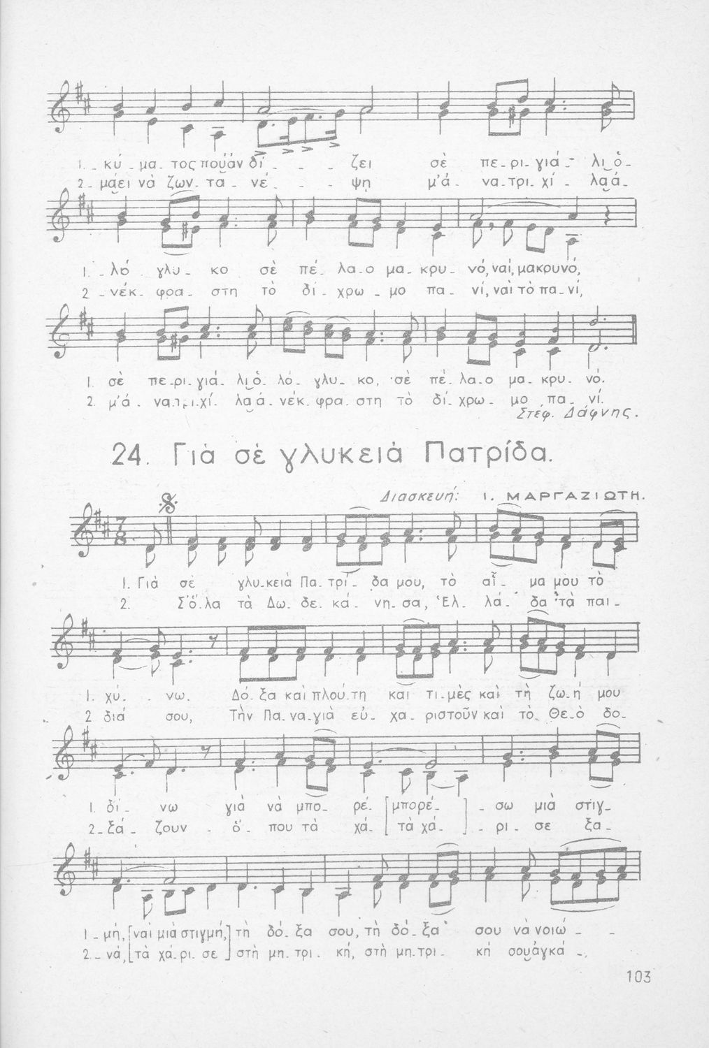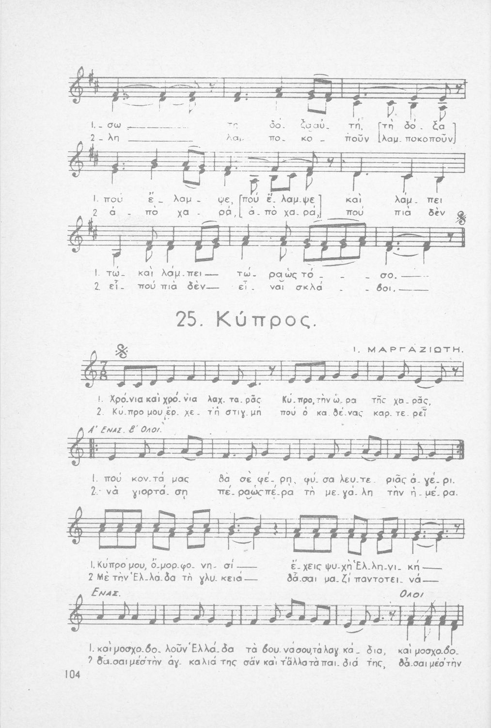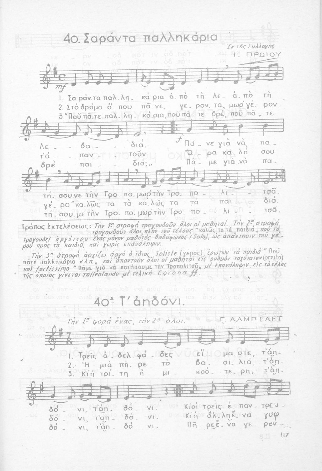Σχολικό εγχειρίδιο Μουσικής για Γυμνάσια, Παρθεναγωγεία και Διδασκαλεία. Περιέχει ασκήσεις μελωδικές, χωρίς θεωρία.