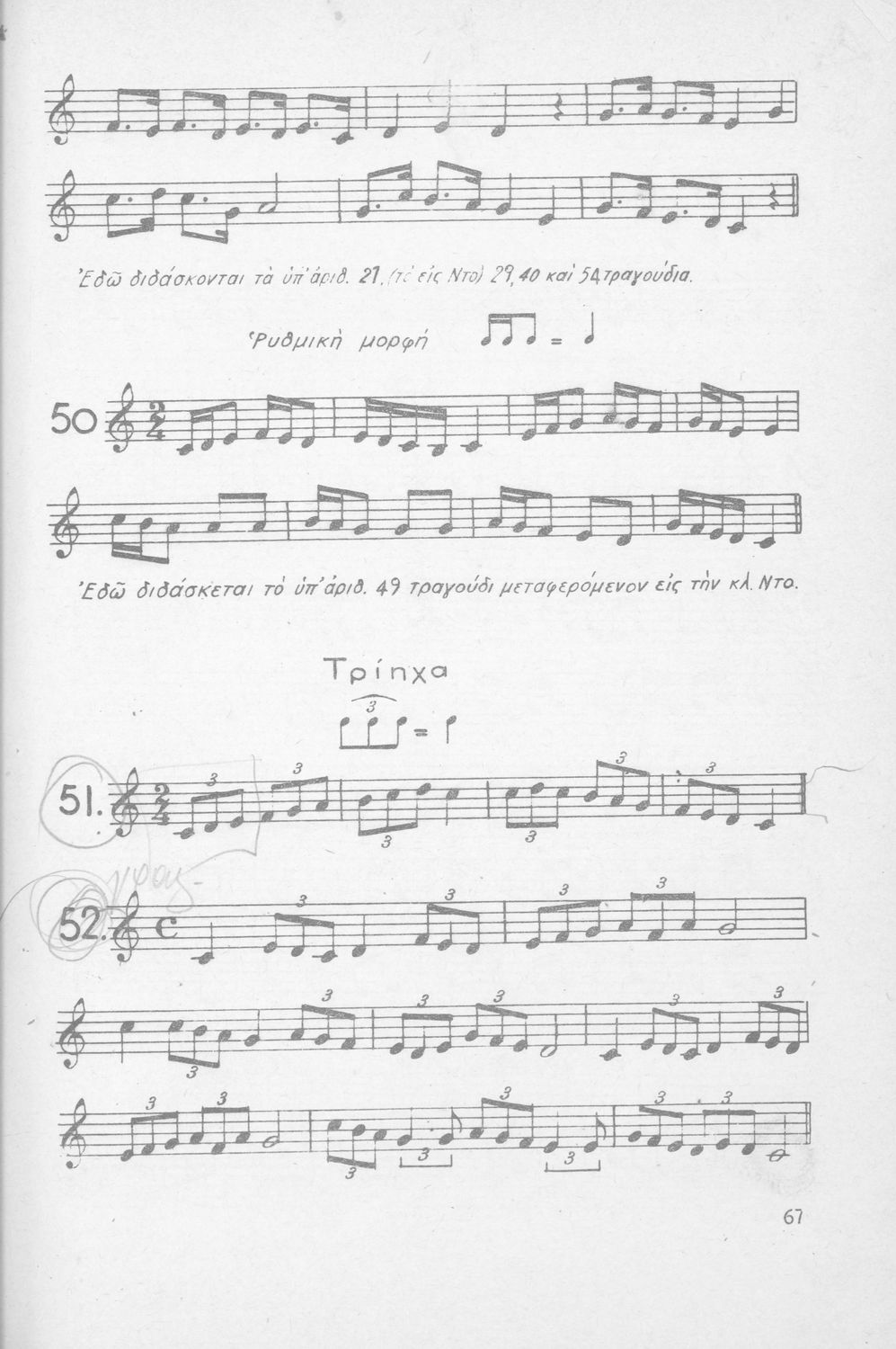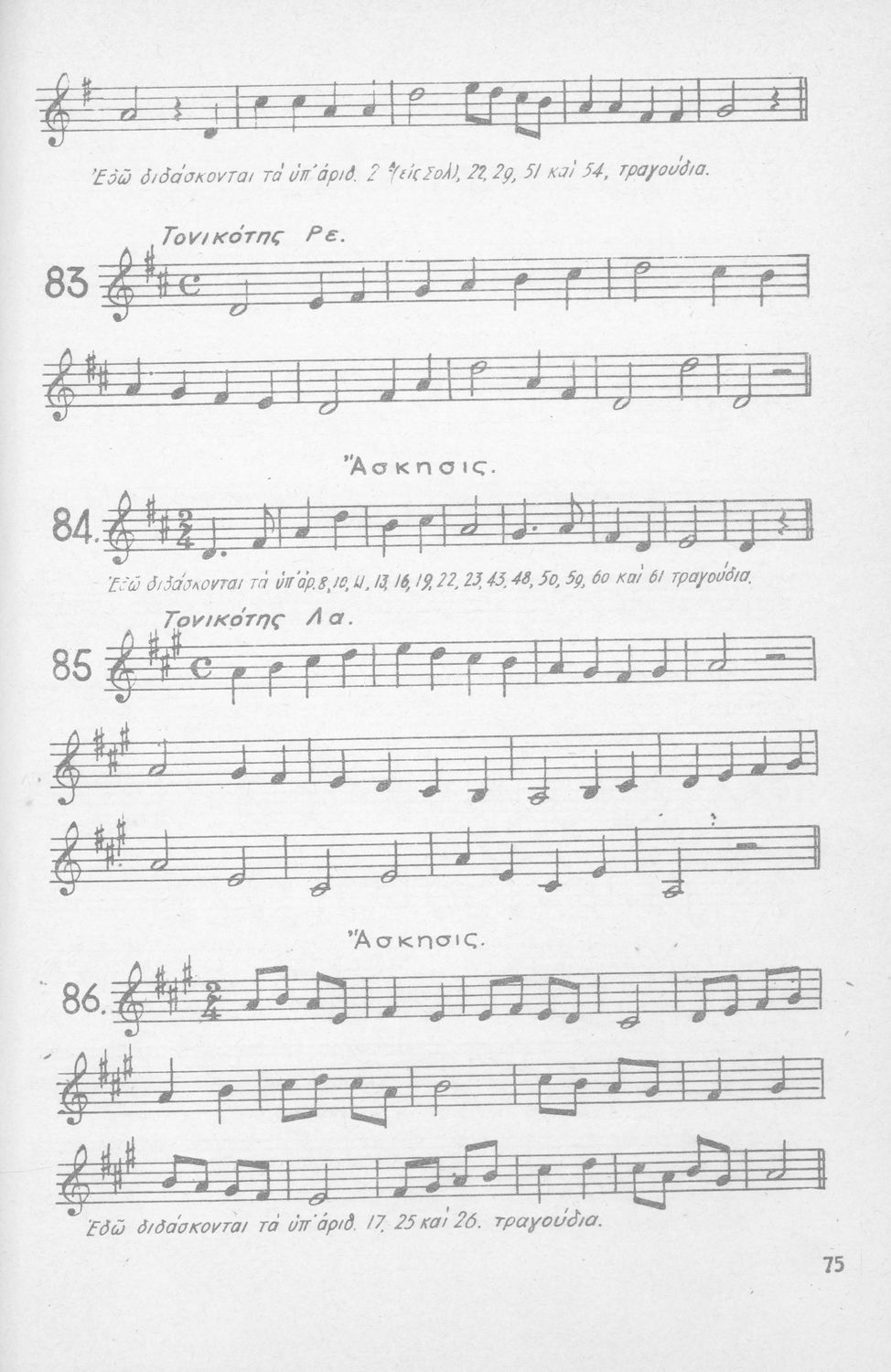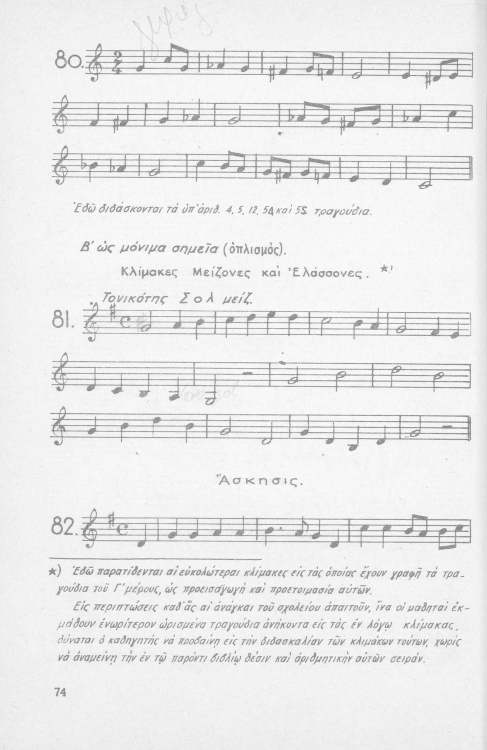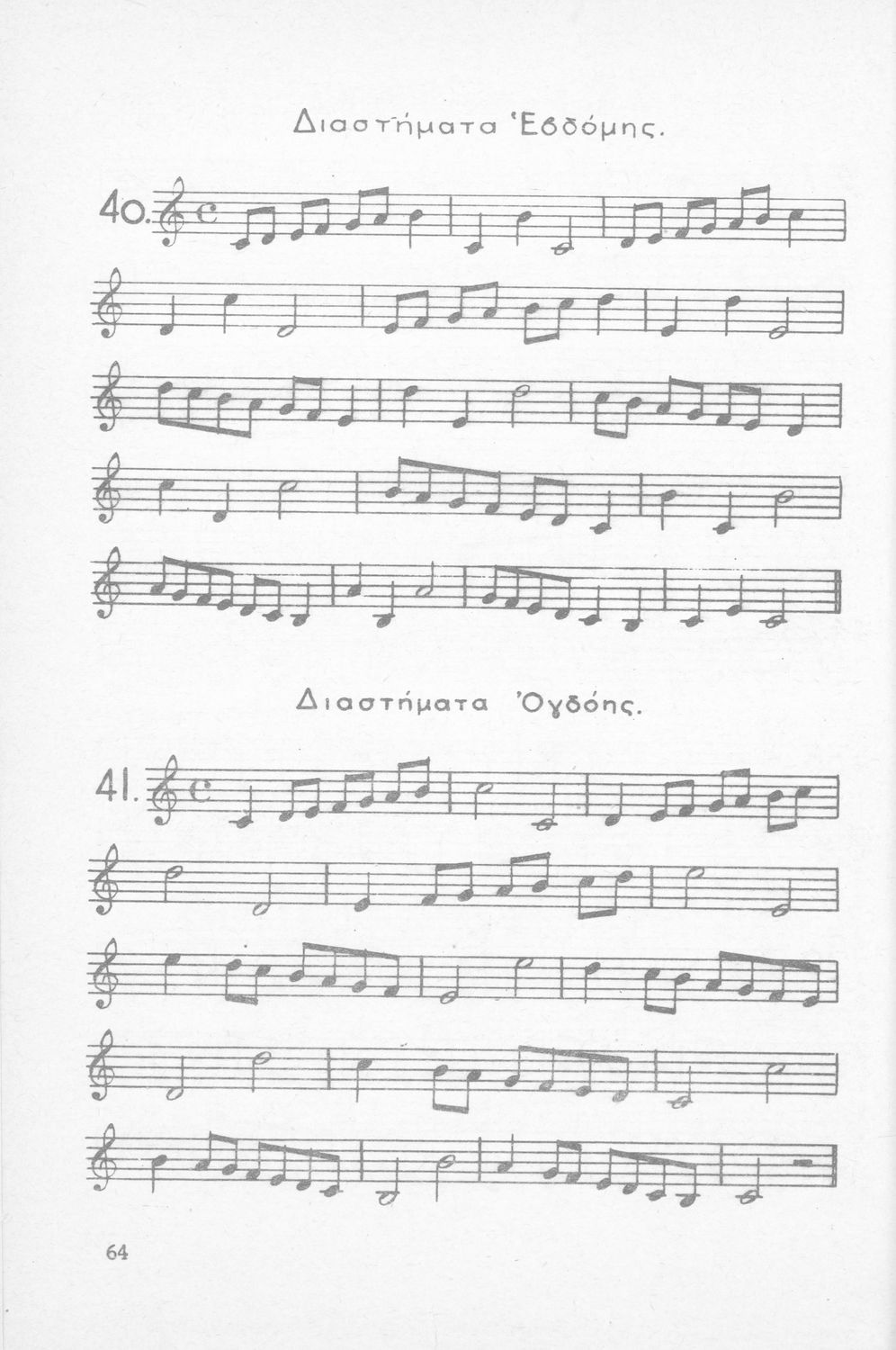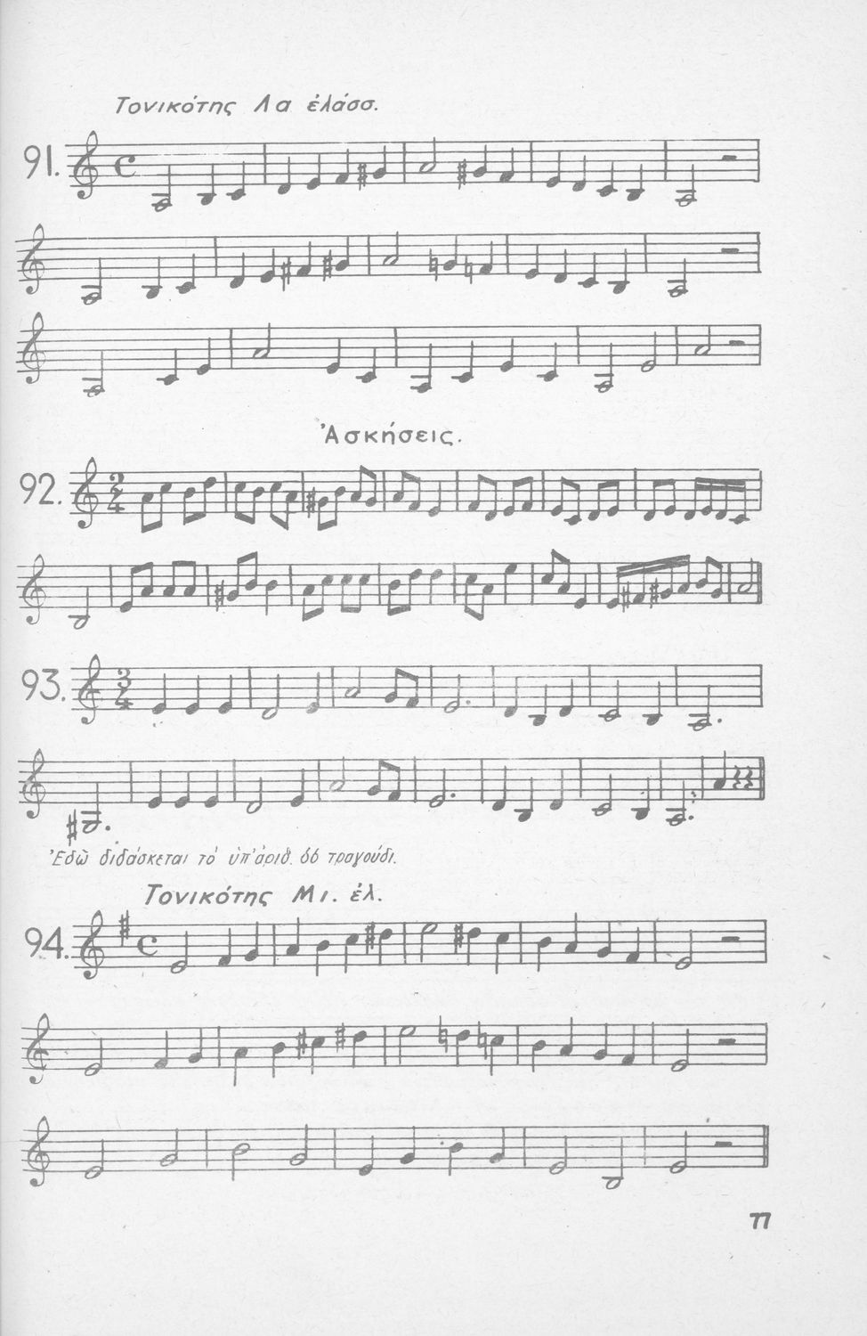 Σχολικό εγχειρίδιο Μουσικής για Γυμνάσια, Παρθεναγωγεία και Διδασκαλεία. Περιέχει ασκήσεις μελωδικές, χωρίς θεωρία.