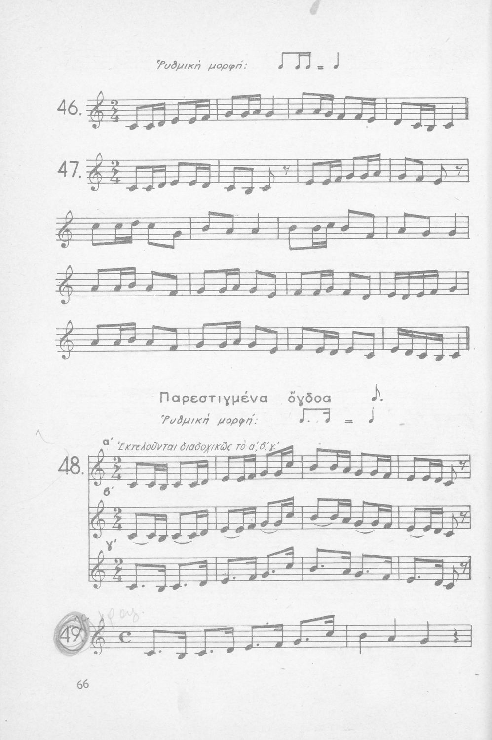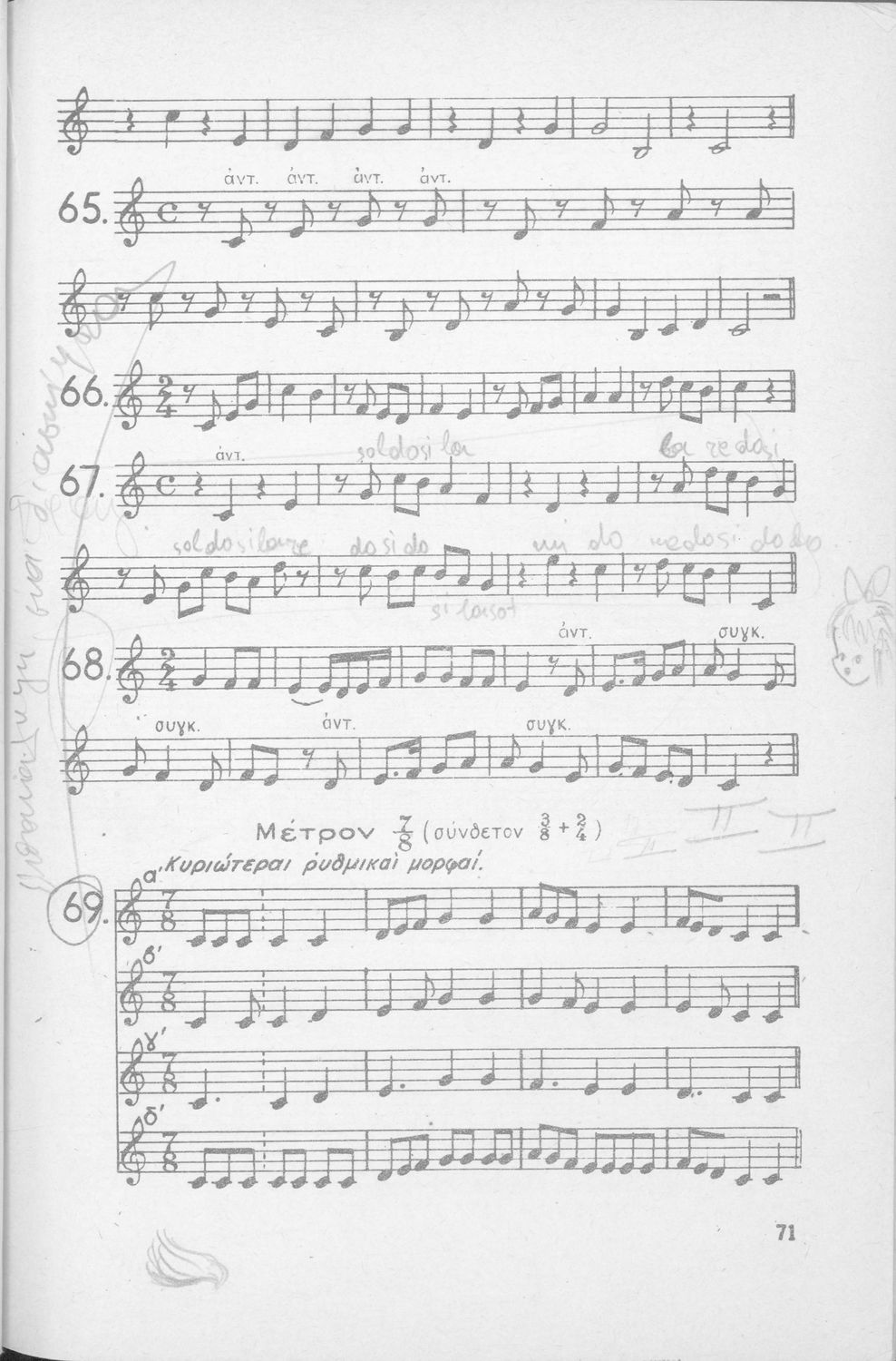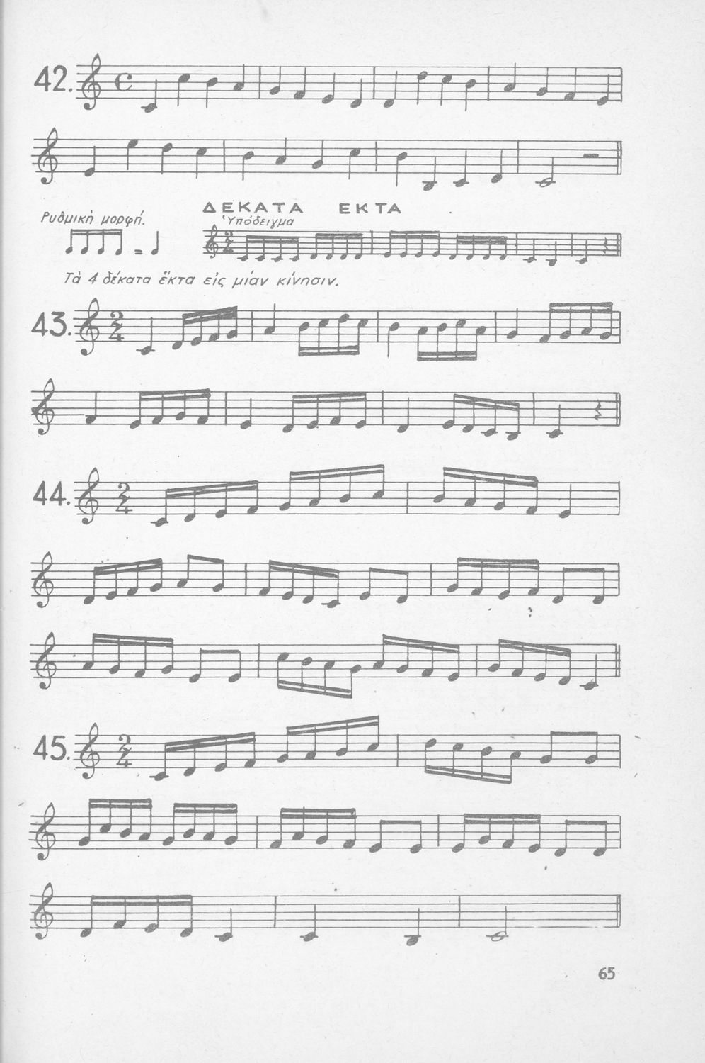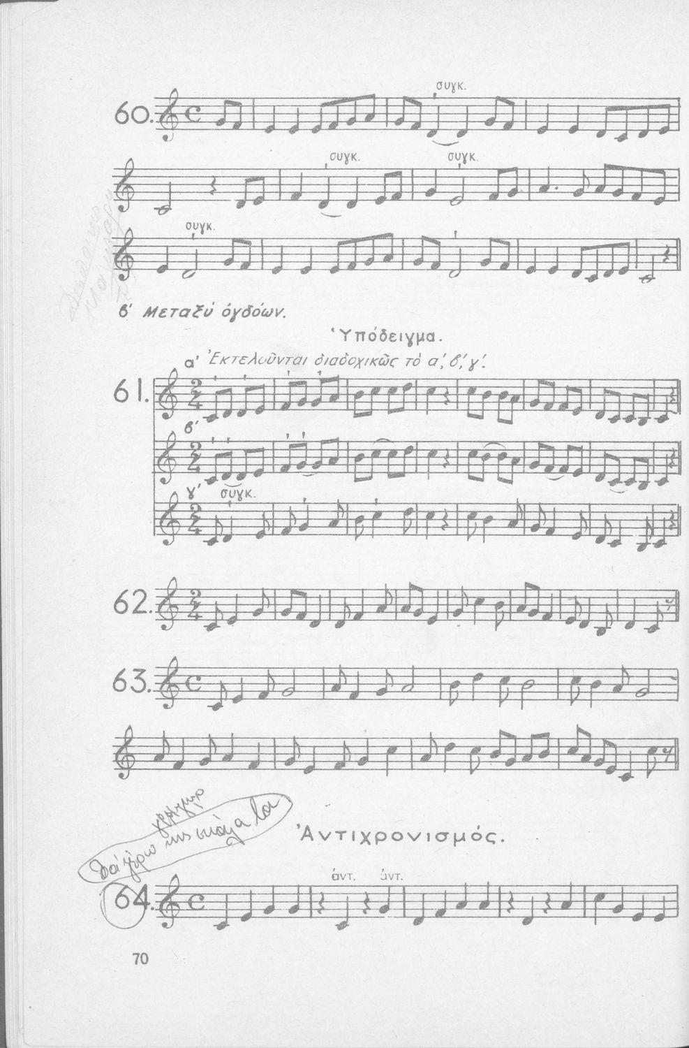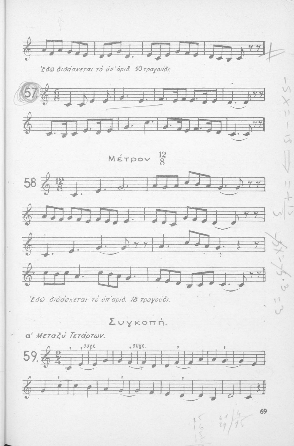 Σχολικό εγχειρίδιο Μουσικής για Γυμνάσια, Παρθεναγωγεία και Διδασκαλεία. Περιέχει ασκήσεις μελωδικές, χωρίς θεωρία.