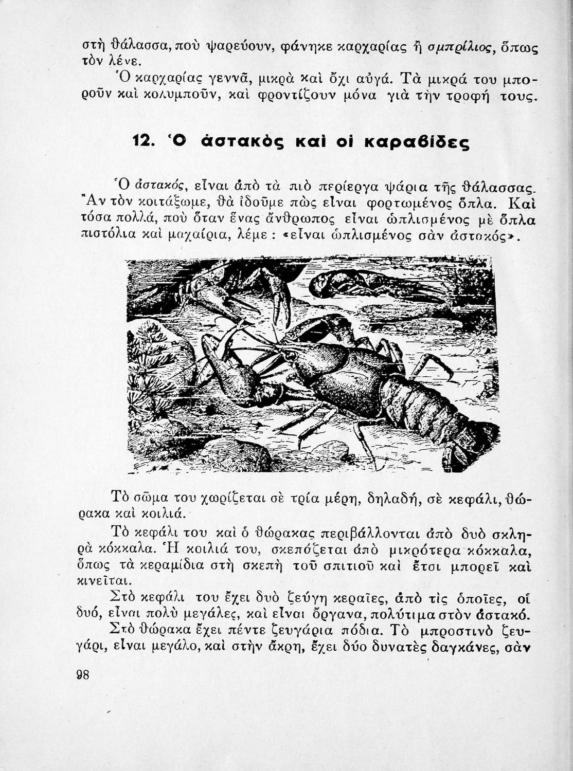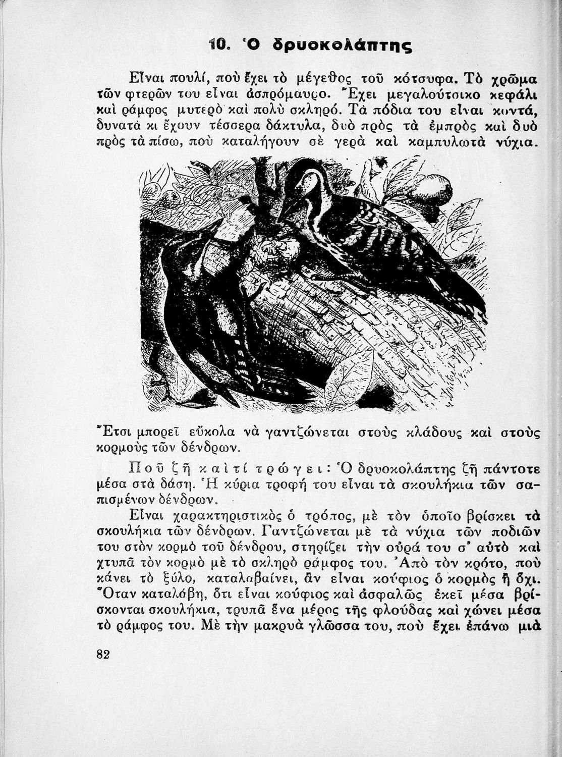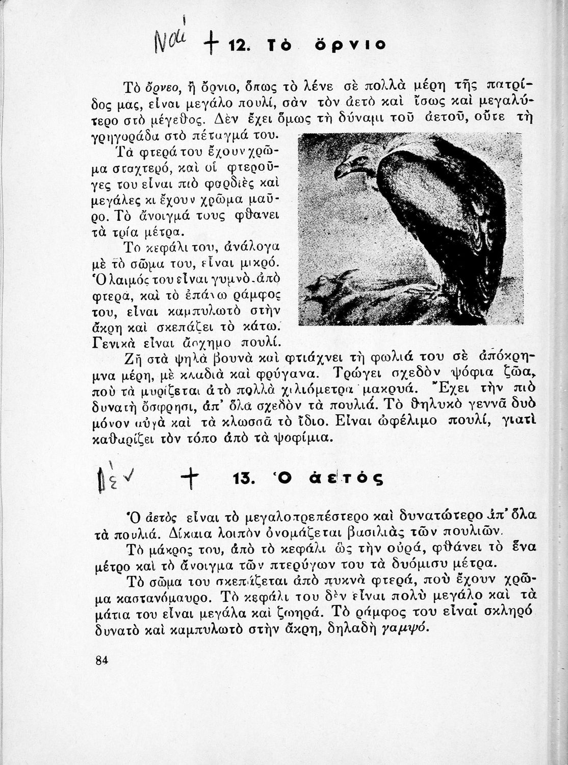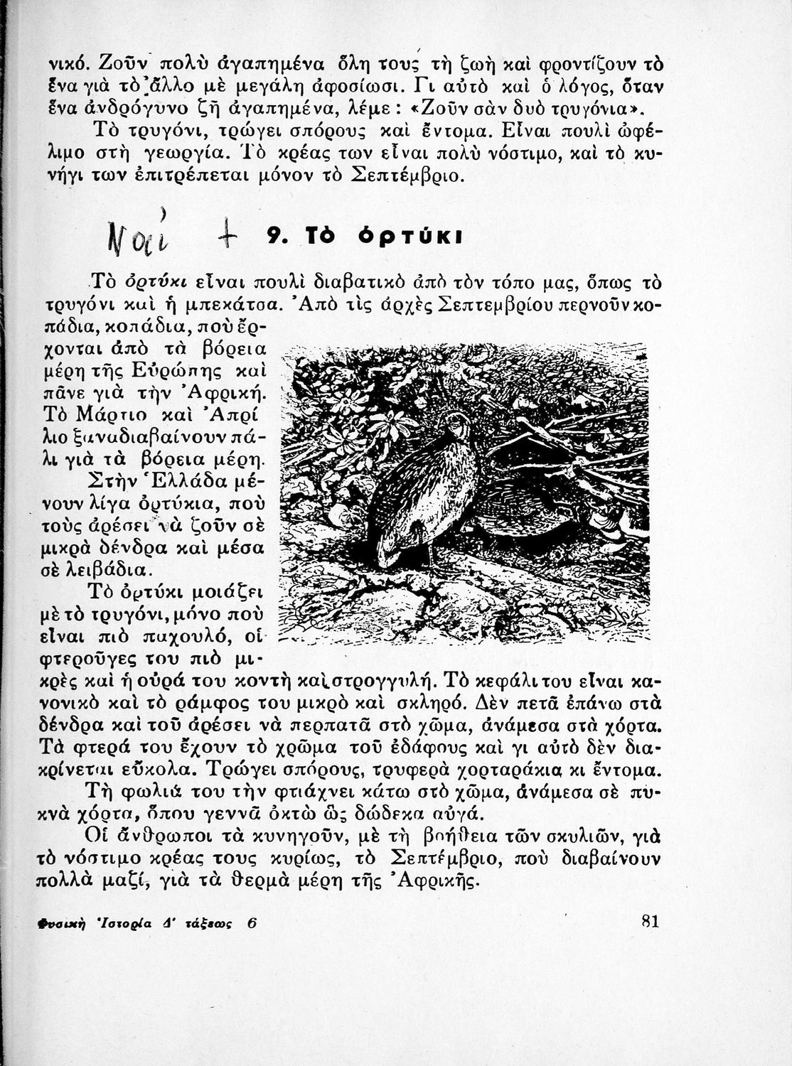 Σχολικό εγχειρίδιο Γεωγραφίας για την Α΄ Ελληνικών Σχολείων. Βιβλίο Φυσικής Ιστορίας με ζώα και φυτά που αναφέρονται οι χρήσεις τους, οι εχθροί και οι προφυλάξεις.