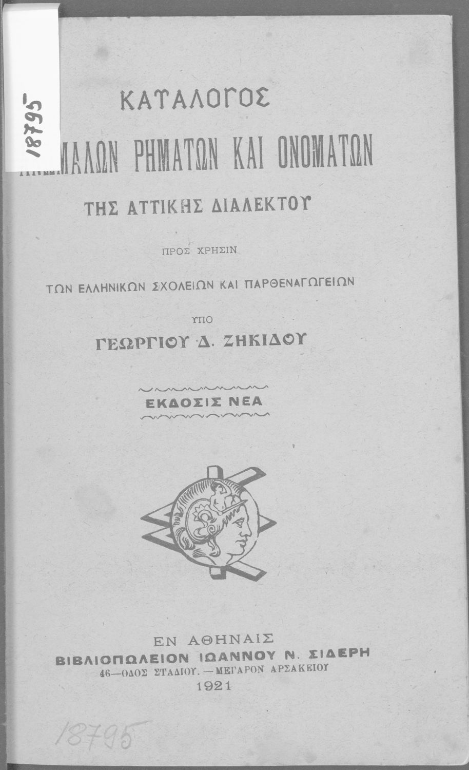 Τίτλος: Κατάλογος ανωμάλων ρημάτων και ονομάτων της αττικής διαλέκτου προς χρήσιν των Ελληνικών Σχολείων και Παρθεναγωγείων