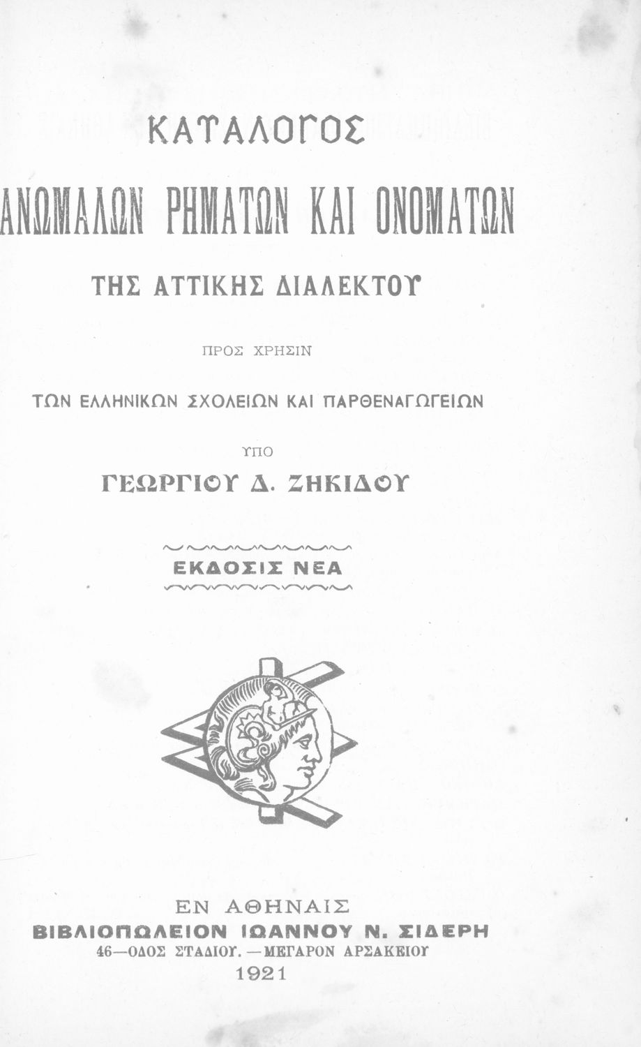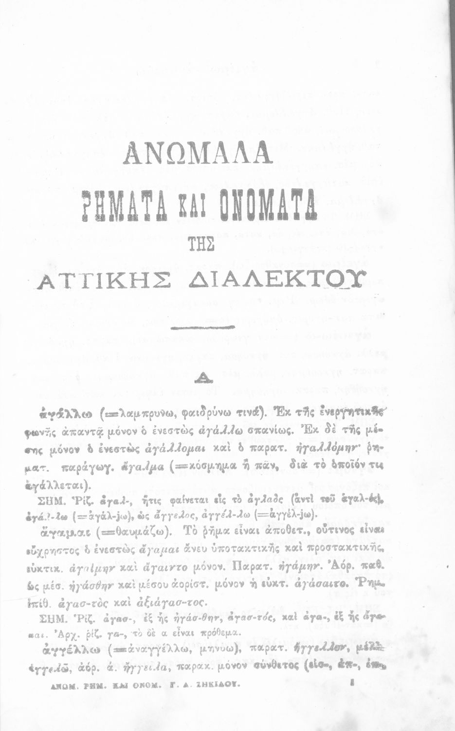 Μαθητικό βοήθημα Αρχαίων Ελληνικών για τα Ελληνικά Σχολεία, Παρθεναγωγεία και Γυμνάσια που περιλαμβάνει γραμματική της αρχαίας ελληνικής και κατάλογο ανωμάλων ρημάτων.