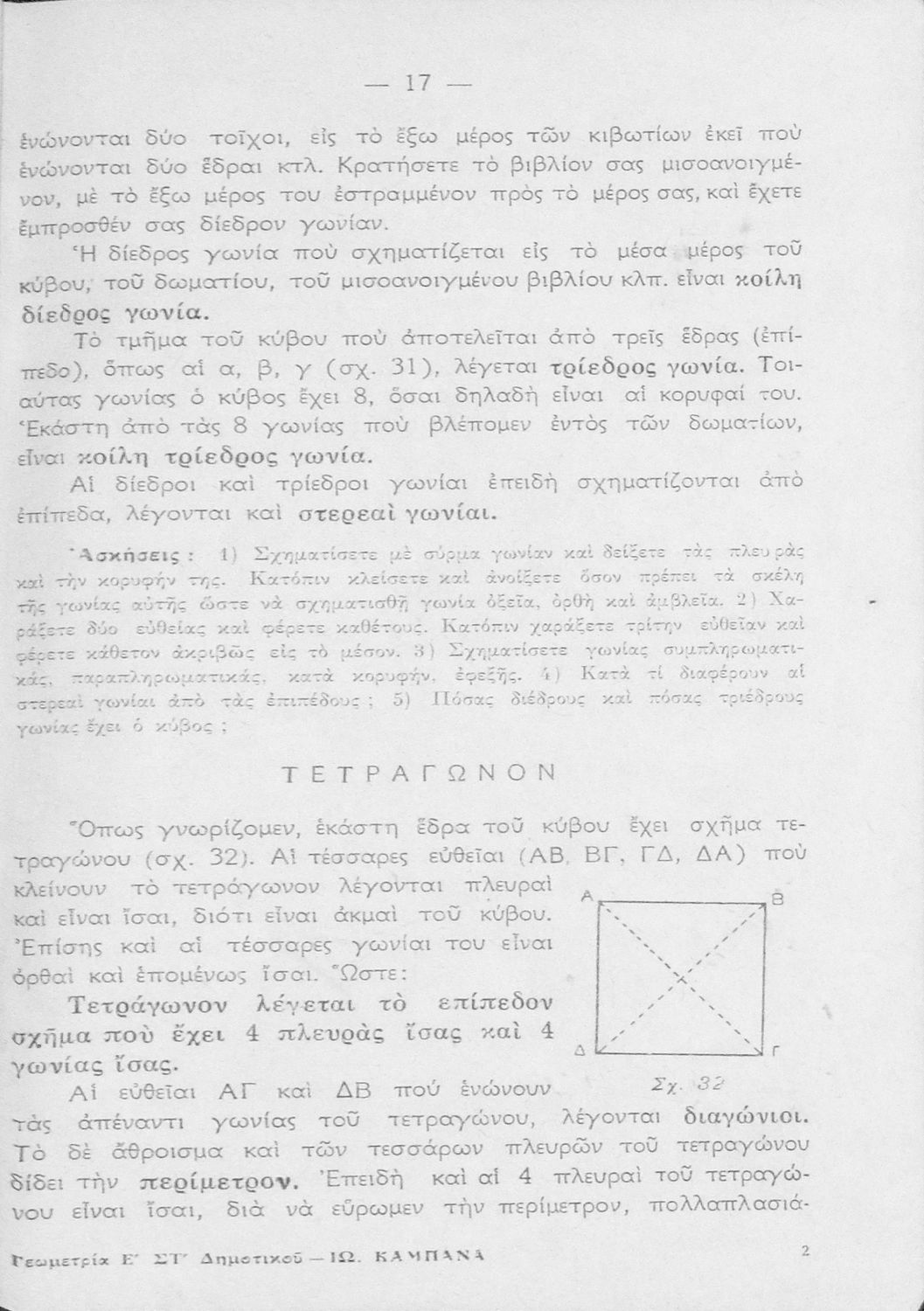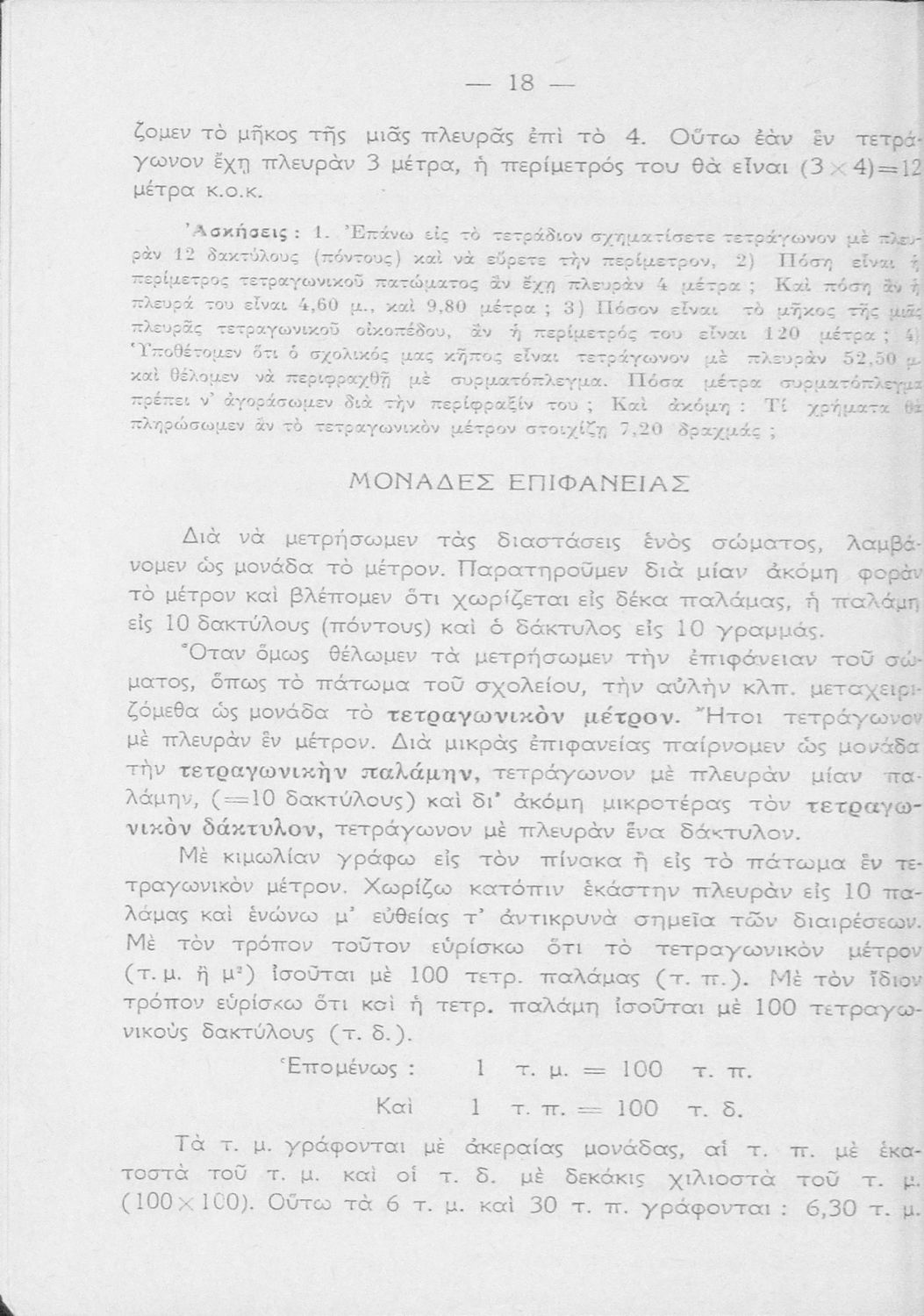 Βαθμίδα εκπαίδευσης: Πρωτοβάθμια Τάξη: Ε' Δημοτικού / ΣΤ' Δημοτικού Μάθημα: Μαθηματικά Γλώσσα: Απλή καθαρεύουσα Παρουσίαση περιεχομένου: Μαθητικό βοήθημα Γεωμετρίας Ε΄ και ΣΤ΄ Δημοτικού που εστιάζει στη μέτρηση των γεωμετρικών σχημάτων και σωμάτων. |
