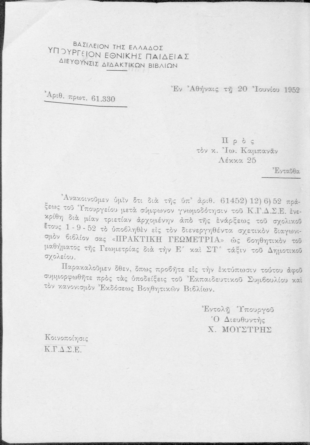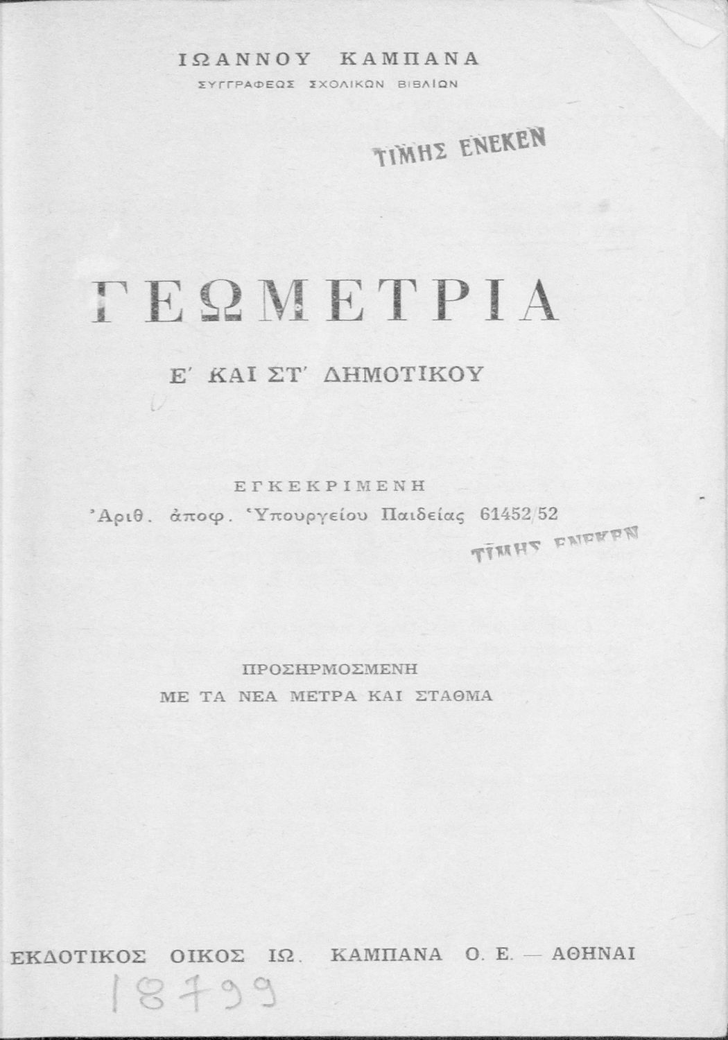 Εκδότης: Ιω. Καμπανάς Ο.Ε. Τόπος έκδοσης: Αθήνα Υπουργική απόφαση / Σύμβαση: 61452/12-6-1952 Έτος έγκρισης: 1952 |
