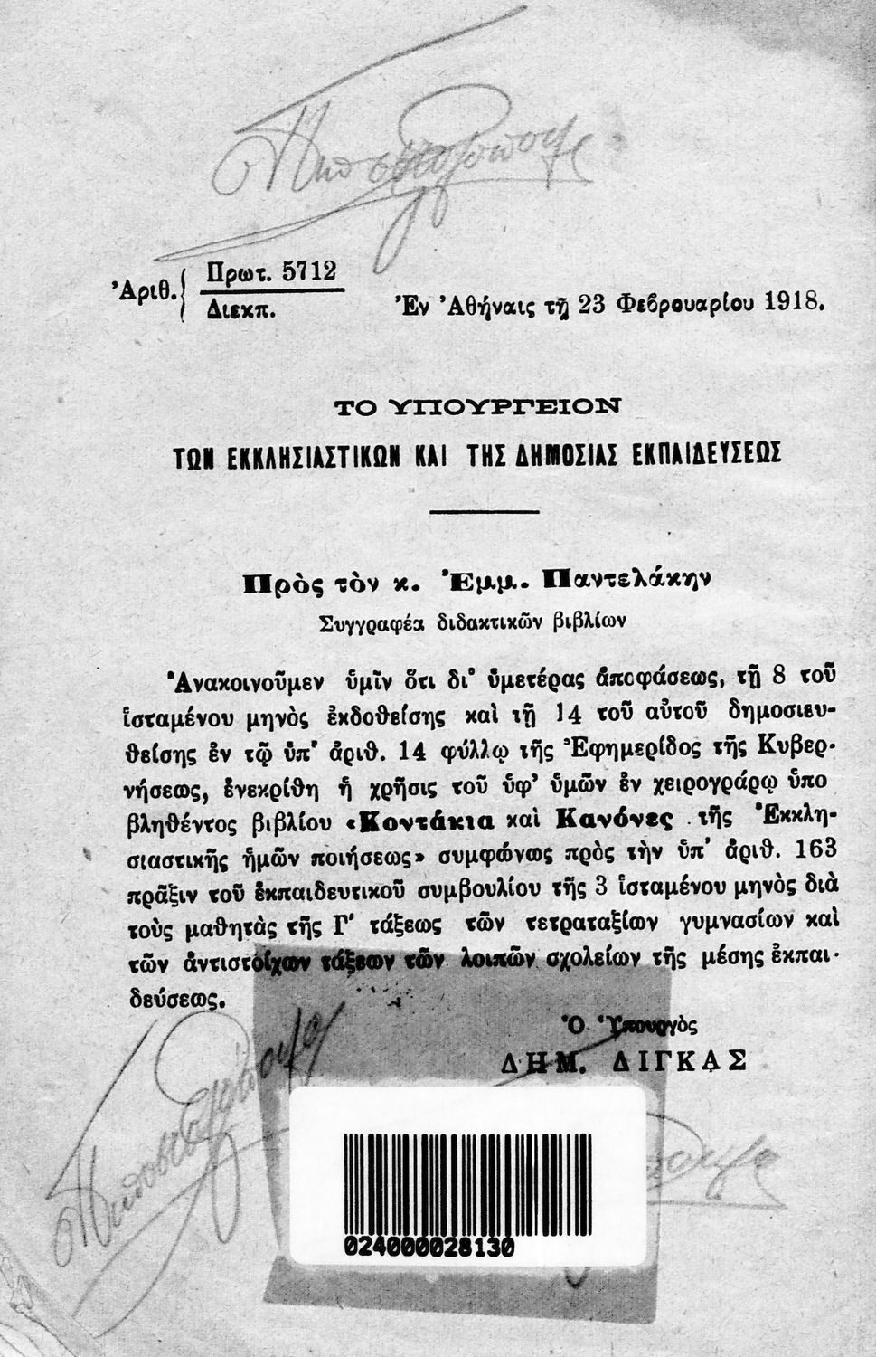 Υπουργική απόφαση / Σύμβαση: 5712/23-2-1918