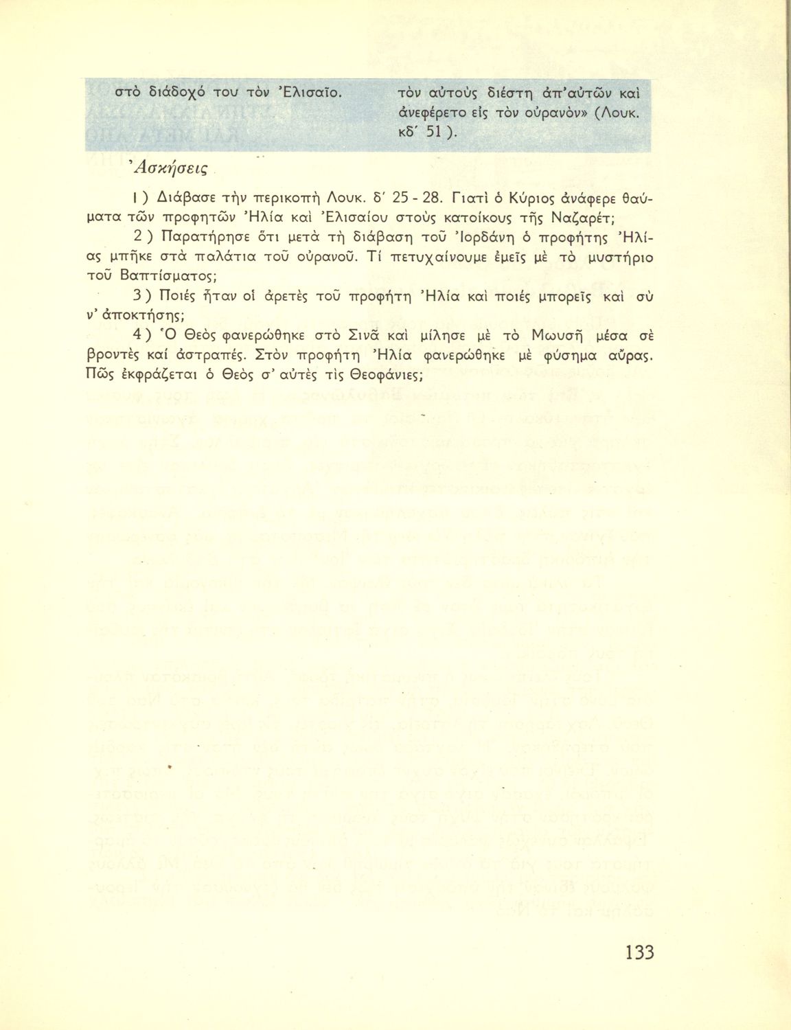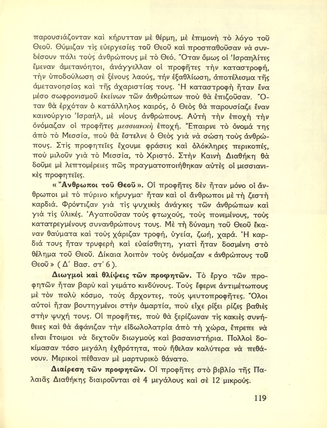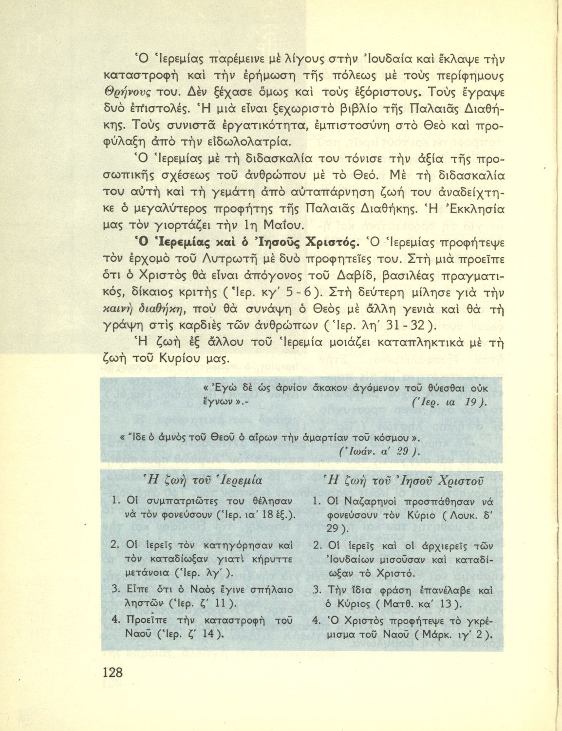 Σχολικό εγχειρίδιο Θρησκευτικών που περιλαμβάνει εισαγωγικά σχόλια στα βιβλία της Παλαιάς και Καινής Διαθήκης, περικοπές, ερμηνευτικές και πραγματολογικές σημειώσεις και πίνακα με τα κυριότερα ονόματα.