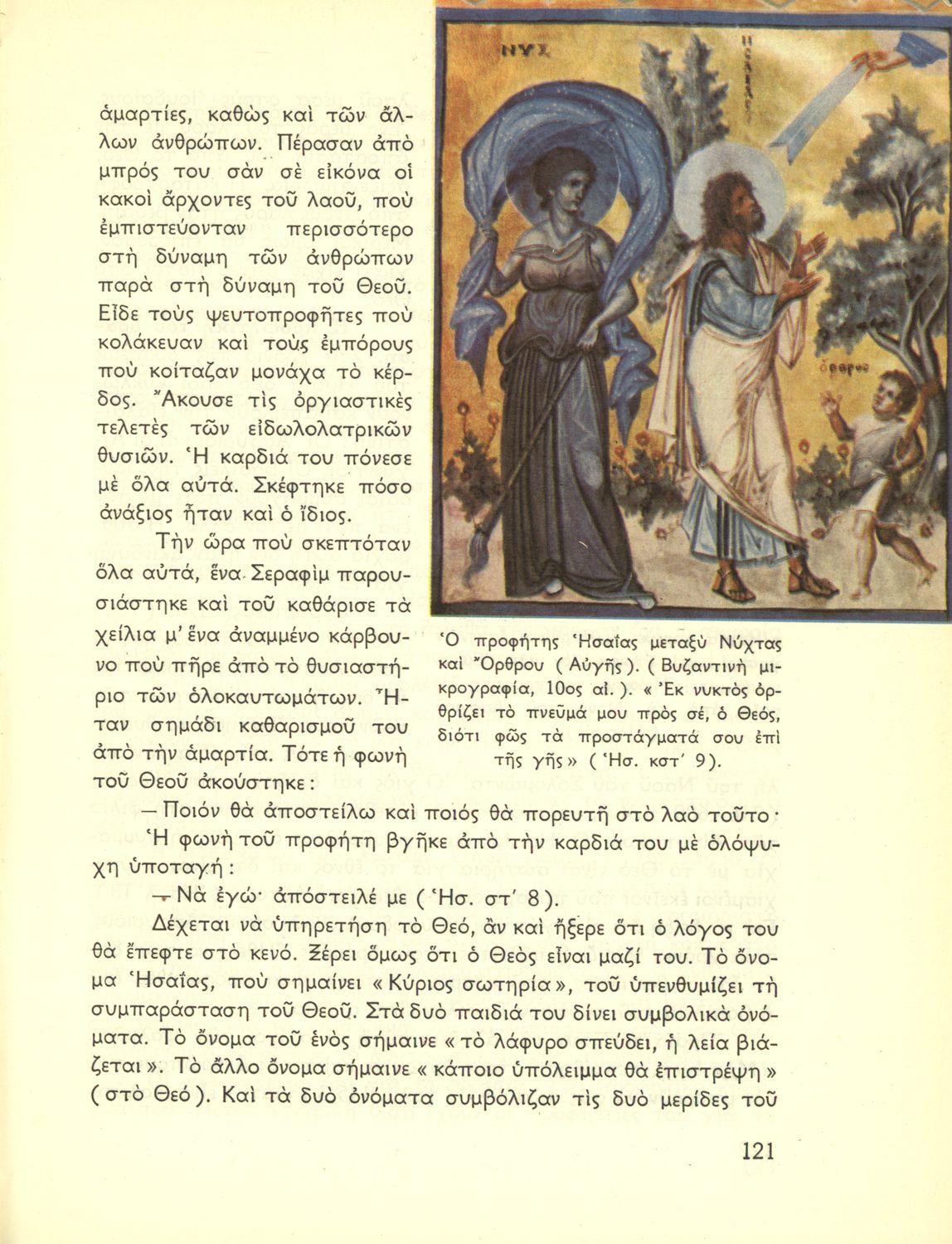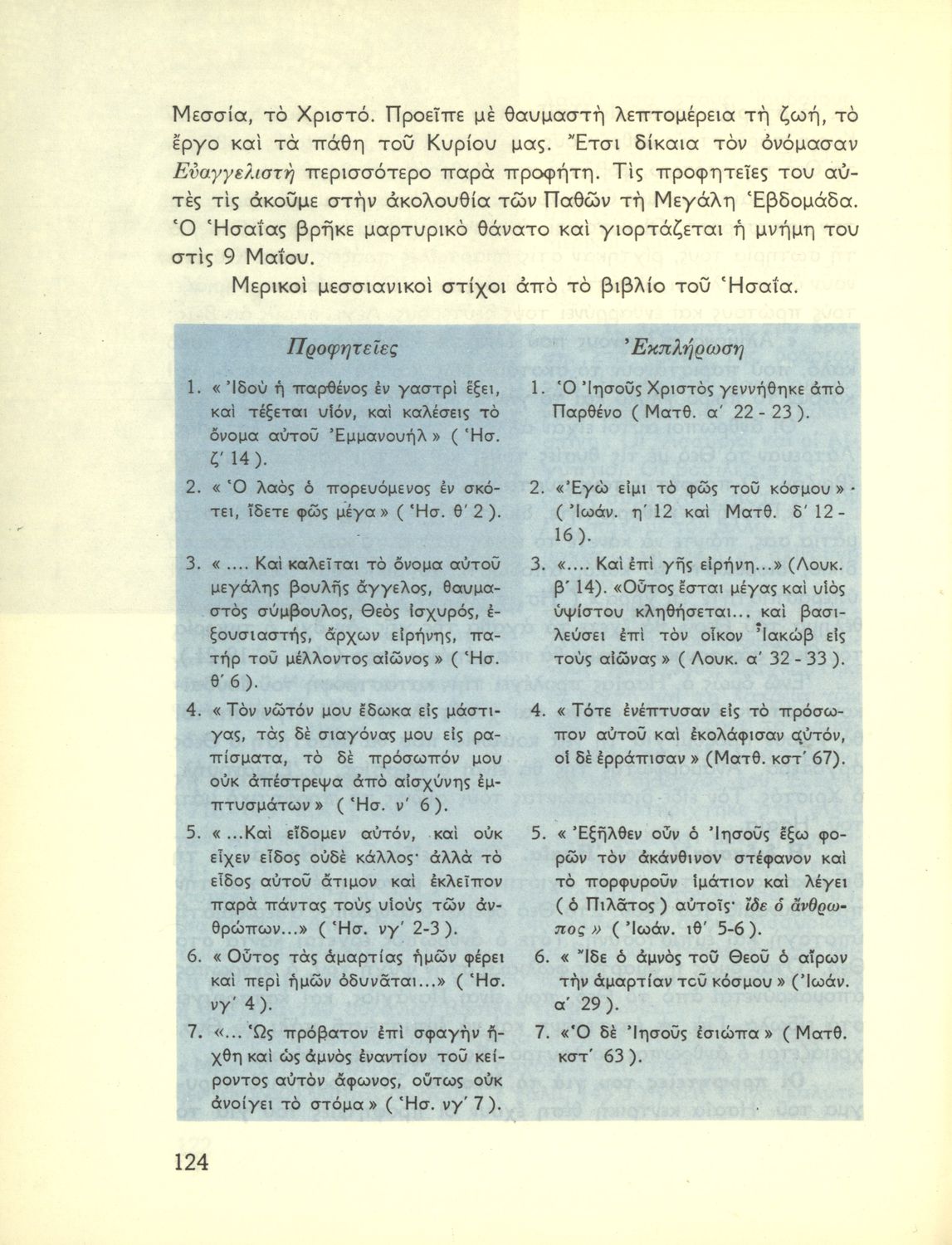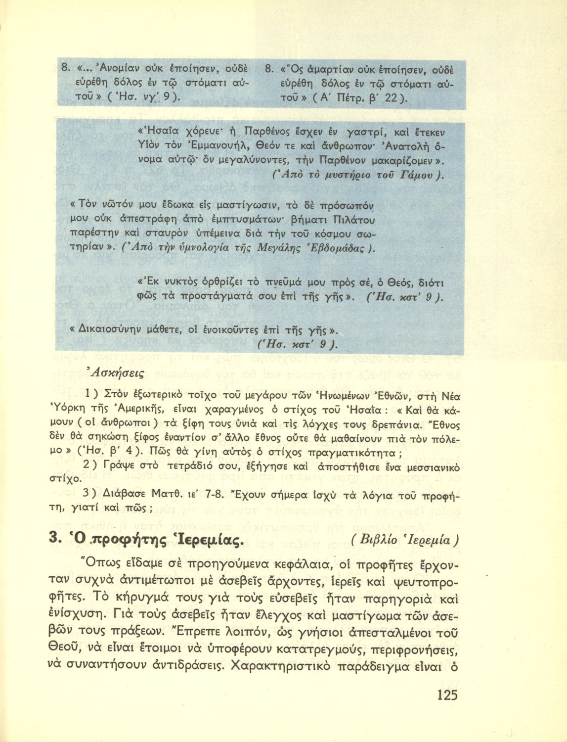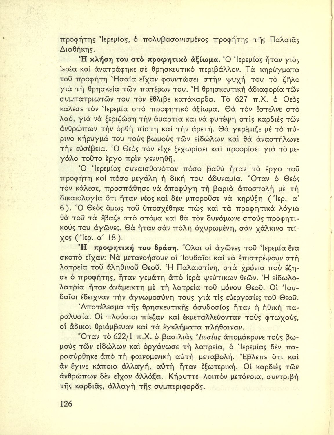 Σχολικό εγχειρίδιο Θρησκευτικών που περιλαμβάνει εισαγωγικά σχόλια στα βιβλία της Παλαιάς και Καινής Διαθήκης, περικοπές, ερμηνευτικές και πραγματολογικές σημειώσεις και πίνακα με τα κυριότερα ονόματα.
