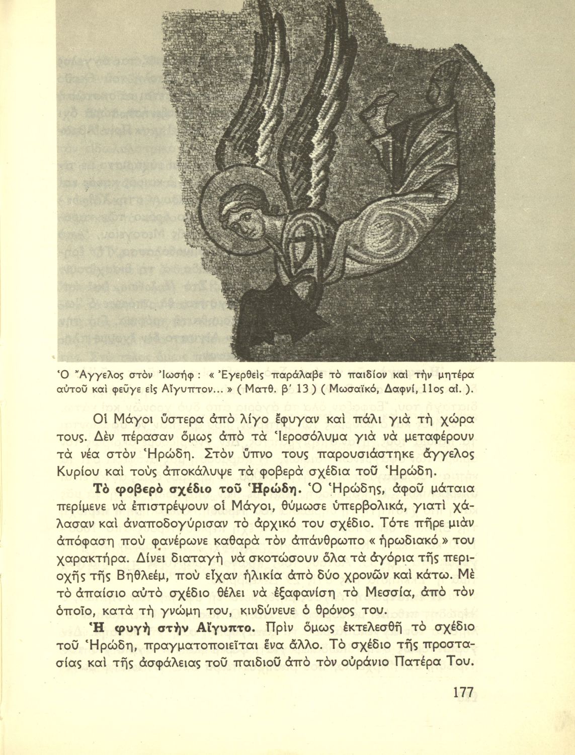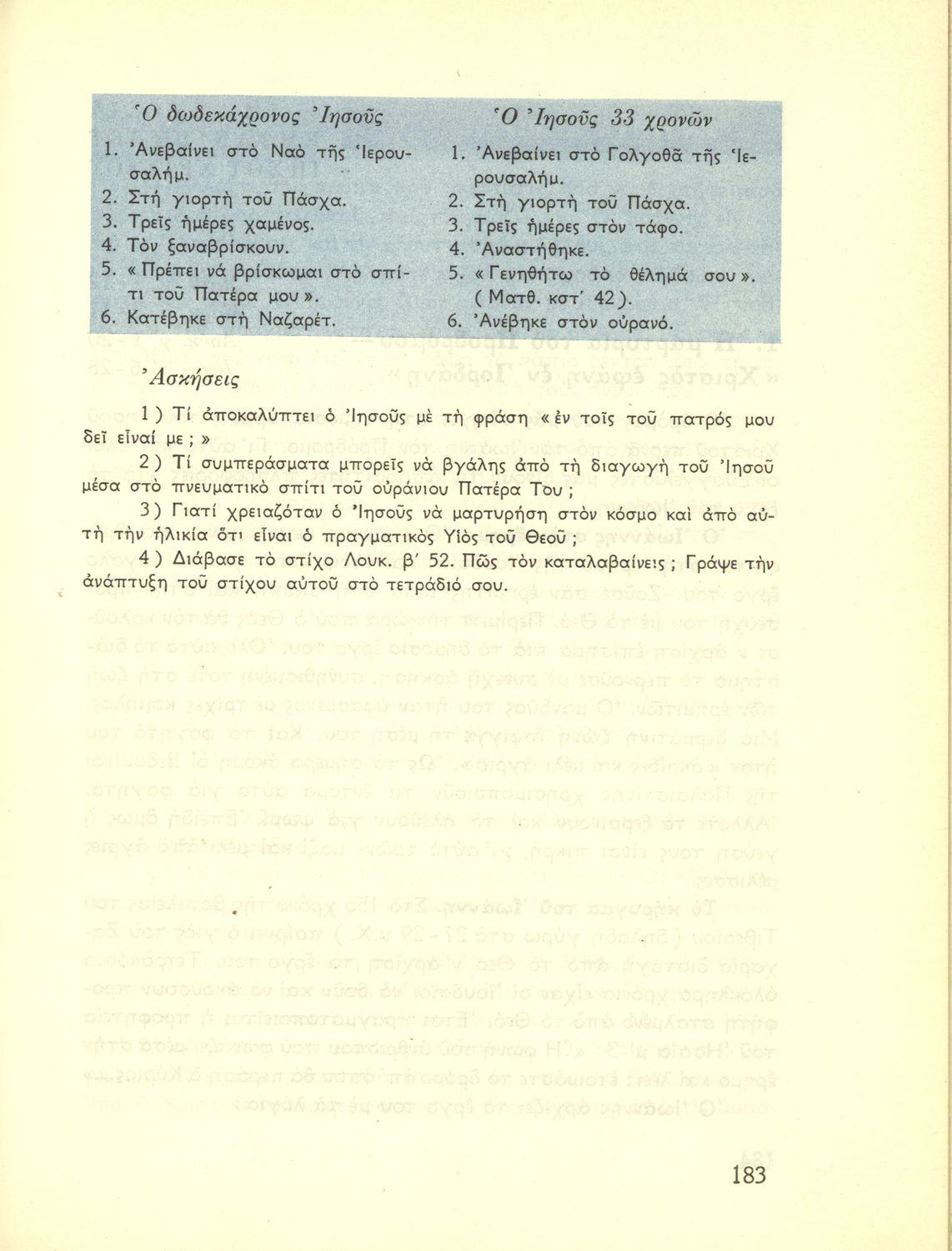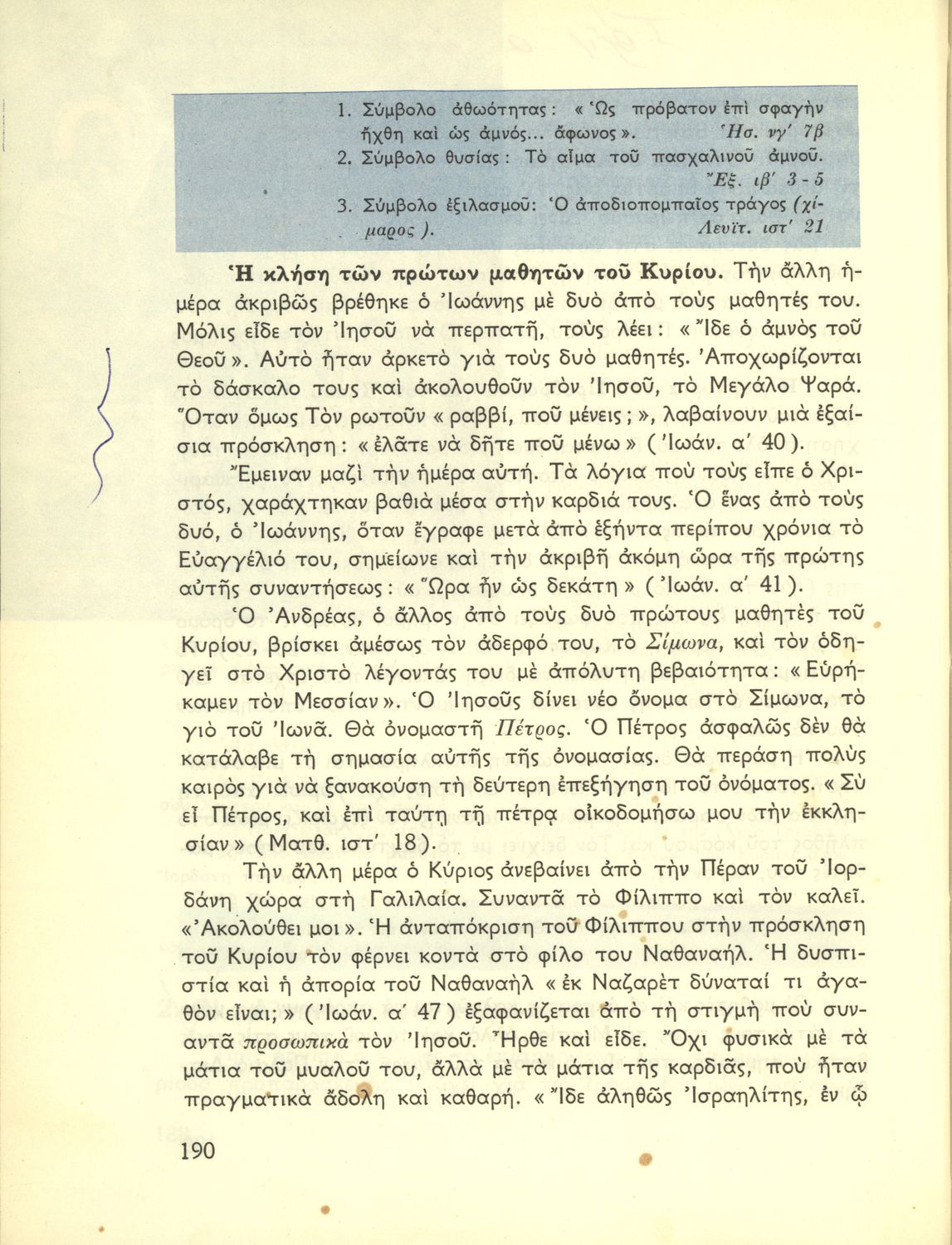 Σχολικό εγχειρίδιο Θρησκευτικών που περιλαμβάνει εισαγωγικά σχόλια στα βιβλία της Παλαιάς και Καινής Διαθήκης, περικοπές, ερμηνευτικές και πραγματολογικές σημειώσεις και πίνακα με τα κυριότερα ονόματα.