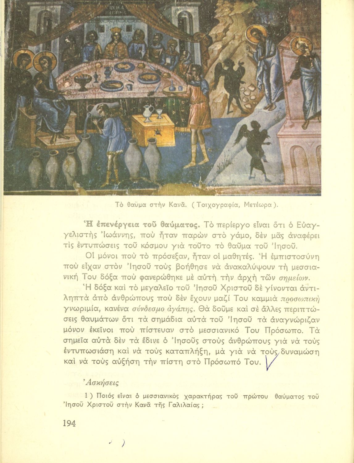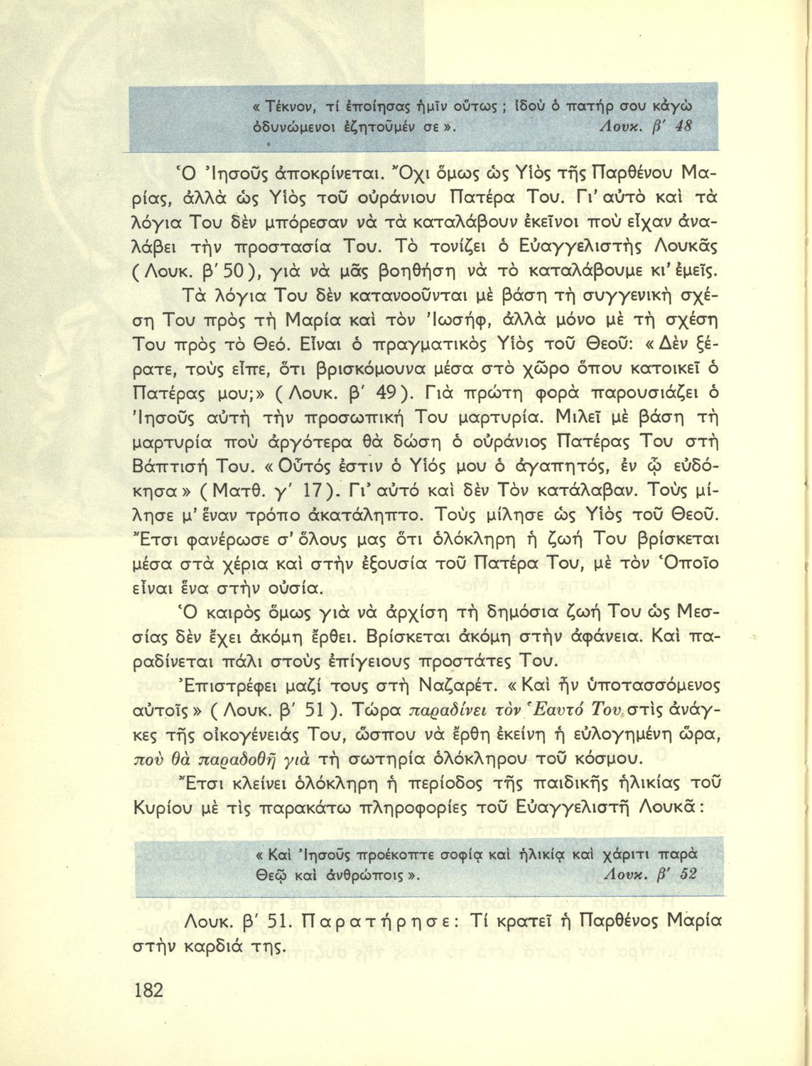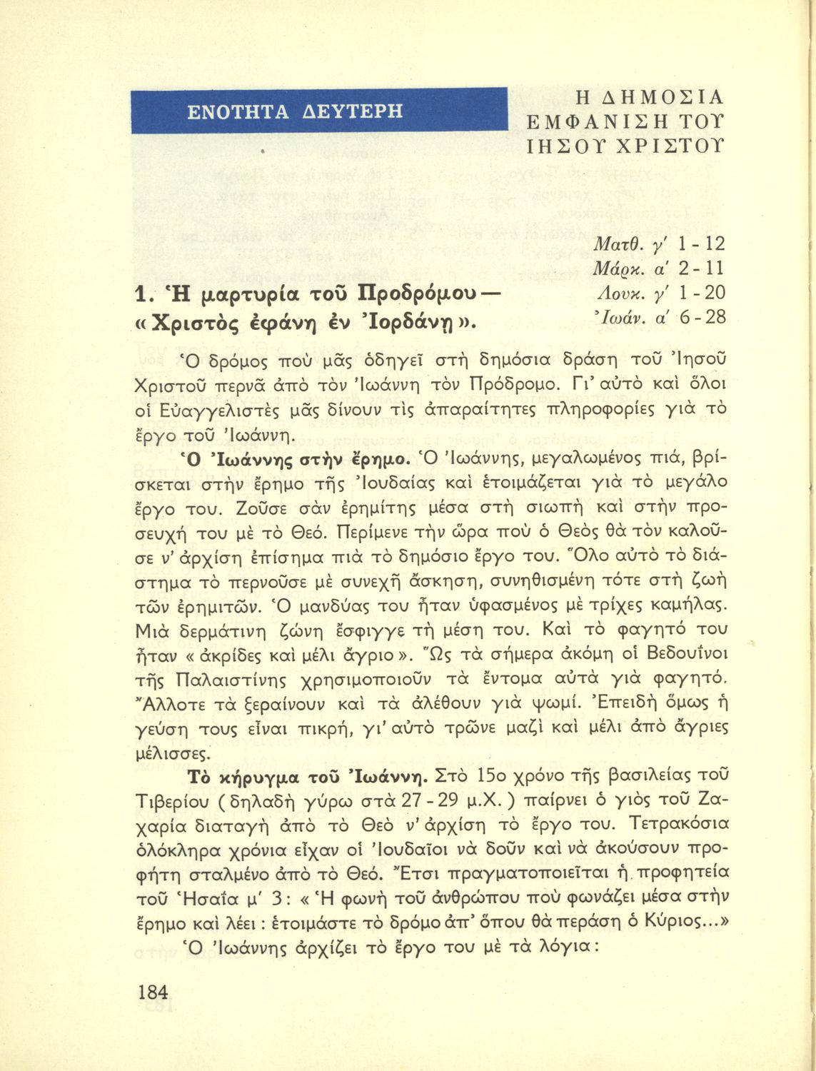 Σχολικό εγχειρίδιο Θρησκευτικών που περιλαμβάνει εισαγωγικά σχόλια στα βιβλία της Παλαιάς και Καινής Διαθήκης, περικοπές, ερμηνευτικές και πραγματολογικές σημειώσεις και πίνακα με τα κυριότερα ονόματα.