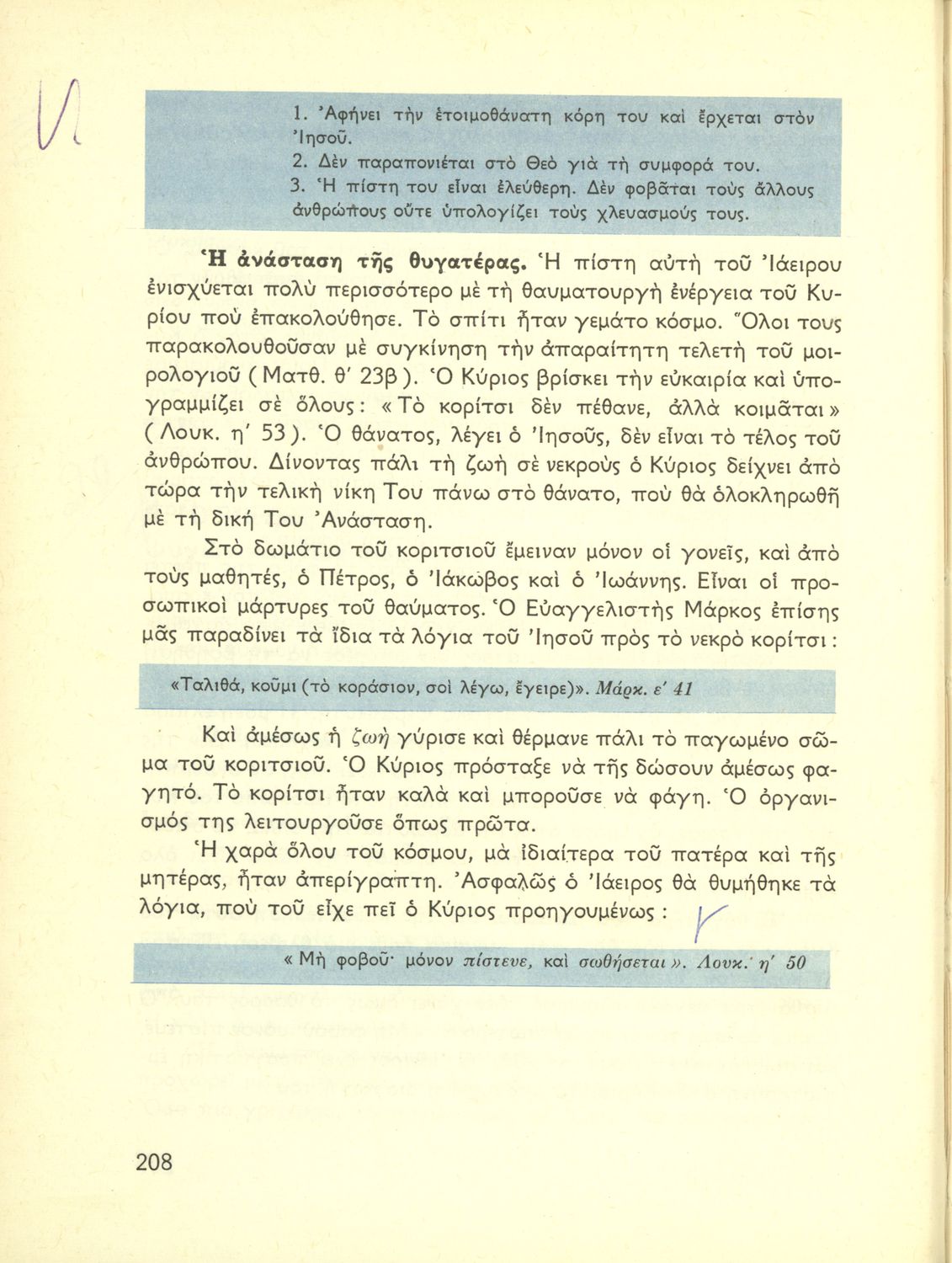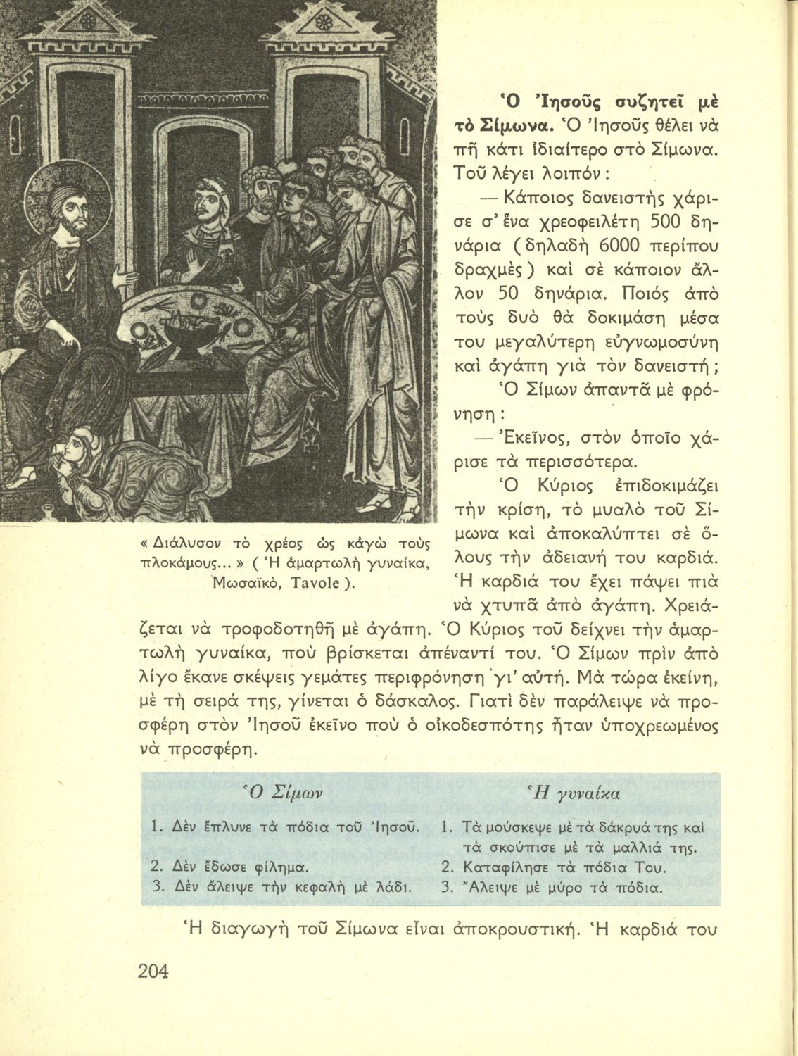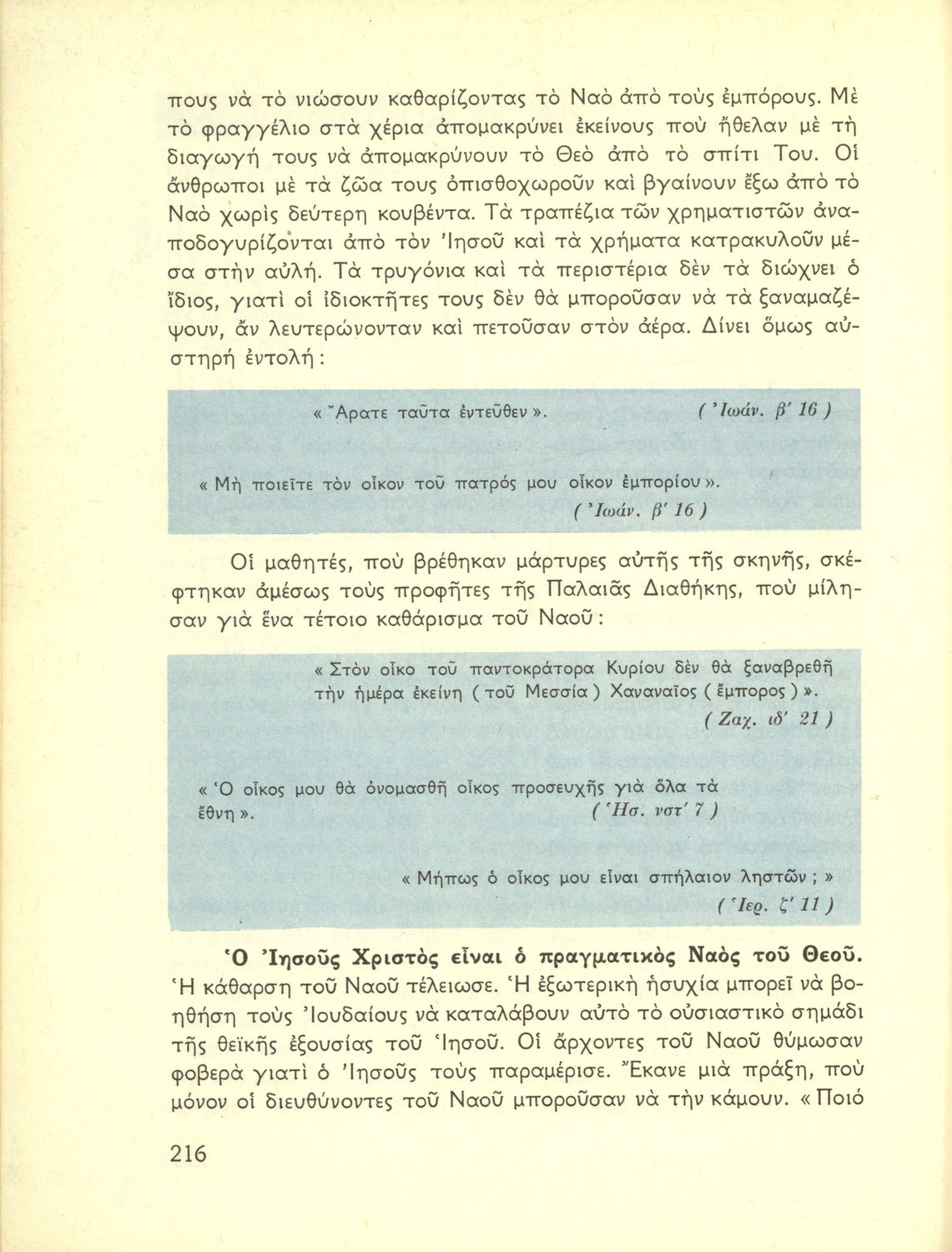 Σχολικό εγχειρίδιο Θρησκευτικών που περιλαμβάνει εισαγωγικά σχόλια στα βιβλία της Παλαιάς και Καινής Διαθήκης, περικοπές, ερμηνευτικές και πραγματολογικές σημειώσεις και πίνακα με τα κυριότερα ονόματα.