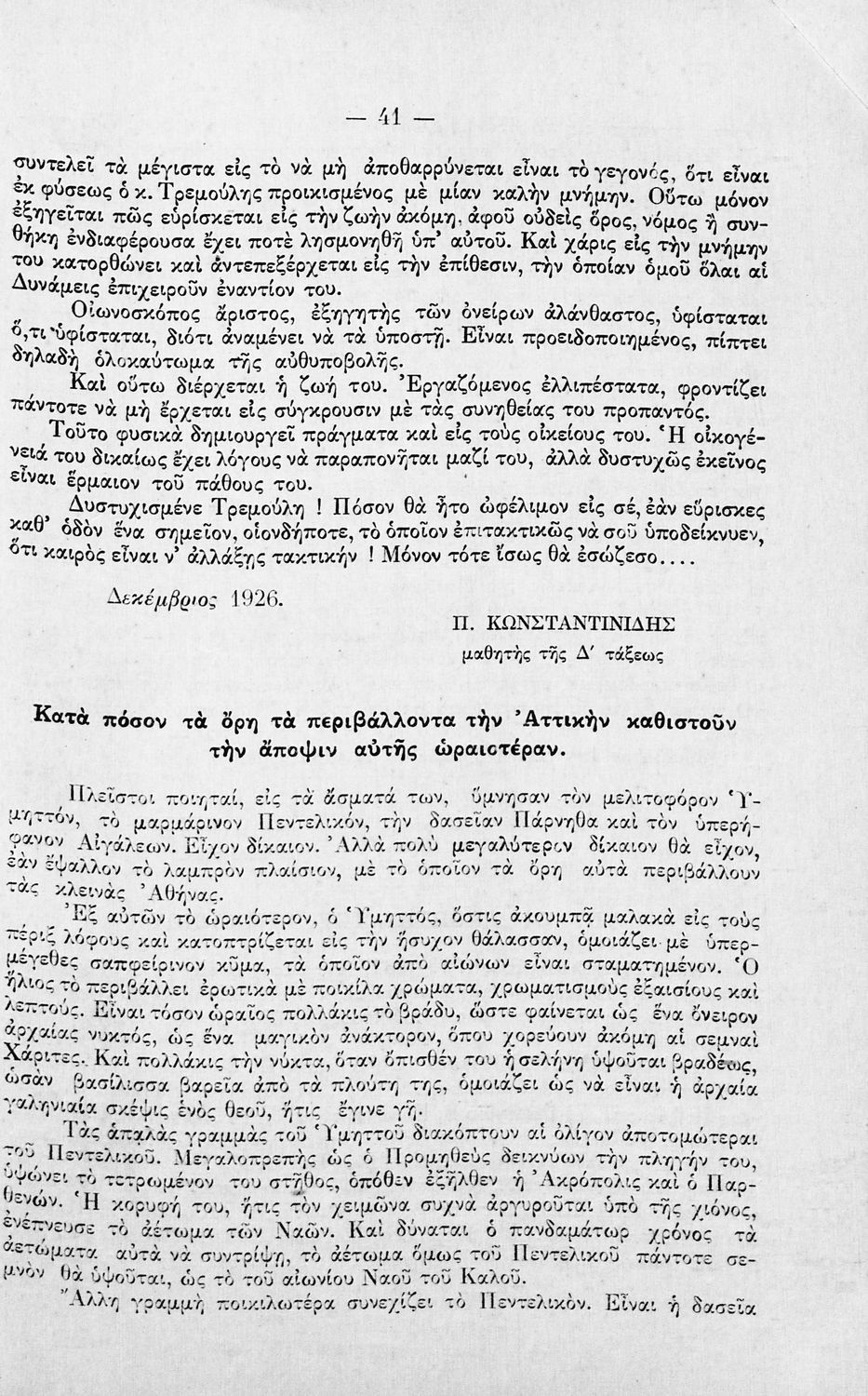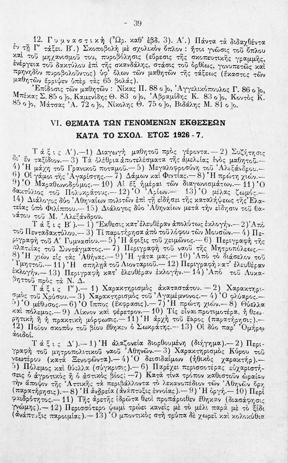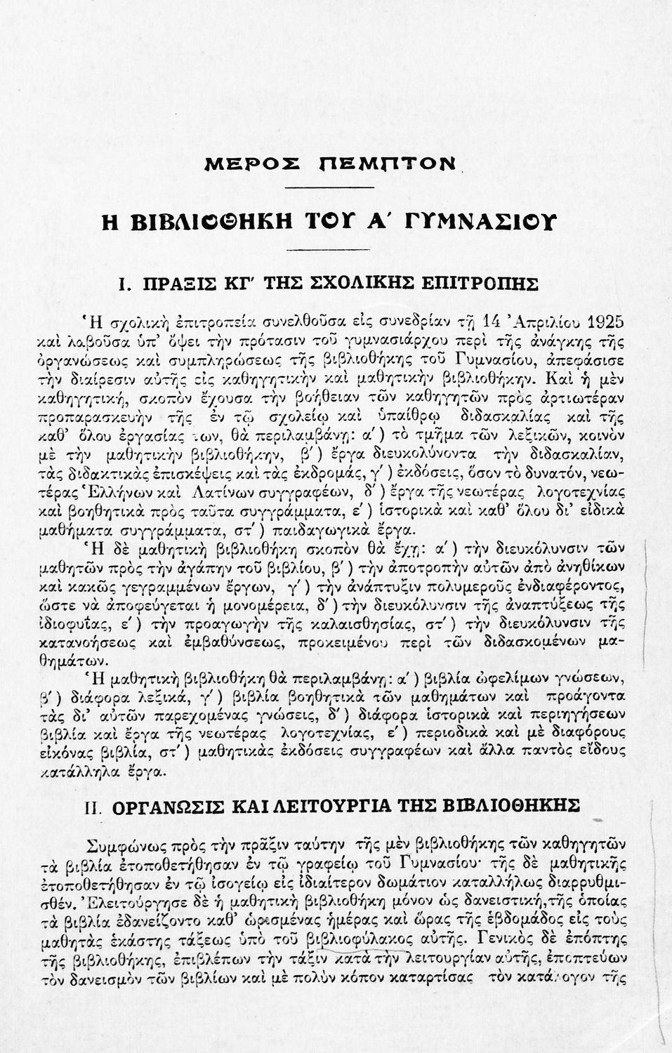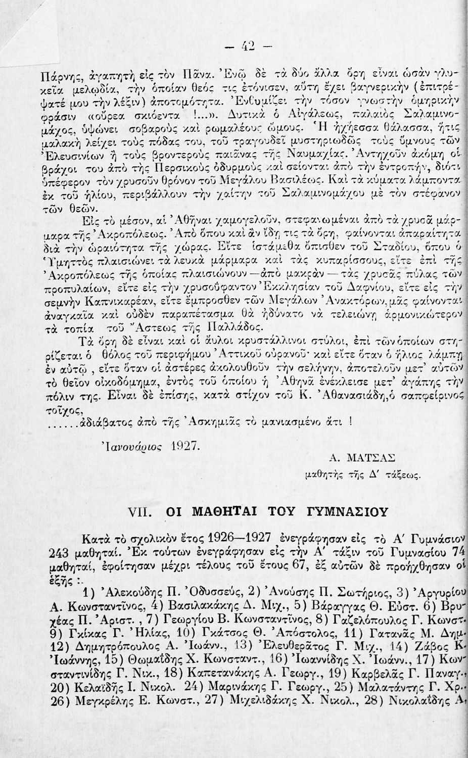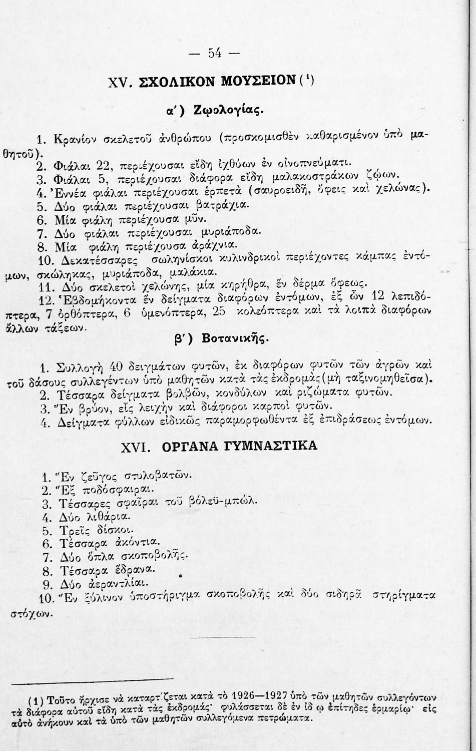 Έκδοση του Α΄ Γυμνασίου Αρρένων Αθηνών που περιλαμβάνει τον εσωτερικό κανονισμό του σχολείου και της μαθητικής κοινότητας, κατάλογο των εκδρομών και επισκέψεων για τα έτη 1925-1927, το αναλυτικό και ωρολόγιο πρόγραμμα, δύο μαθητικές εκθέσεις, τα ονόματα των μαθητών τις Α΄ Γυμνασίου που προήχθησαν, τα εποπτικά μέσα του σχολείου, και κατάλογο της βιβλιοθήκης . Ο επιμελητής της ήταν Γυμνασιάρχης του Σχολείου. Στο οπισθόφυλλο υπάρχει σκίτσο ασπρόμαυρου χάρτη από εκδρομή των μαθητών στην Επίδαυρο
