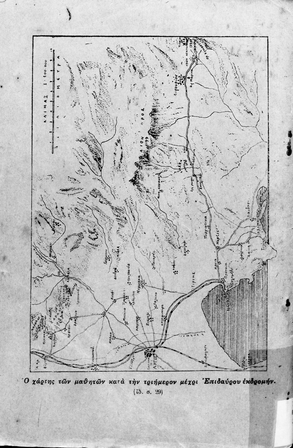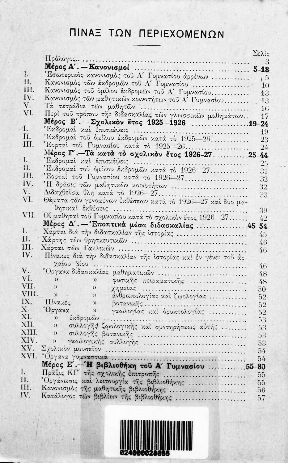 Έκδοση του Α΄ Γυμνασίου Αρρένων Αθηνών που περιλαμβάνει τον εσωτερικό κανονισμό του σχολείου και της μαθητικής κοινότητας, κατάλογο των εκδρομών και επισκέψεων για τα έτη 1925-1927, το αναλυτικό και ωρολόγιο πρόγραμμα, δύο μαθητικές εκθέσεις, τα ονόματα των μαθητών τις Α΄ Γυμνασίου που προήχθησαν, τα εποπτικά μέσα του σχολείου, και κατάλογο της βιβλιοθήκης . Ο επιμελητής της ήταν Γυμνασιάρχης του Σχολείου. Στο οπισθόφυλλο υπάρχει σκίτσο ασπρόμαυρου χάρτη από εκδρομή των μαθητών στην Επίδαυρο
