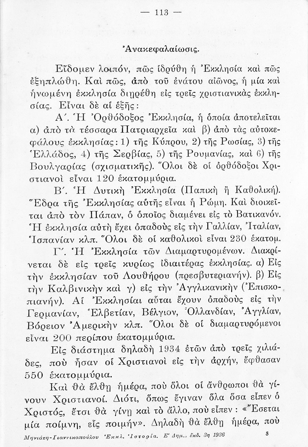 LDR 01532 2200217 4500 035 ## _a01-18820 040 ## _aΙνστιτούτο Εκπαιδευτικής Πολιτικής 041 ## _ael 100 ## _aΗλίας Π. Μηνιάτης _aΓ. Λ. Γιαννικόπουλος 110 ## _a18820 245 0# _aΕκκλησιαστική ιστορία εγκεκριμένη δια την Ε΄ τάξιν των Δημοτικών Σχολείων και τας συνδιδασκομένας κατά το πρώτον έτος Ε΄ και ΣΤ΄ τάξεις 250 ## _a3η Έκδοση 260 ## _aΑθήνα _bΙωάννης Δ. Κολλάρος _c1936 300 ## _a119 _bΕικόνες (ασπρόμαυρες) _c20 520 ## _aΣχολικό εγχειρίδιο Θρησκευτικών Ε΄ Δημοτικού που αποτελεί μια ιστορική επισκόπηση της Ορθόδοξης Εκκλησίας από την ίδρυσή της μέχρι την ίδρυση της Εκκλησίας της Ελλάδας και πραγματεύεται τις σχέσεις της Ορθοδοξίας με τα άλλα χριστιανικά δόγμα. 521 ## _aΕ' Δημοτικού 522 ## _aΕλλάδα 546 ## _aΚαθαρεύουσα 563 ## _aΣκληρό Εξώφυλλο 583 ## _a5231/51232/20-8-1934 _c1934 650 #4 _aΑπόστολοι _aΕικονομαχίες _aΕυαγγελιστές _aΠατέρες της Εκκλησίας _aΠατριαρχεία _aΣχίσμα