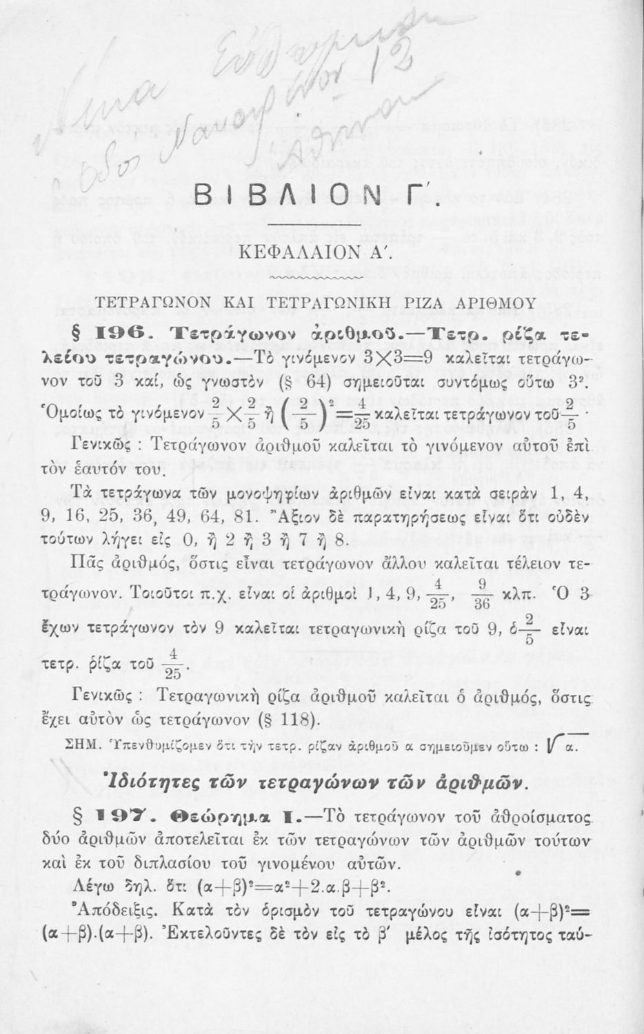 Σχολικό εγχειρίδιο Αριθμητικής για τα Γυμνάσια και Λύκεια που εστιάζει στις αριθμητικές πράξεις με ακέραιους αριθμούς και κλάσματα και είναι χωρισμένο σε ορισμούς, θεωρήματα και ασκήσεις.