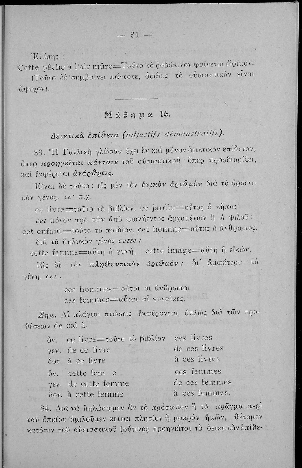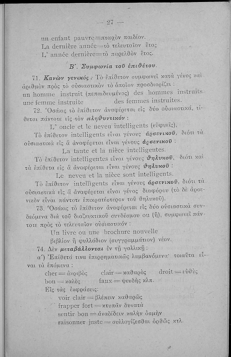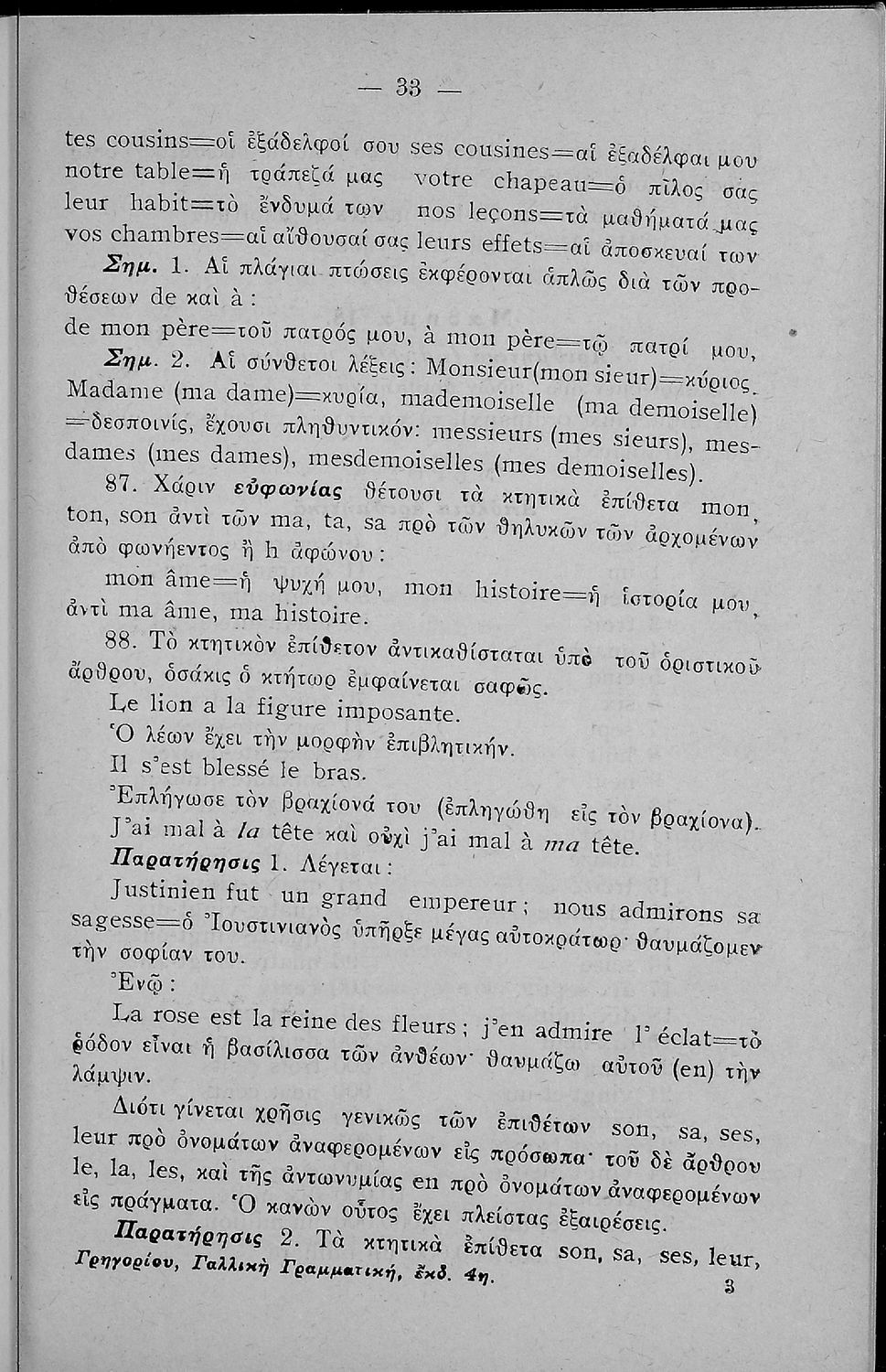 Γραμματική της Γαλλικής γλώσσας για τα Τετρατάξια Γυμνάσια, τη Γ΄ τάξη των Αστικών Σχολείων των Θηλέων και τα Διδασκαλεία της Δημοτικής Εκπαίδευσης που περιλαμβάνει θεωρία, ασκήσεις και λεξιλόγιο.