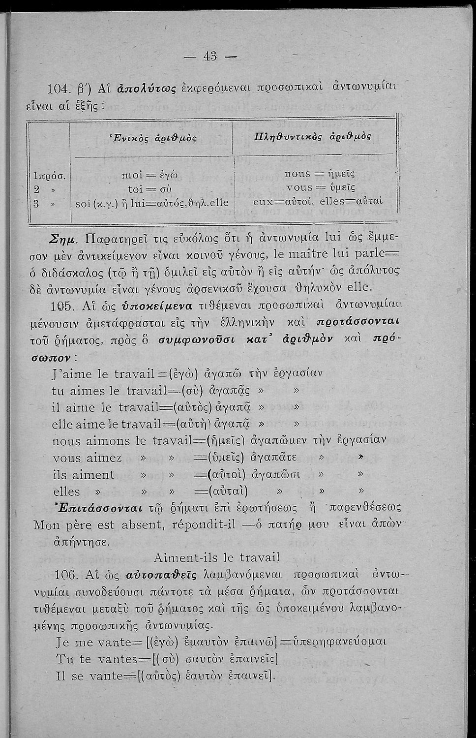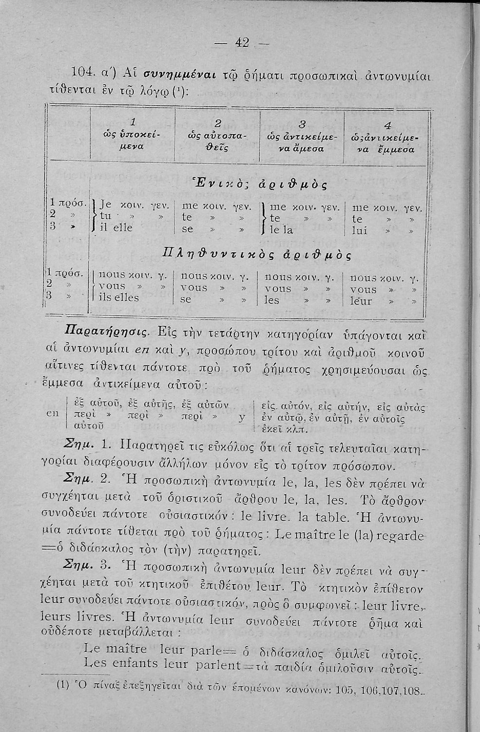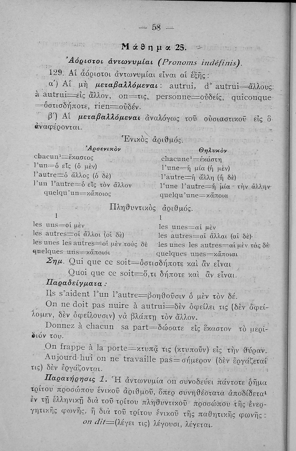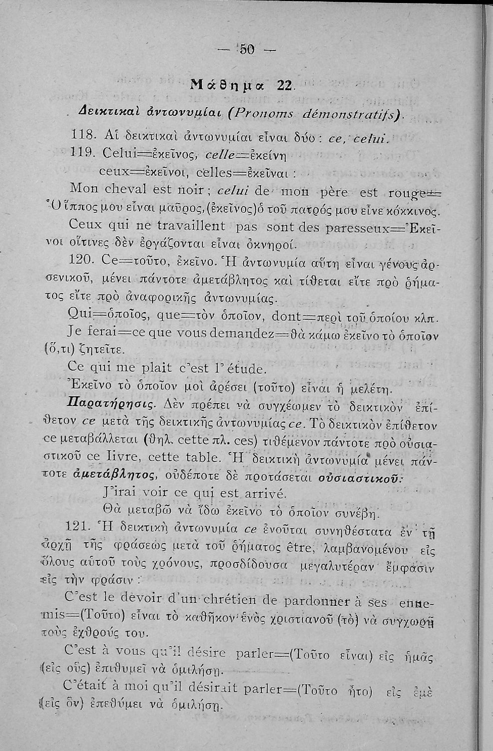 Γραμματική της Γαλλικής γλώσσας για τα Τετρατάξια Γυμνάσια, τη Γ΄ τάξη των Αστικών Σχολείων των Θηλέων και τα Διδασκαλεία της Δημοτικής Εκπαίδευσης που περιλαμβάνει θεωρία, ασκήσεις και λεξιλόγιο.