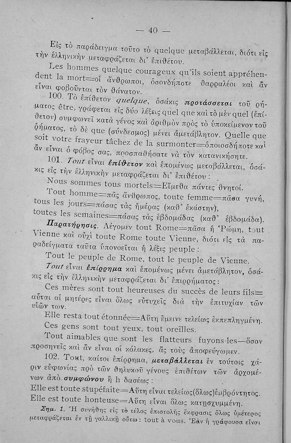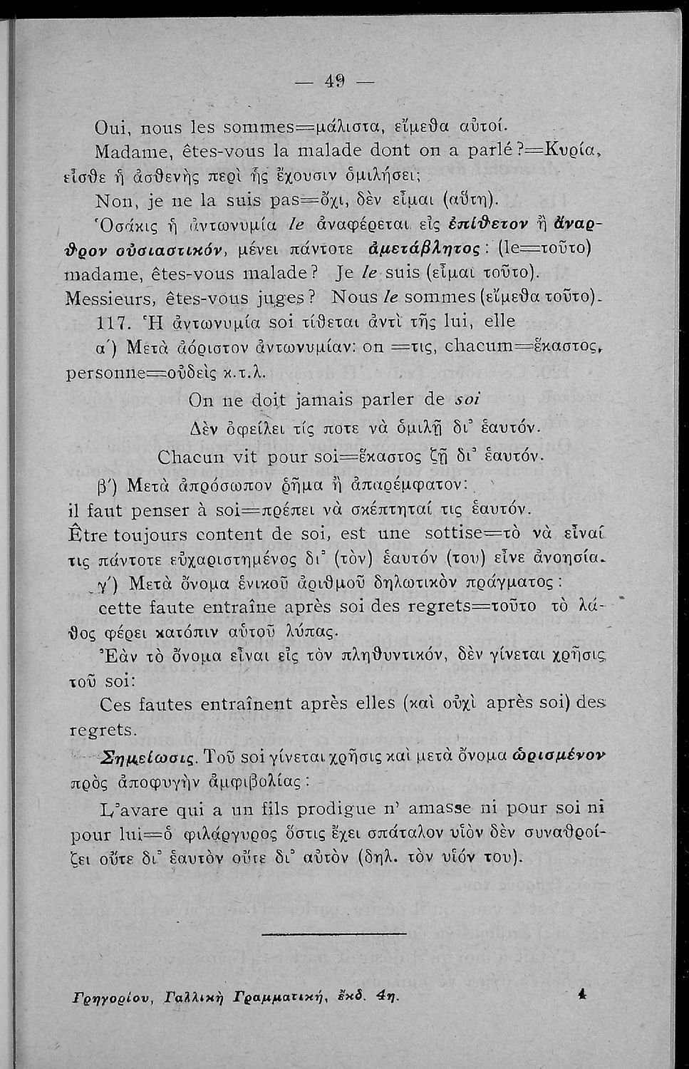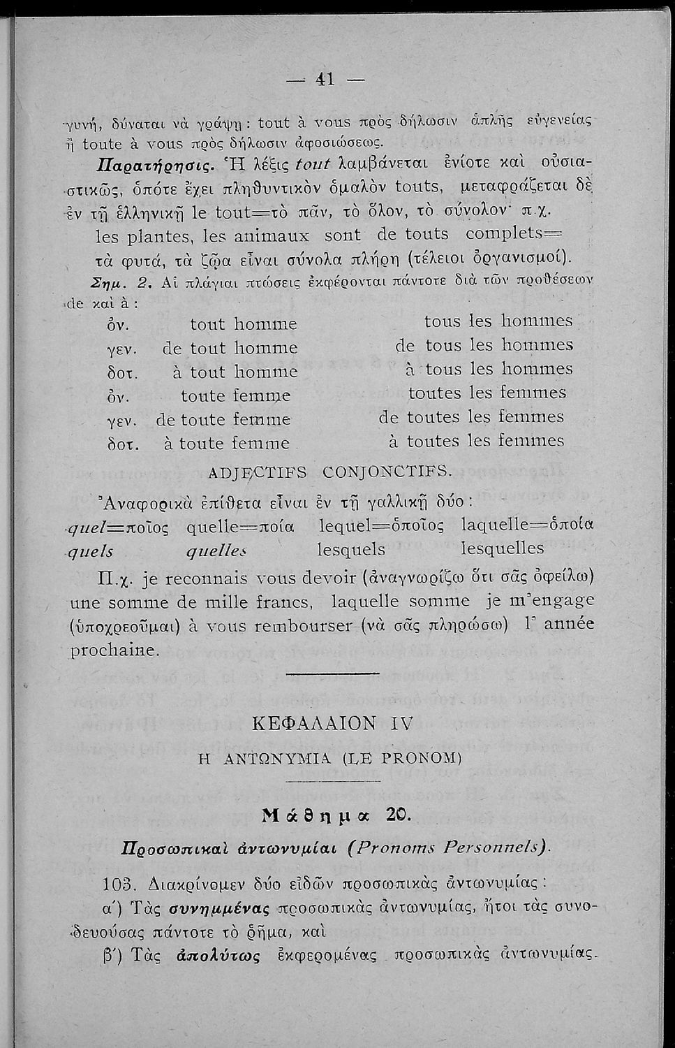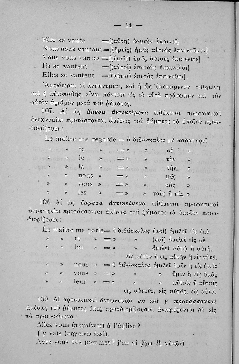Γραμματική της Γαλλικής γλώσσας για τα Τετρατάξια Γυμνάσια, τη Γ΄ τάξη των Αστικών Σχολείων των Θηλέων και τα Διδασκαλεία της Δημοτικής Εκπαίδευσης που περιλαμβάνει θεωρία, ασκήσεις και λεξιλόγιο.