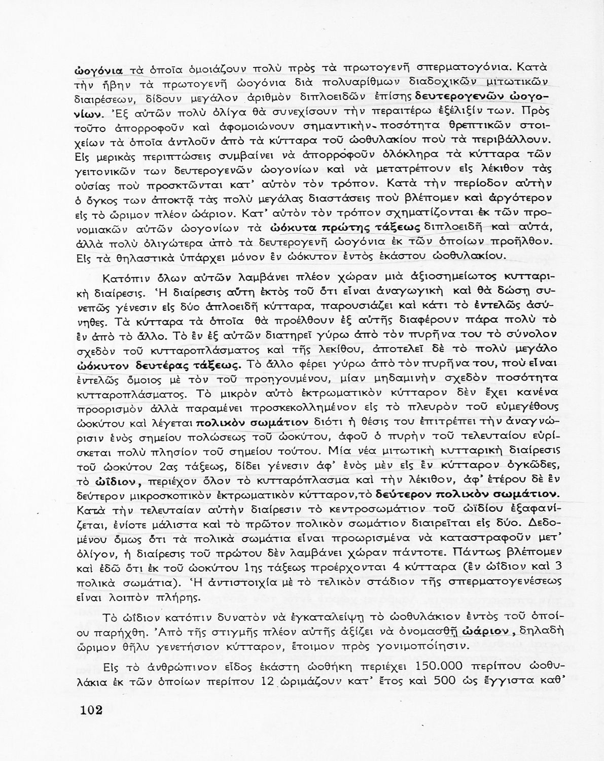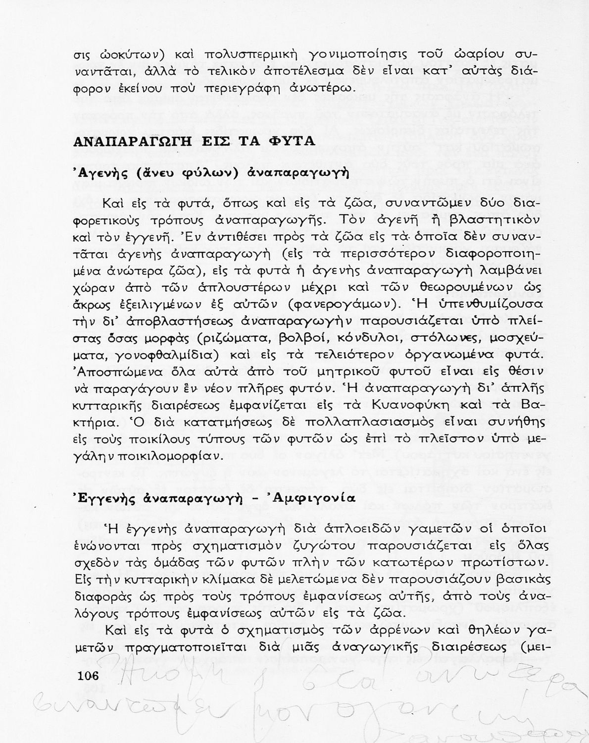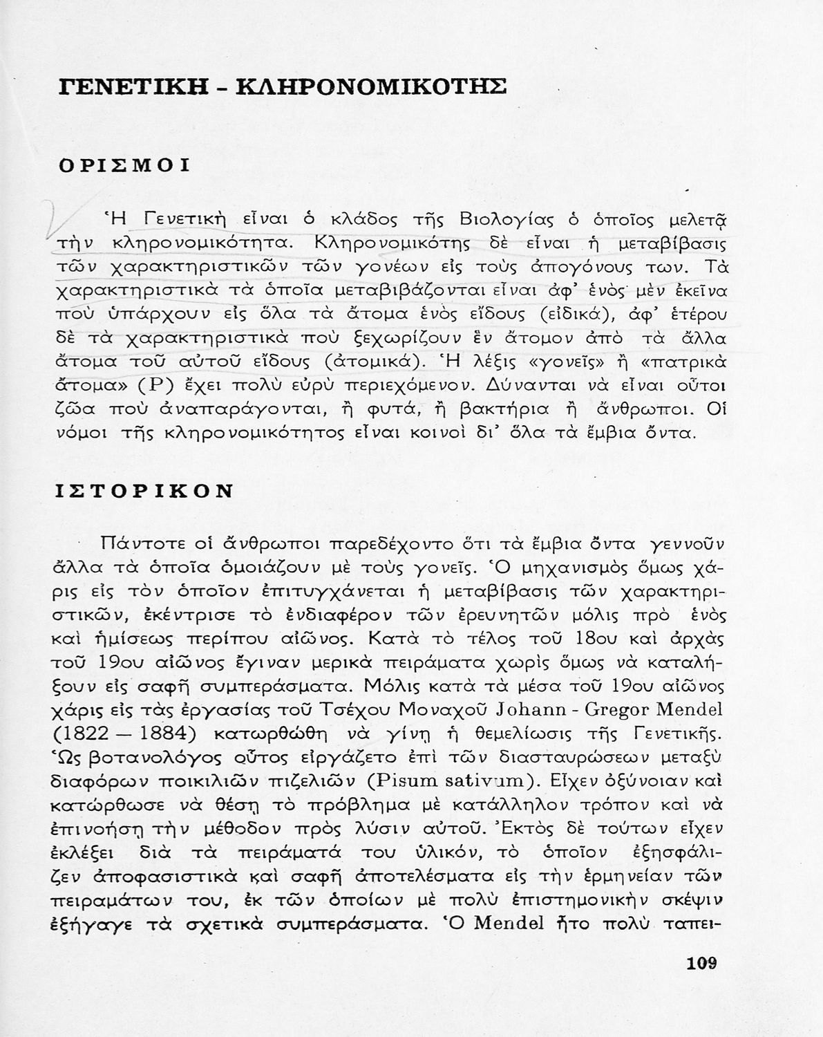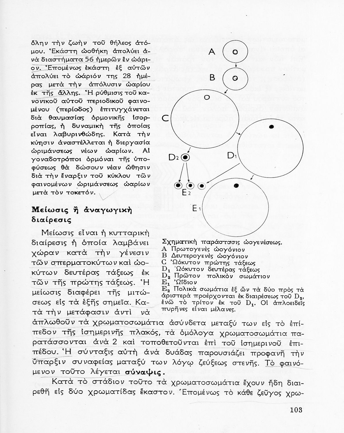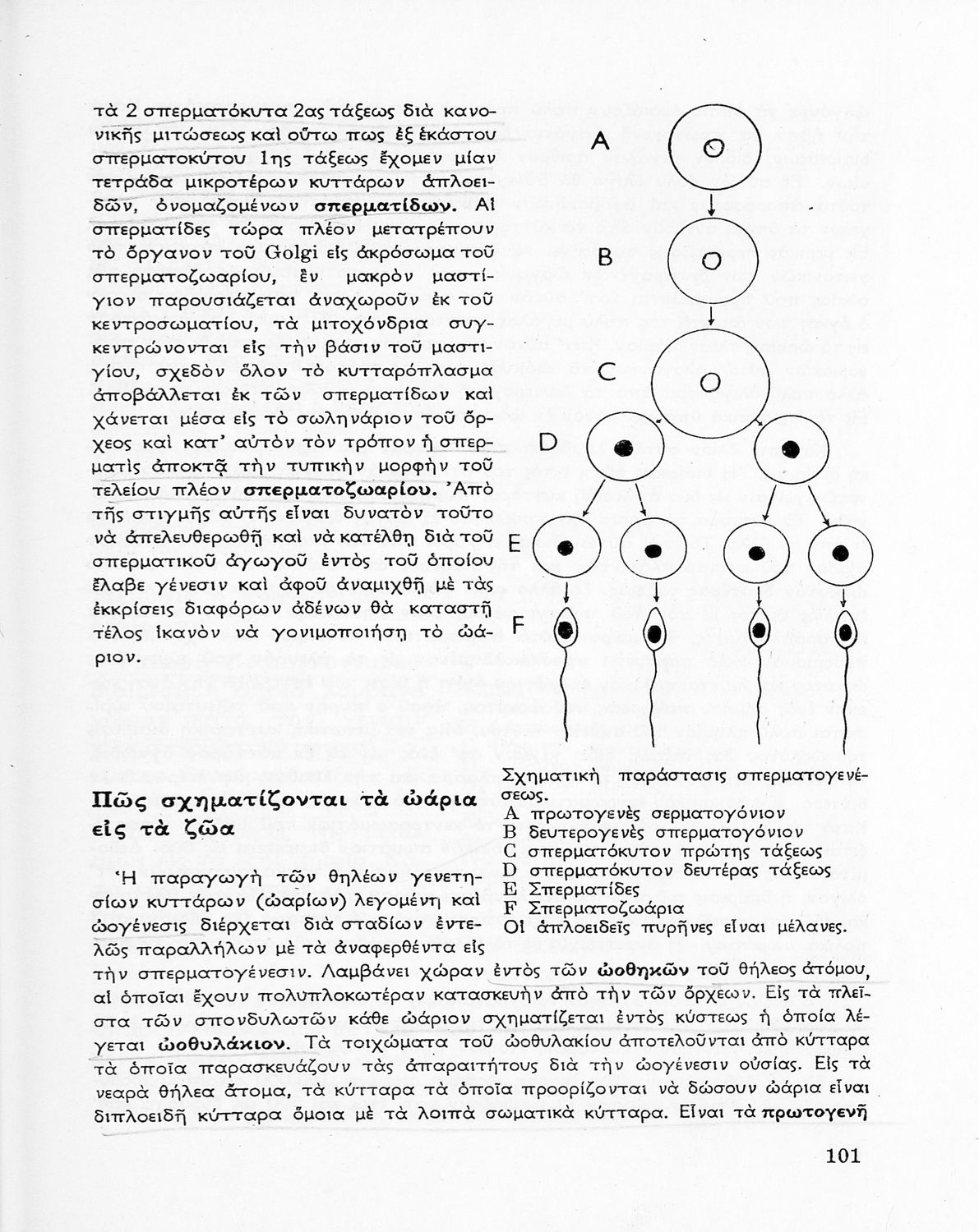 Σχολικό εγχειρίδιο Βιολογίας ΣΤ΄ Γυμνασίου που εστιάζει στις συνθήκες γέννησης, μεταβολής και θανάτου των έμβιων οργανισμών. Φέρει το σύμβολο της δικτατορίας. Ο συγγραφέας ήταν υφηγητής του Πανεπιστημίου Αθηνών.