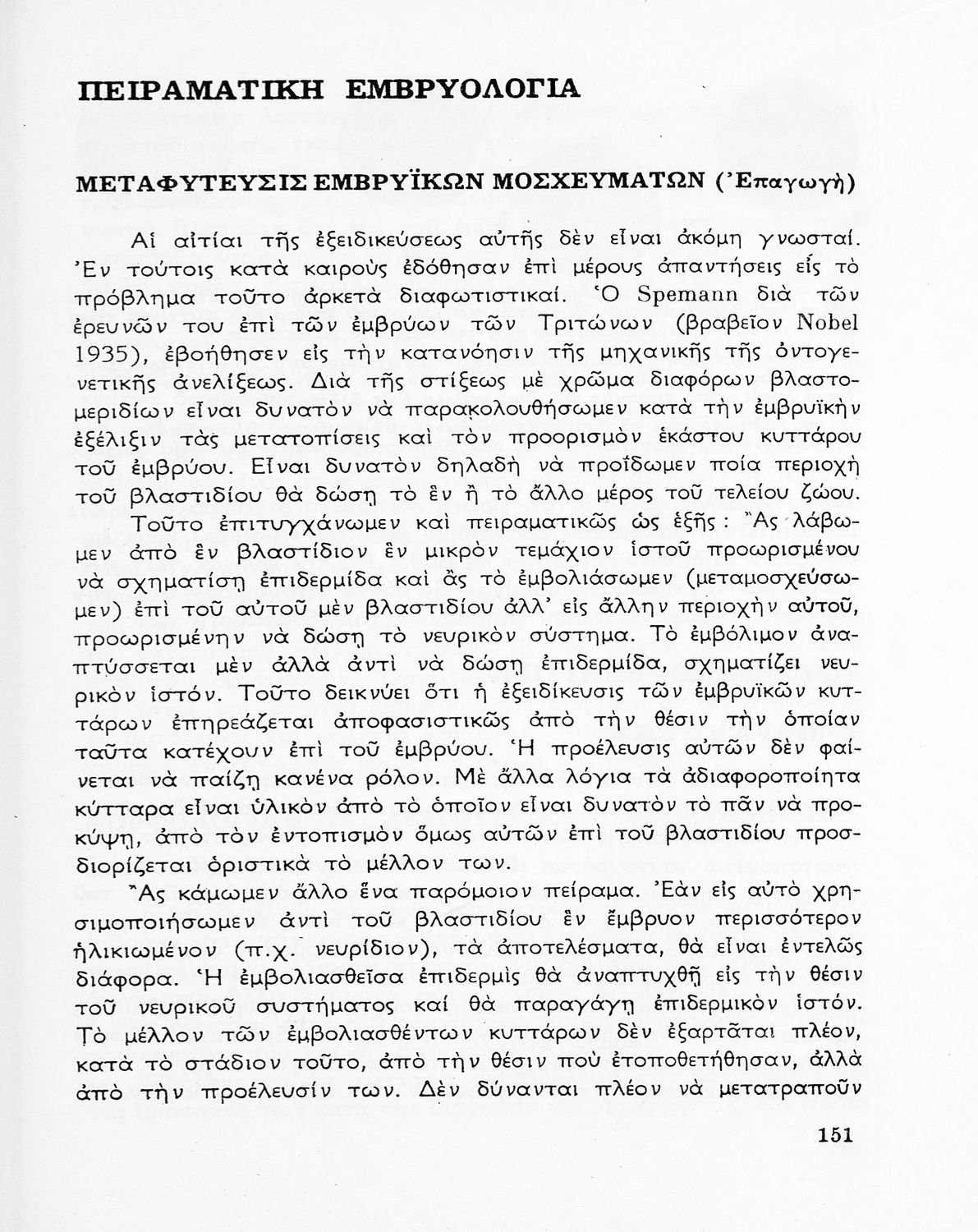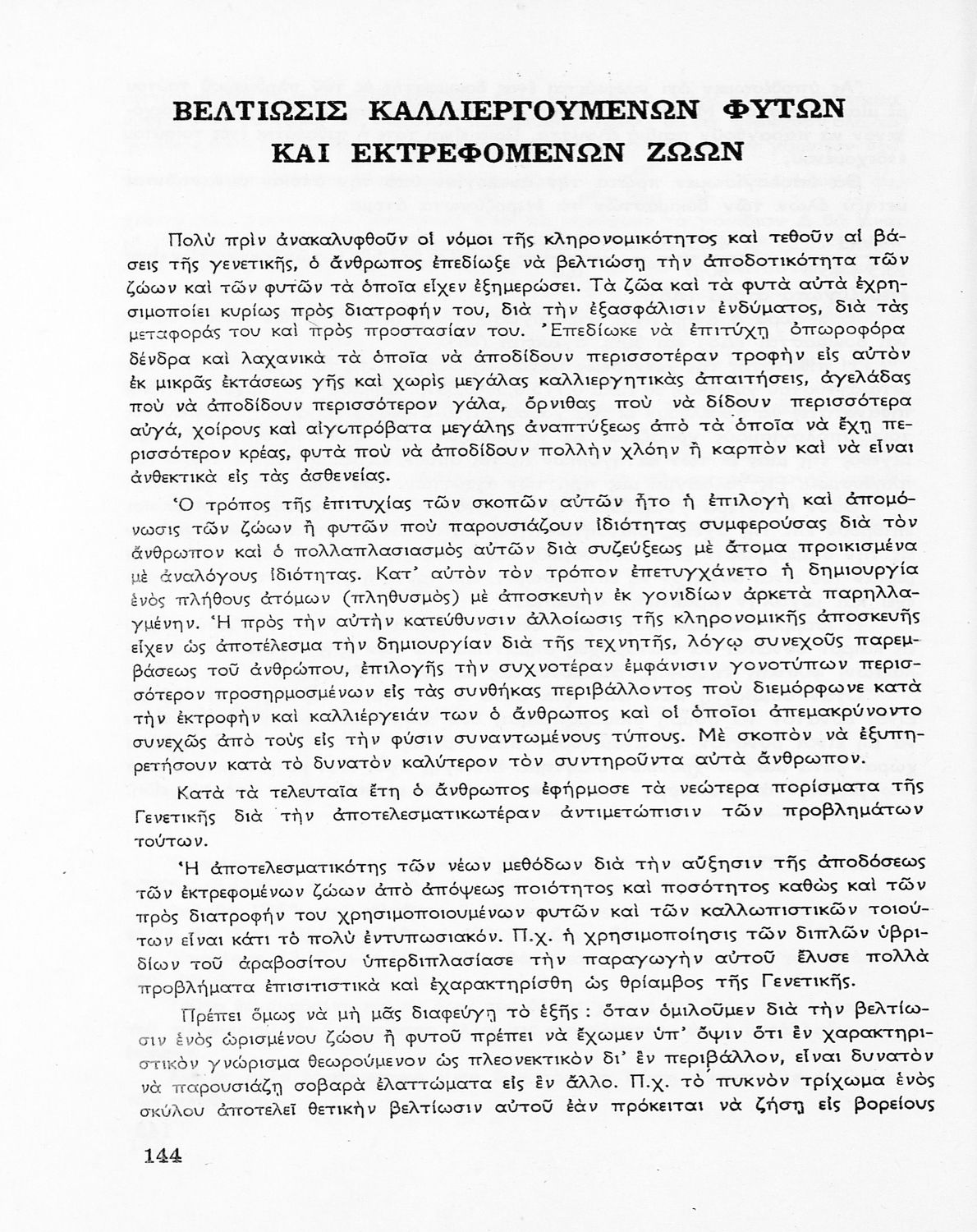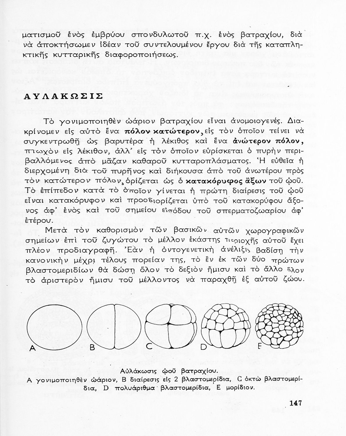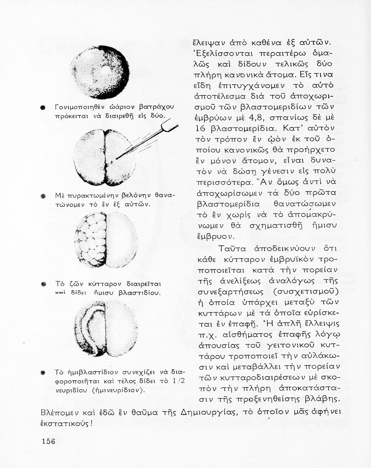 Σχολικό εγχειρίδιο Βιολογίας ΣΤ΄ Γυμνασίου που εστιάζει στις συνθήκες γέννησης, μεταβολής και θανάτου των έμβιων οργανισμών. Φέρει το σύμβολο της δικτατορίας. Ο συγγραφέας ήταν υφηγητής του Πανεπιστημίου Αθηνών.
