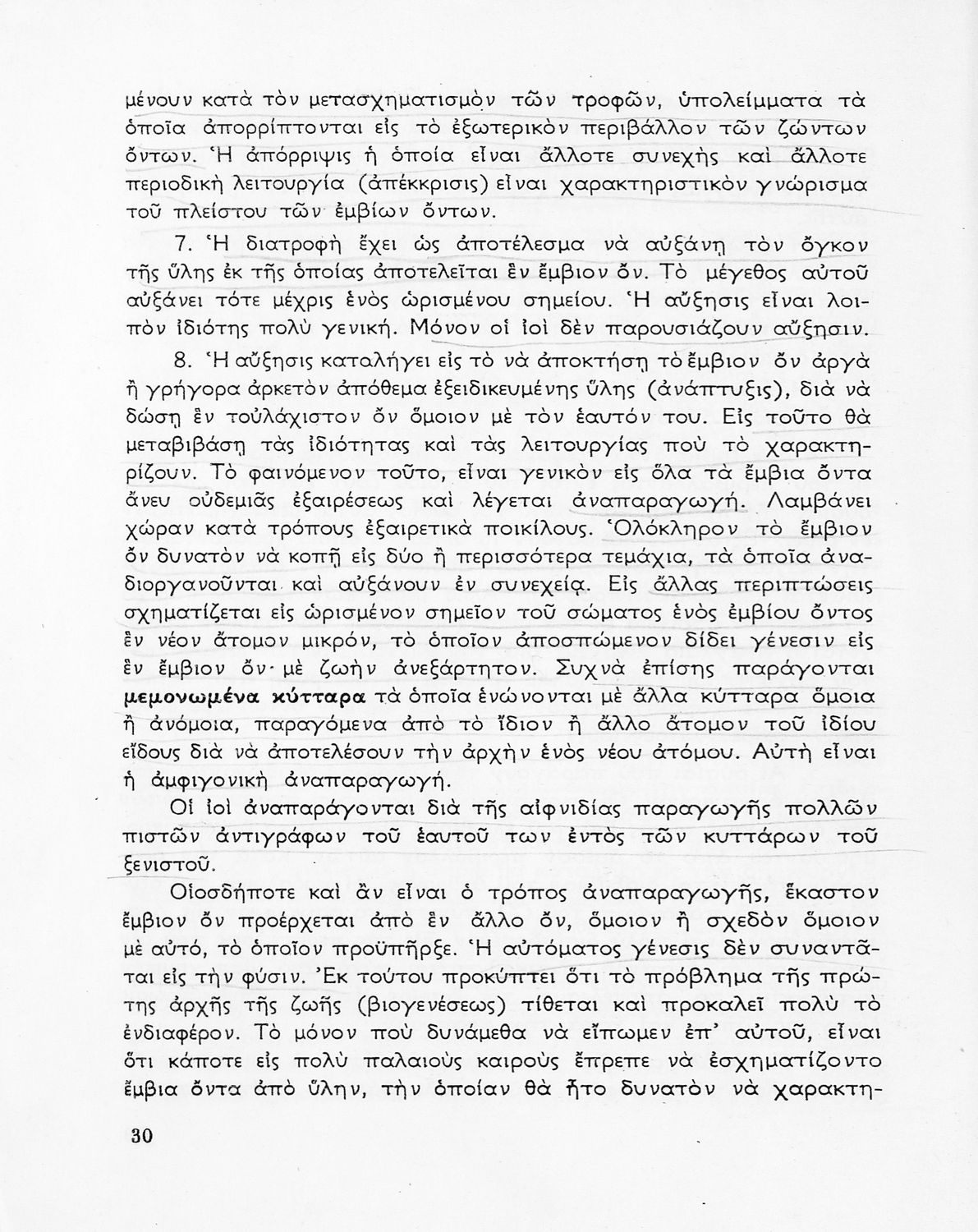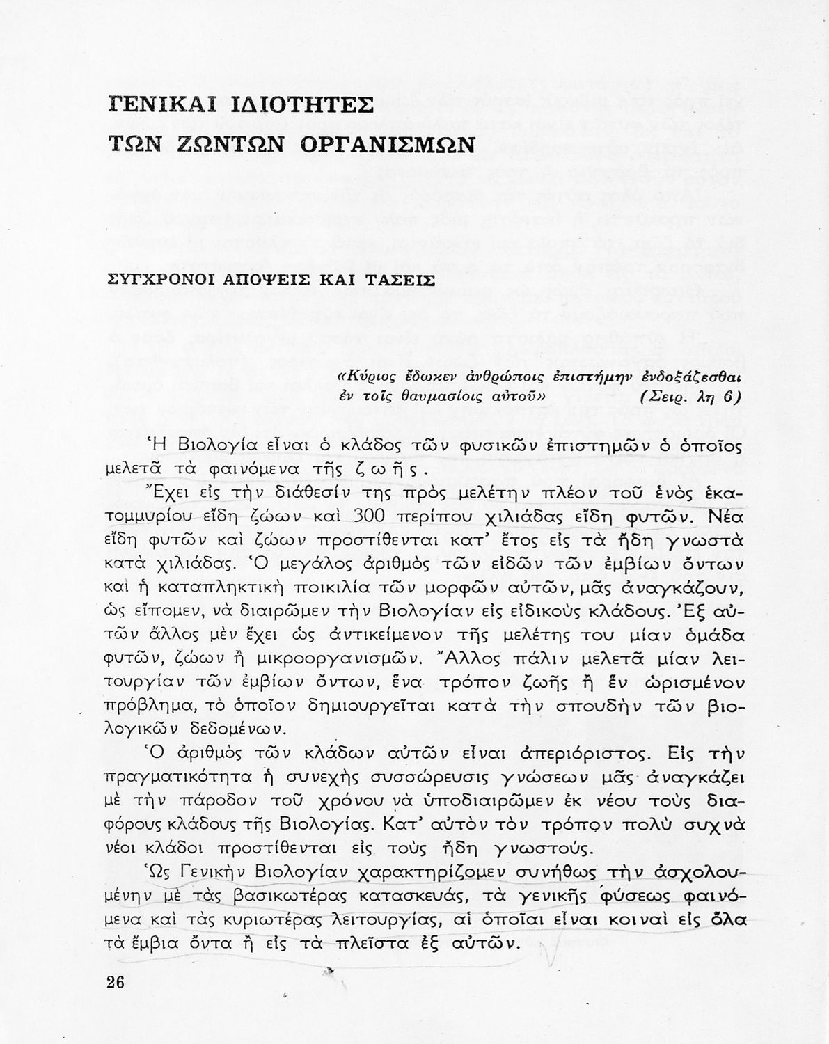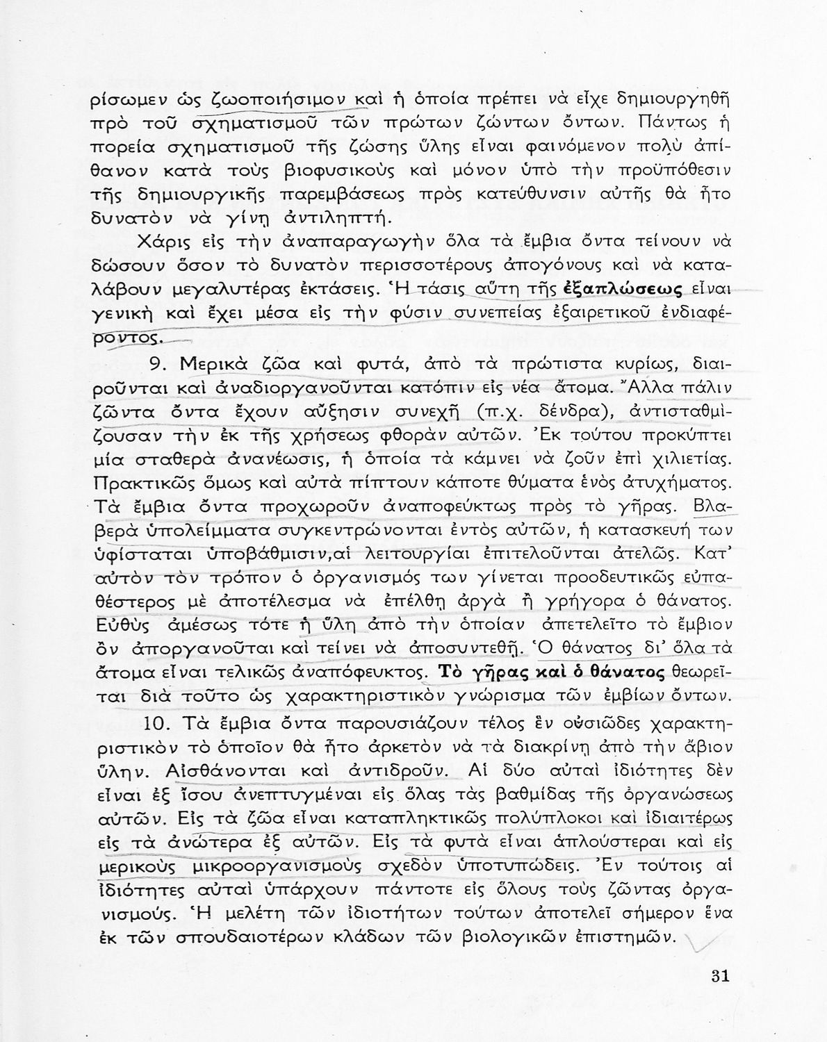 Σχολικό εγχειρίδιο Βιολογίας ΣΤ΄ Γυμνασίου που εστιάζει στις συνθήκες γέννησης, μεταβολής και θανάτου των έμβιων οργανισμών. Φέρει το σύμβολο της δικτατορίας. Ο συγγραφέας ήταν υφηγητής του Πανεπιστημίου Αθηνών.