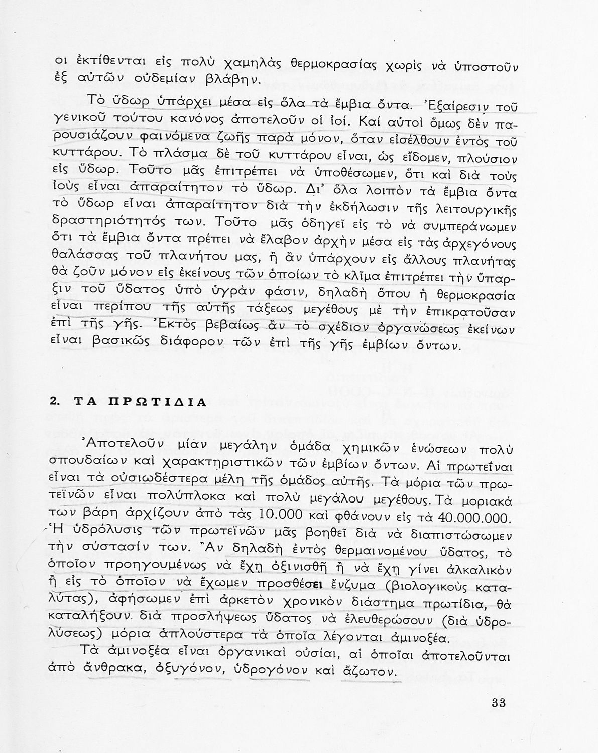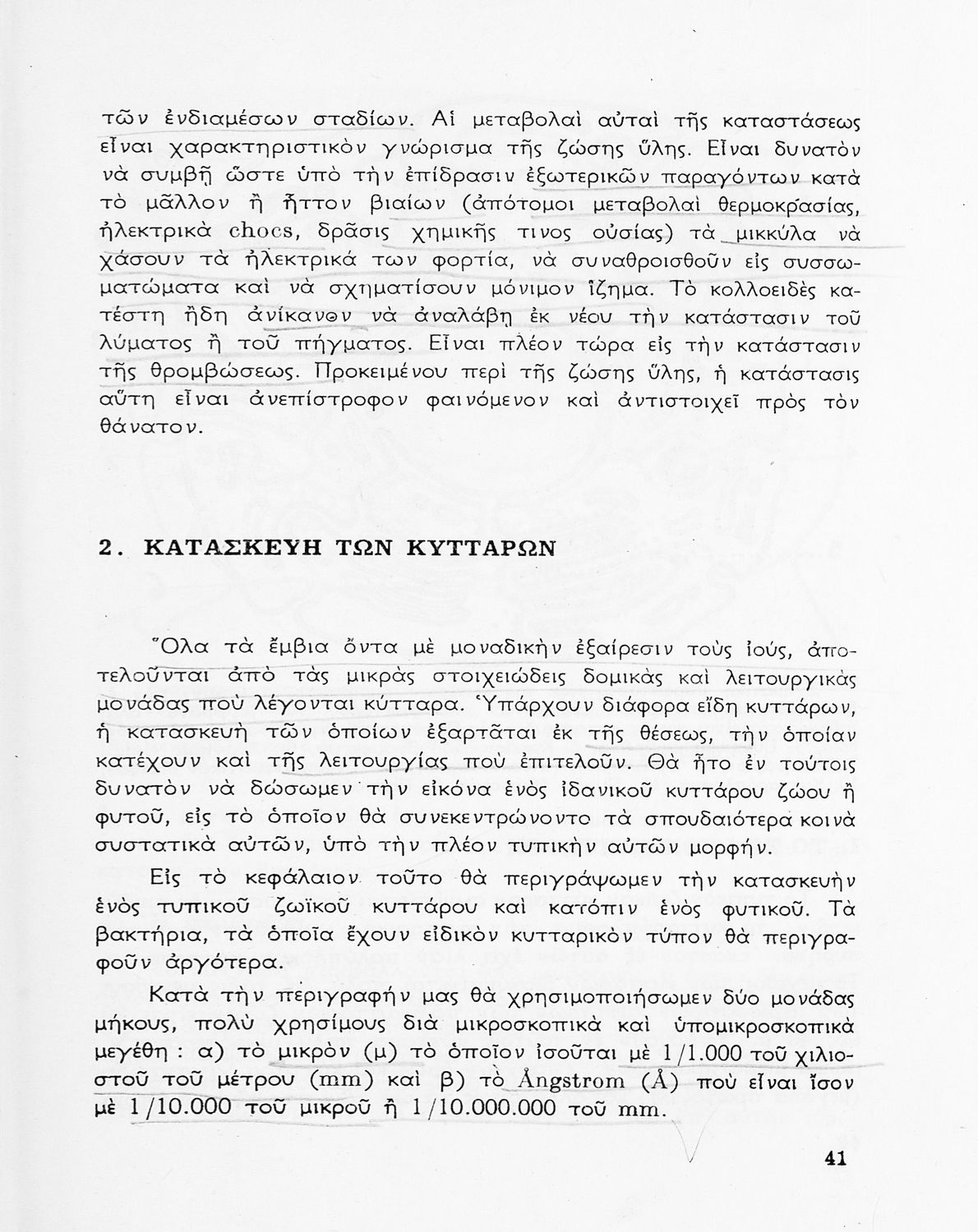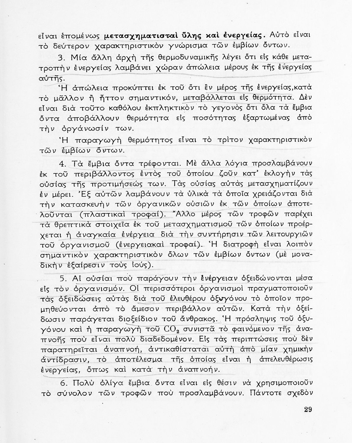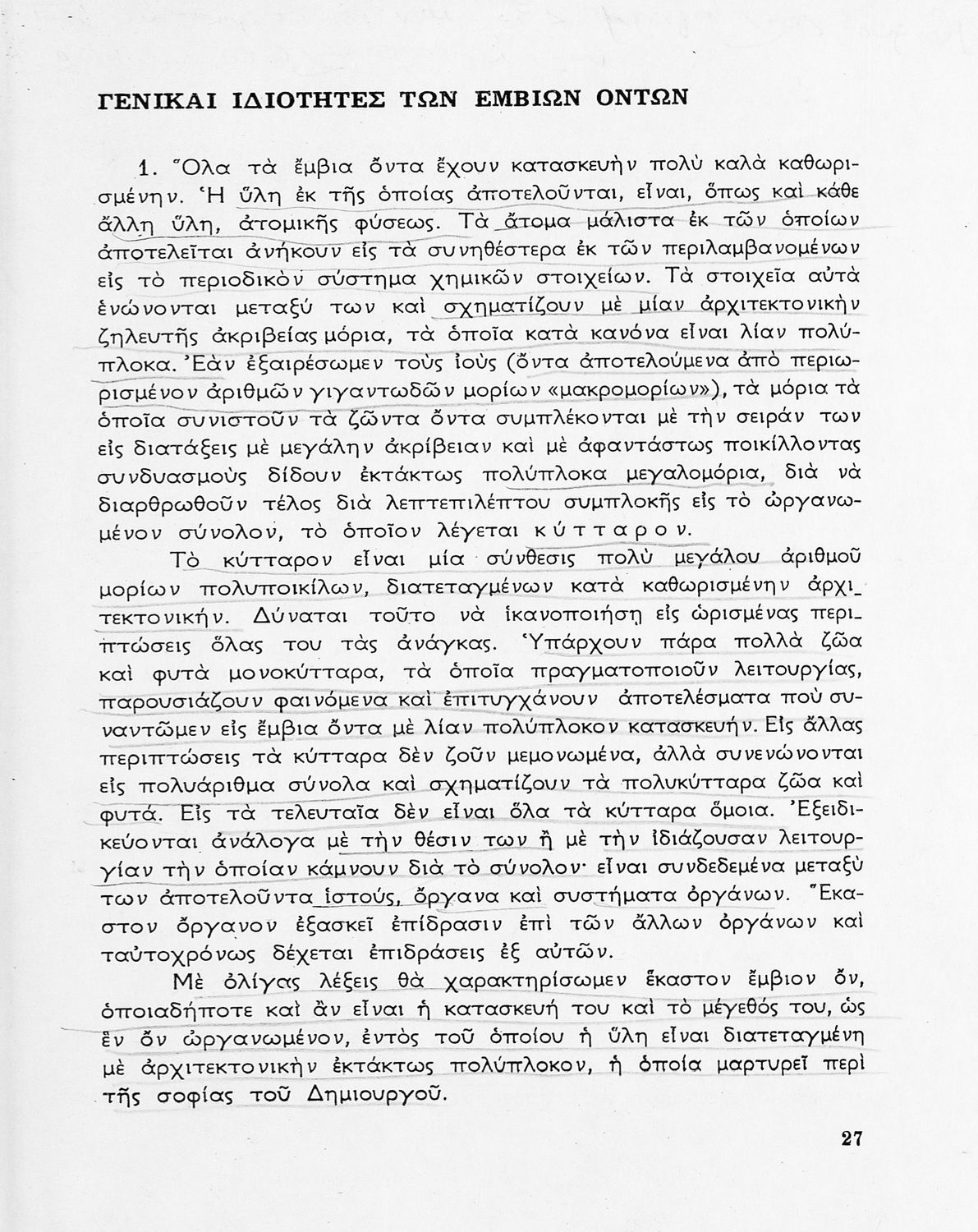 Παρουσίαση περιεχομένου: Σχολικό εγχειρίδιο Βιολογίας ΣΤ΄ Γυμνασίου που εστιάζει στις συνθήκες γέννησης, μεταβολής και θανάτου των έμβιων οργανισμών. Φέρει το σύμβολο της δικτατορίας. Ο συγγραφέας ήταν υφηγητής του Πανεπιστημίου Αθηνών.
