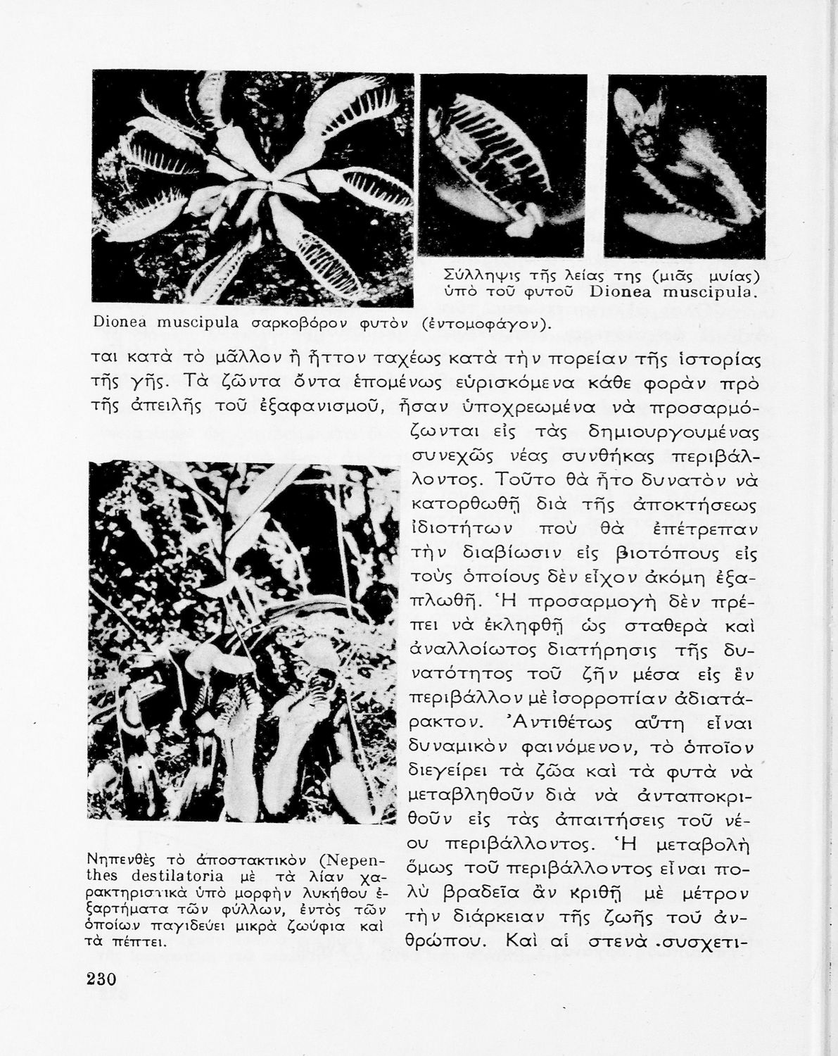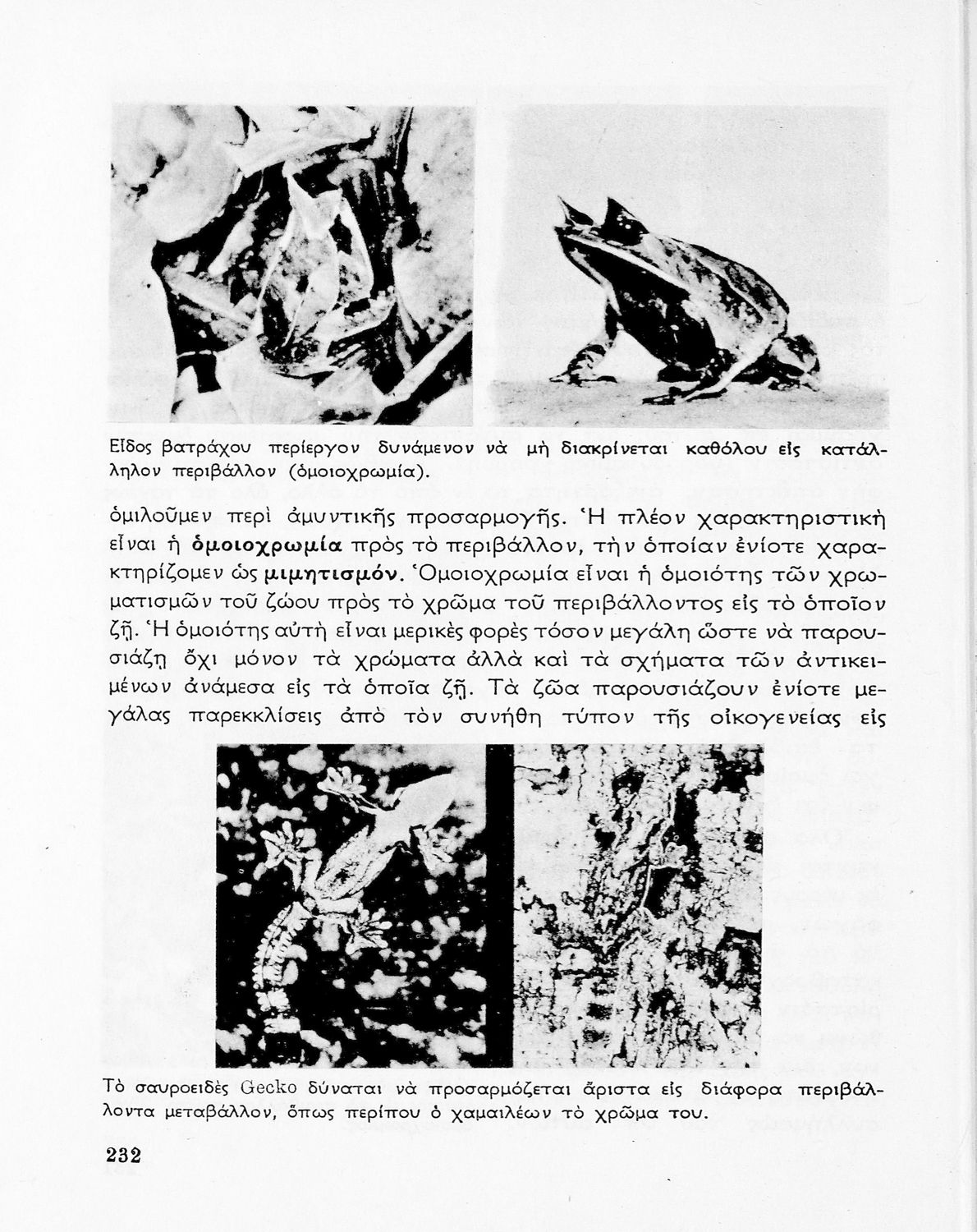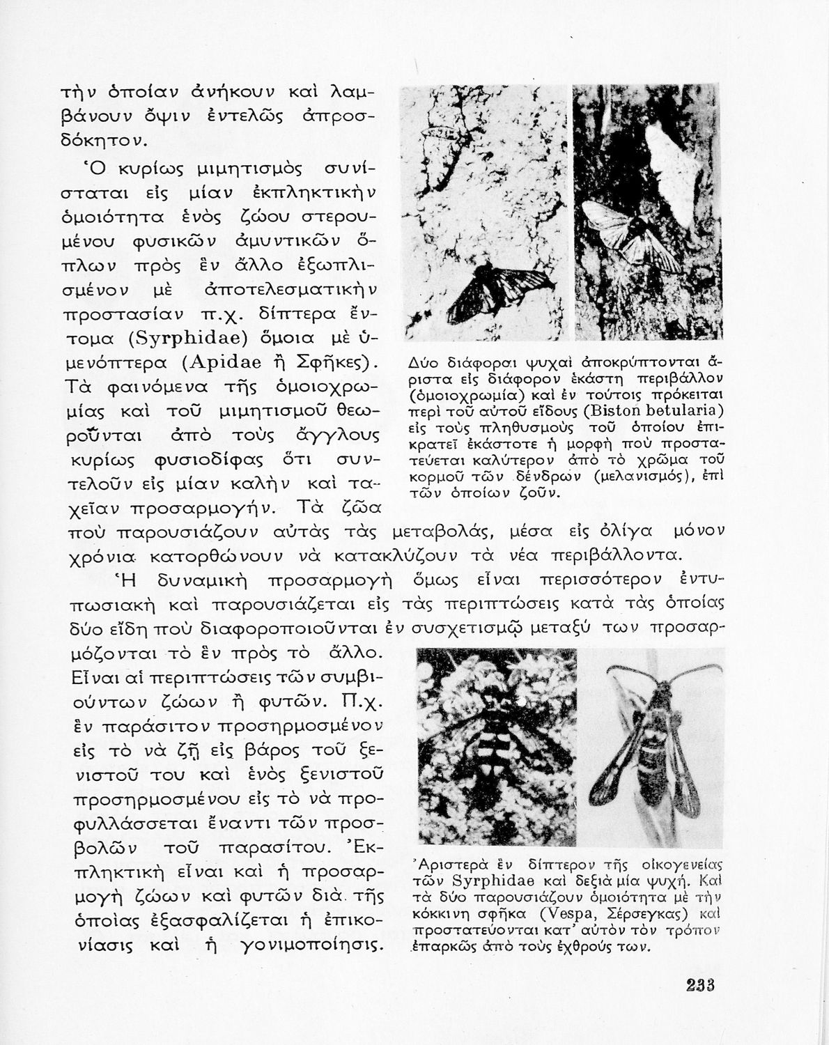 Σχολικό εγχειρίδιο Βιολογίας ΣΤ΄ Γυμνασίου που εστιάζει στις συνθήκες γέννησης, μεταβολής και θανάτου των έμβιων οργανισμών. Φέρει το σύμβολο της δικτατορίας. Ο συγγραφέας ήταν υφηγητής του Πανεπιστημίου Αθηνών.